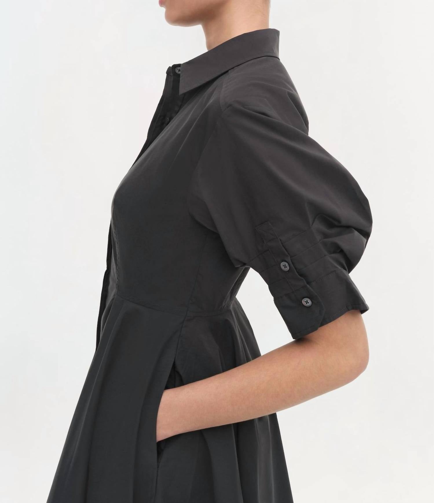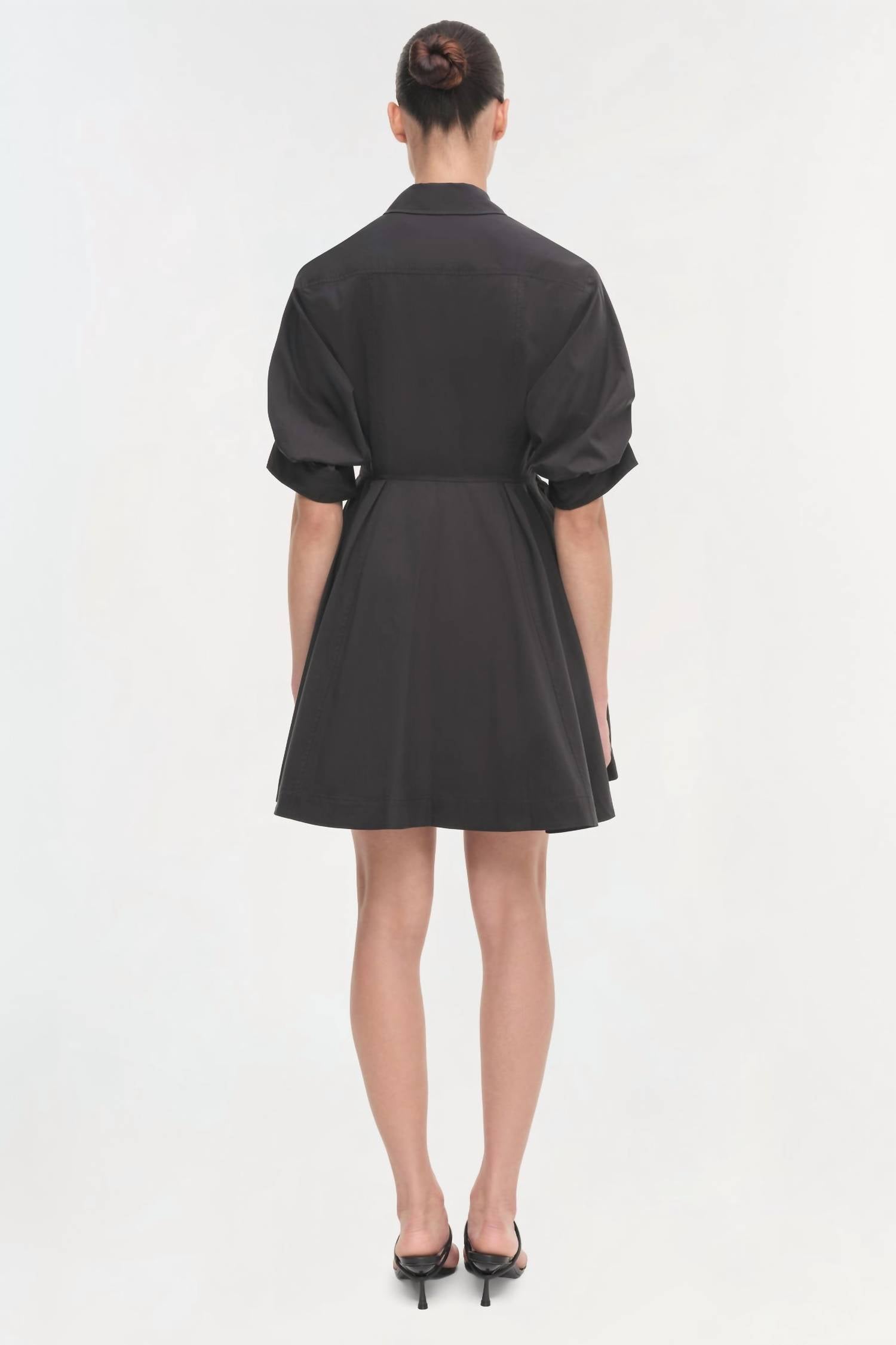 A short and breezy dress for those warmer days. Elevate your wardrobe with the SIMKHAI Jazzie Mini Dress, a sophisticated choice in timeless black. This A-line dress features elbow-length sleeves and a stylish collar, crafted from a blend of 63% cotton and 37% polyester for a comfortable fit. Designed with practicality in mind, it includes button front closures and functional pockets. Care is easy with a cold machine wash, allowing you to maintain its chic look effortlessly. The fully imported Jazzie Mini Dress showcases a solid pattern, perfect for making an understated yet elegant statement. Model is 5'10" and wearing size 2.