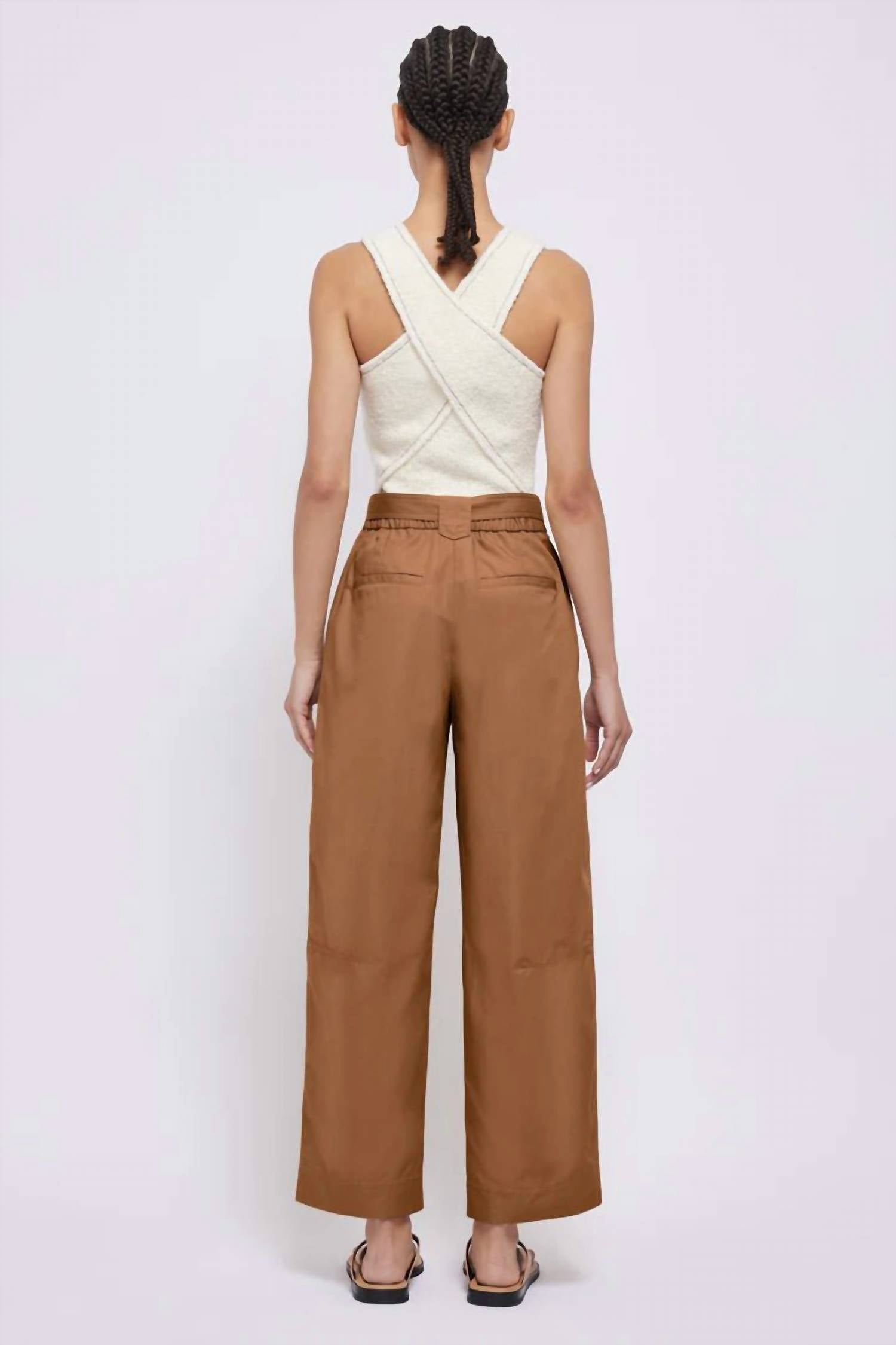 Elevate your wardrobe with the Jenny Belted Cropped Pant by SIMKHAI, presented in a rich Hickory hue. These ankle-length trousers feature a high-rise waist and a wide-leg silhouette, offering a relaxed fit that flatters every figure. Crafted from a cotton blend with a composition of 98% cotton and 2% spandex, they promise comfort and flexibility. Finished with a zip fly closure, this imported piece is designed for effortless sophistication. Care: Dry clean only. Model is 5'11" and is wearing a size 2, highlighting the pant's polished aesthetic.