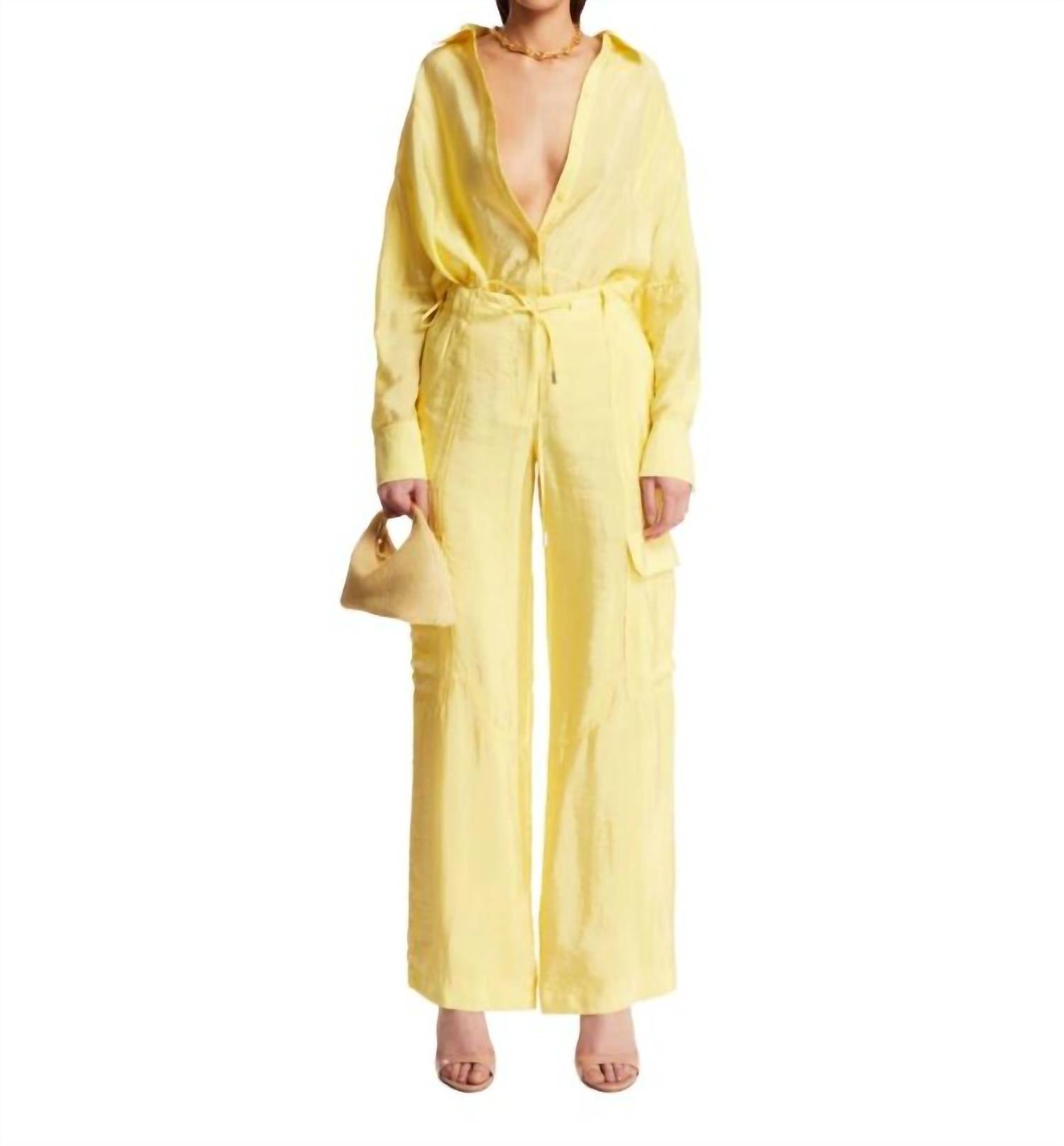 This button down shirt is comfortable yet polished. Embrace subtle sophistication with the SIMKHAI Yellow Laylah Shirt, an ideal choice for spring travel. This women's solid yellow button-down features long sleeves and a classic collar, complemented by buttoned cuffs and dropped shoulders. It's crafted from a luxurious blend of rayon and tech fabric, with a chic rounded asymmetrical hem for added flair. Closure: Button closure. Model is 178 cm and wears a size S.