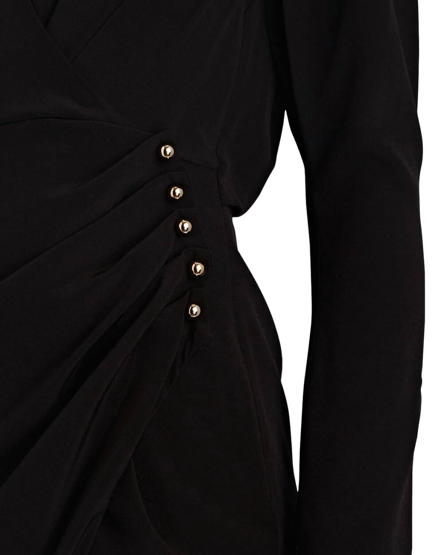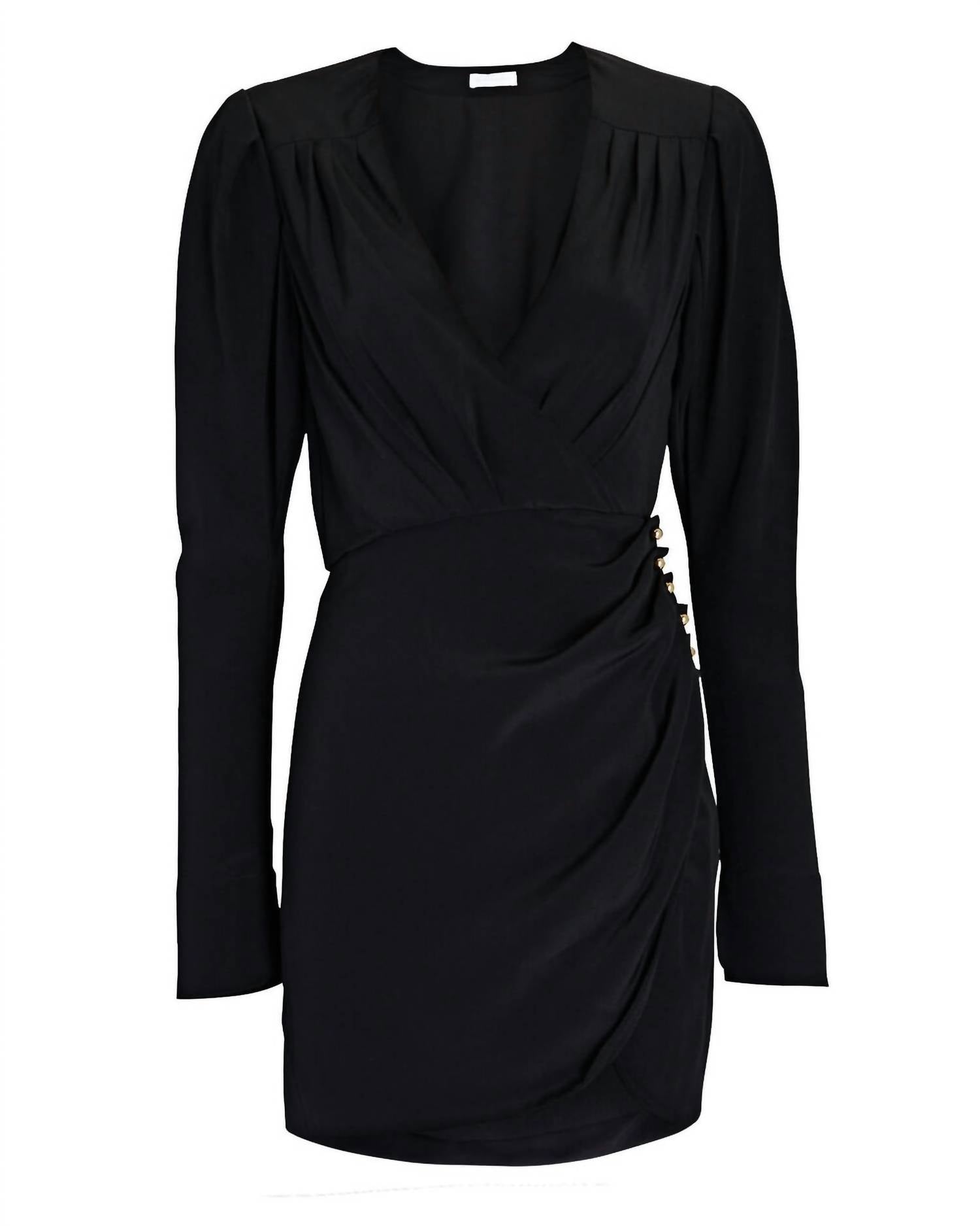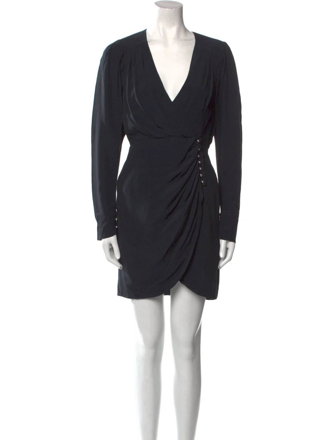 Unveil a sophisticated look with the Leilani Stretch Long Sleeve Mini Dress by SIMKHAI, a striking piece in timeless black. Crafted from 100% viscose with a chic wrap detail, this mini dress features a plunging V-neckline that adds allure to its long sleeves. The hem gracefully hits mid-thigh for a flattering silhouette, with a convenient hidden side zipper closure for effortless wear. For upkeep, remember this piece requires dry cleaning care. Length: 34 inches.