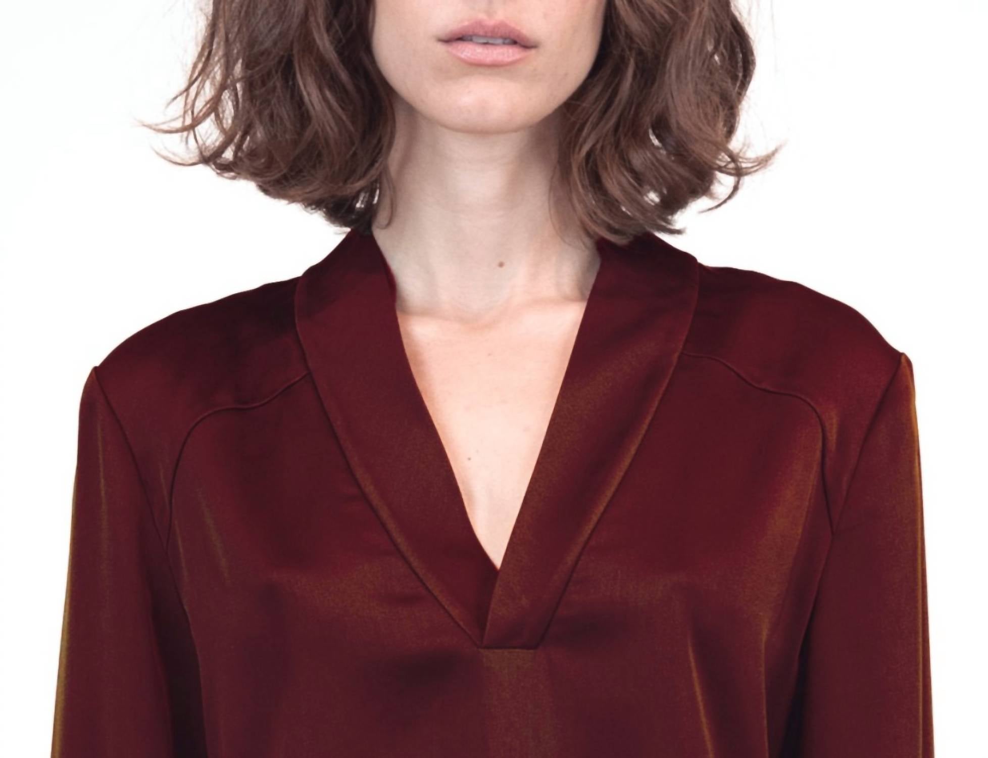 A long sleeve top you can wear with denim, skirts, well... just about anything! Elevate your wardrobe with the Maisey V-neck Blouse by SIMKHAI, a striking piece in rich Oxblood Red. This solid long sleeve top features a detailed ruffle at the wrist for a touch of sophistication. Closure: Pull on. Care: Dry clean only.