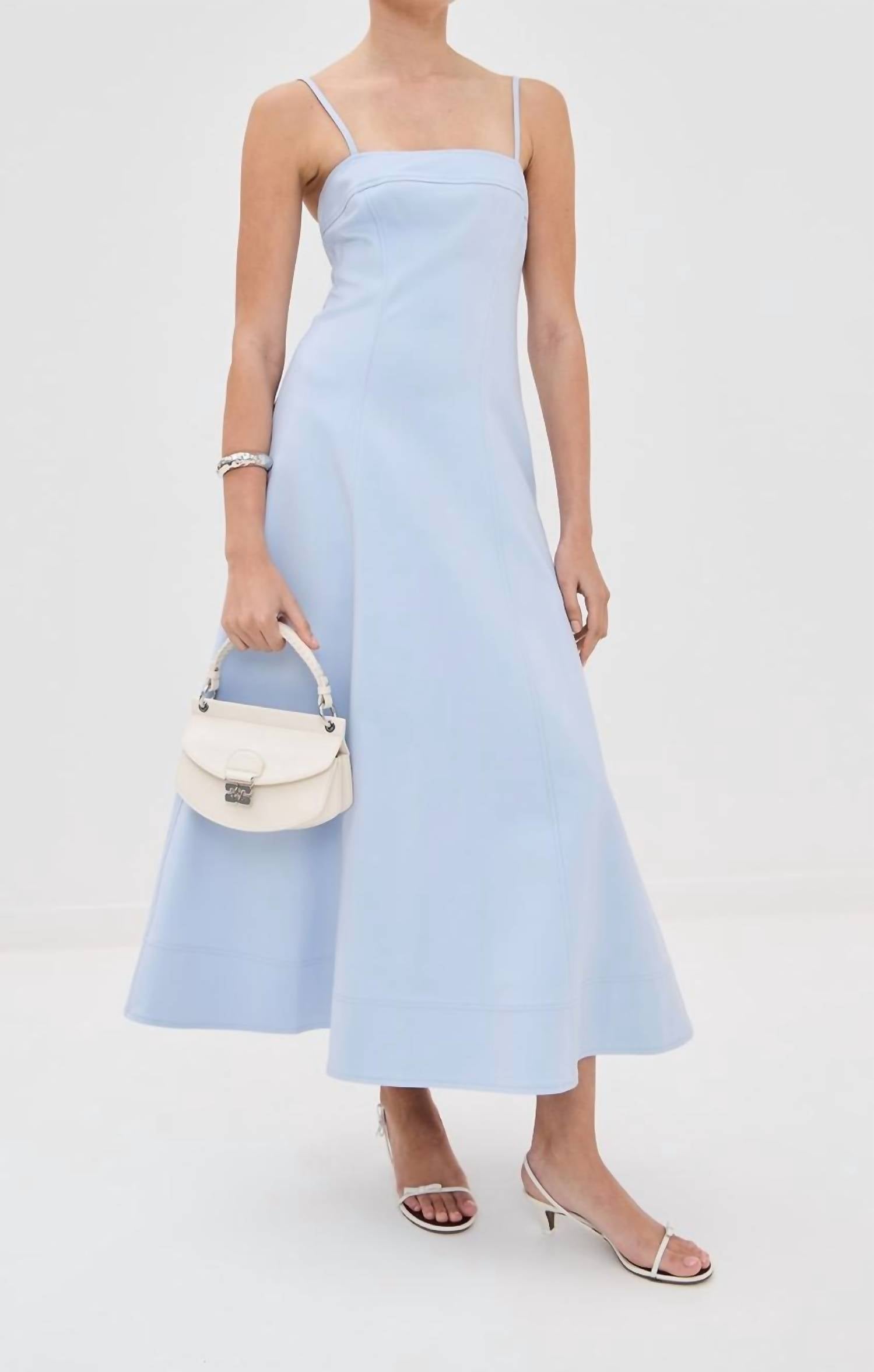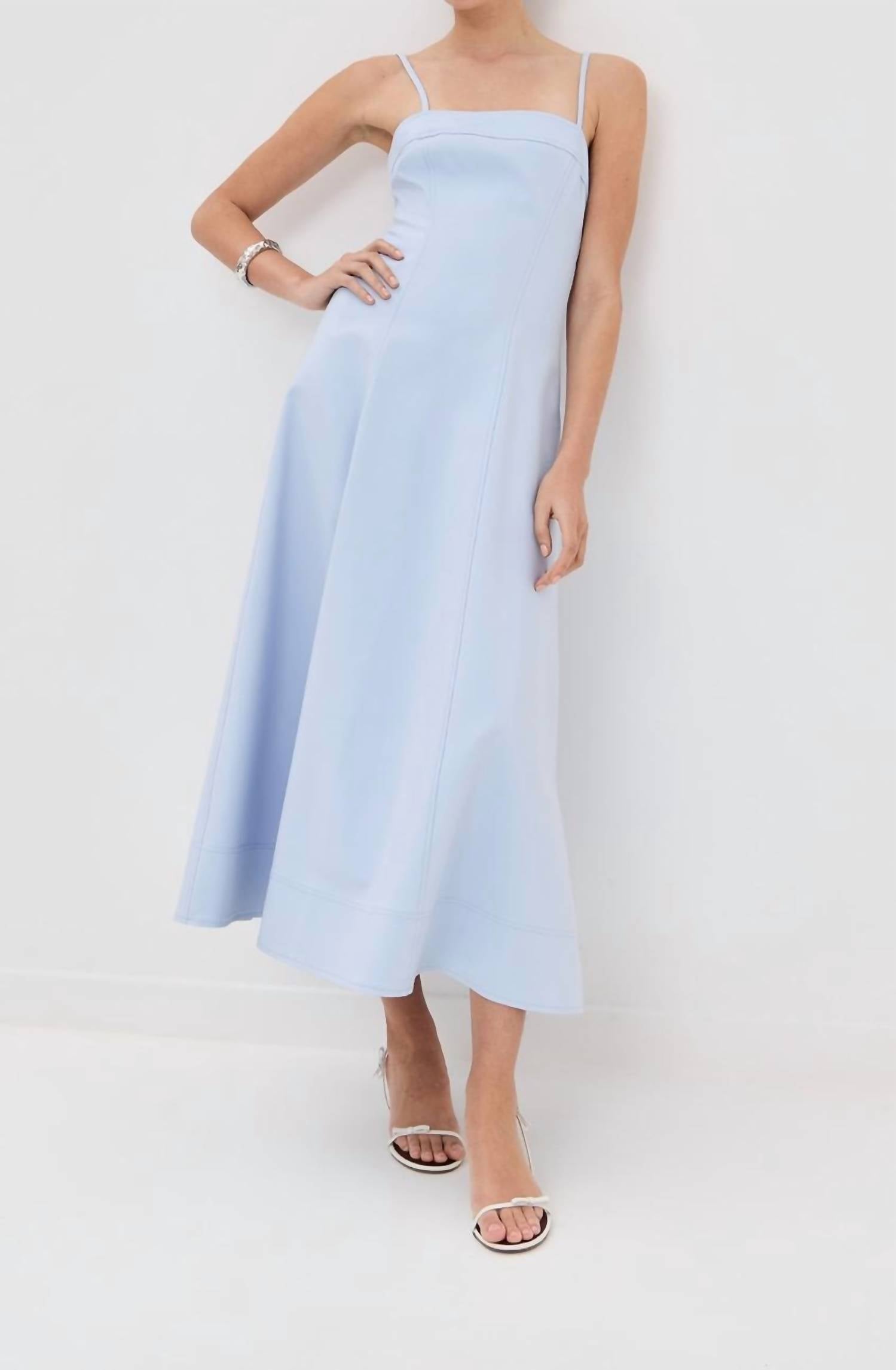Just add slides or mules and you are good to go. Introducing the Marisol Sleeveless Midi Dress by SIMKHAI, a stunning piece in periwinkle sky perfect for any cocktail party. Crafted with spaghetti straps and a square neckline, this dress boasts a flattering A-line silhouette. Made from a heavyweight stretch poplin, the composition includes 51% cotton, 46% nylon, and 3% elastane, with a polyester lining for added comfort. Featuring a hidden zip closure at the back, it is produced in China and is best maintained with dry cleaning. Garment length is 51.25 inches.