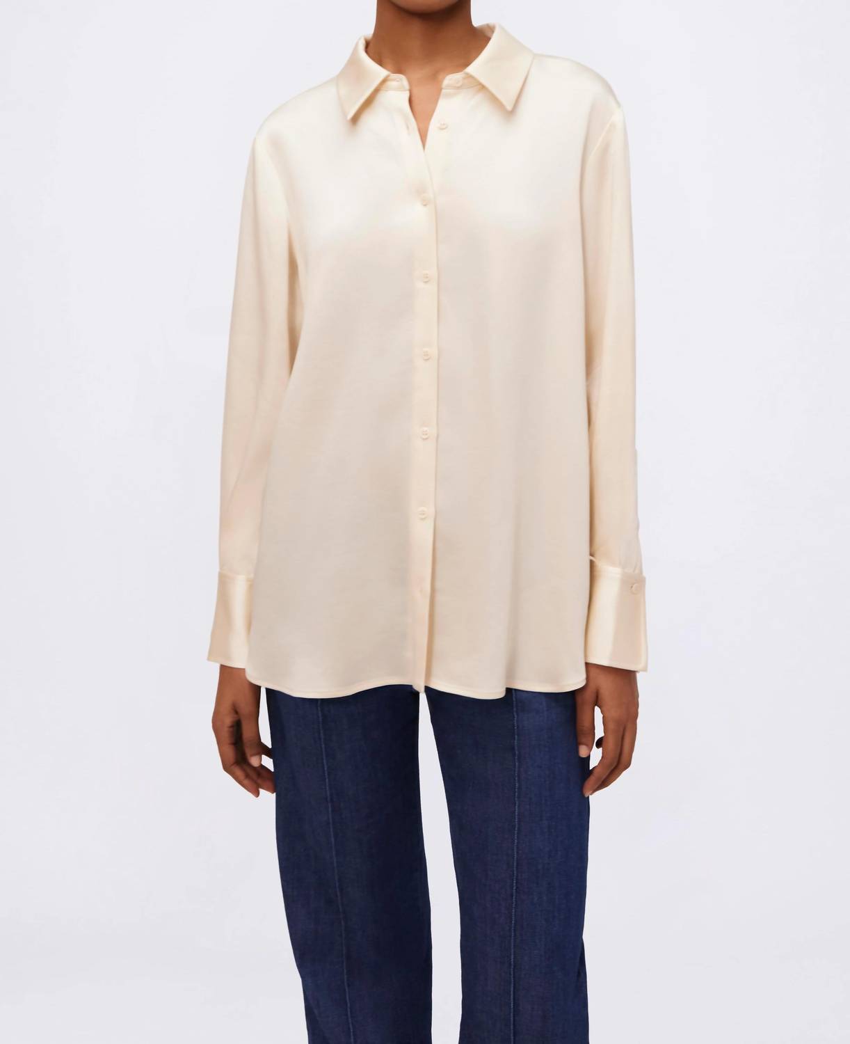 Presenting the Olsen Top by SIMKHAI, a sophisticated button-down in an elegant Ecru Map shade. This long sleeve design offers a stunning silhouette crafted from 89% Acetate and 11% Polyester. Originating from China, it features a button closure for a polished finish. Care instructions: Dry clean only. Model is wearing a size small.