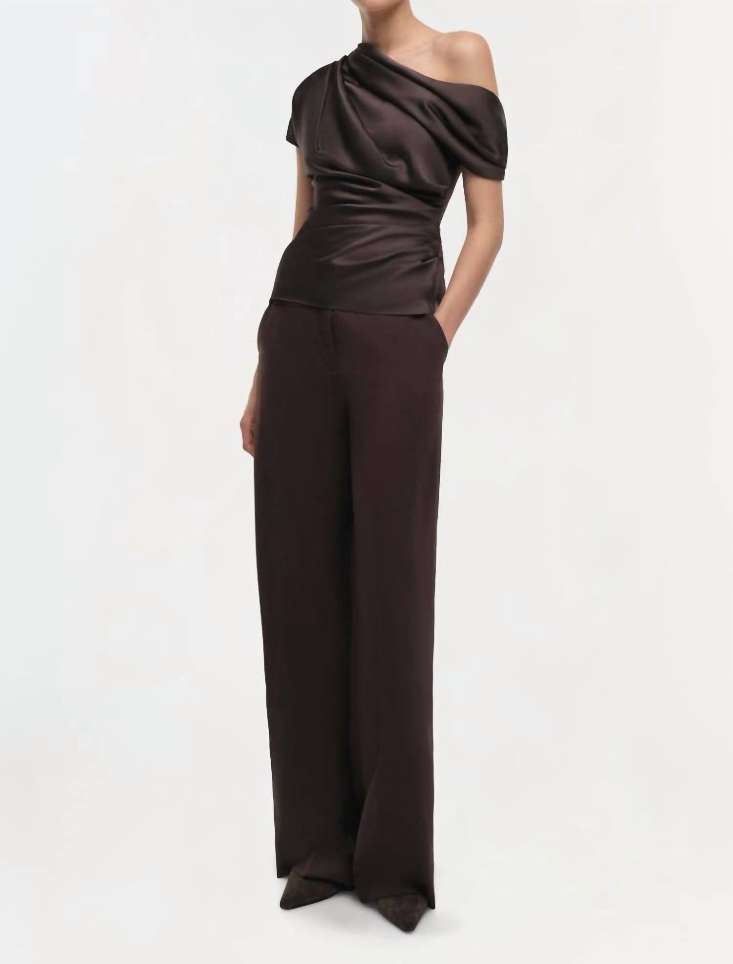 Pair this with your favorite jeans and slides for your next girls night out. Introducing the Phoebe Draped Top by SIMKHAI, a sophisticated choice for your workwear collection in a rich chocolate hue. This sleeveless blouse is crafted with a luxurious blend of 89% Acetate and 11% Polyester for the shell, and lined with 100% Polyester. It features a chic off-the-shoulder neckline and a convenient side zipper closure. Care for this elegant piece by dry cleaning only.