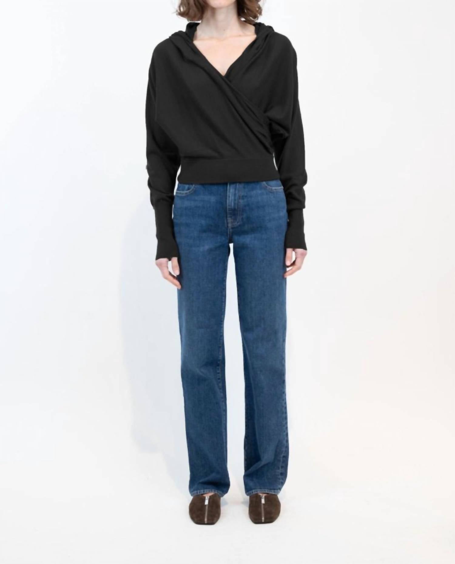 Cozy fabric, impeccable design - Meet the sweatshirt that you'll never want to take off. Introducing the SIMKHAI Riley Wrap Hoodie, a chic and versatile piece crafted from 100% Merino wool. This solid black, feminine wrap-hoodie features long sleeves with fitted wrists and thumb holes, perfect for elongating your silhouette. Made for women, its pull-on design and hooded neckline make it both stylish and comfortable. Indulge in cozy elegance with the Riley Wrap Hoodie, a perfect addition to your wardrobe essentials.