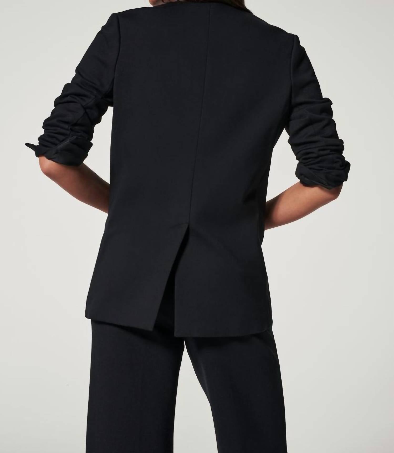 Tailored to perfection, this blazer will be your go-to jacket for years to come. Smoothing premium ponte fabric. 4-way stretch. Functional pockets. Relaxed fit. No need to dry clean. Body: 68% Rayon, 28% Nylon, 4% Elastane. Lining: 95% Polyester, 5% Elastane. Machine wash cold.