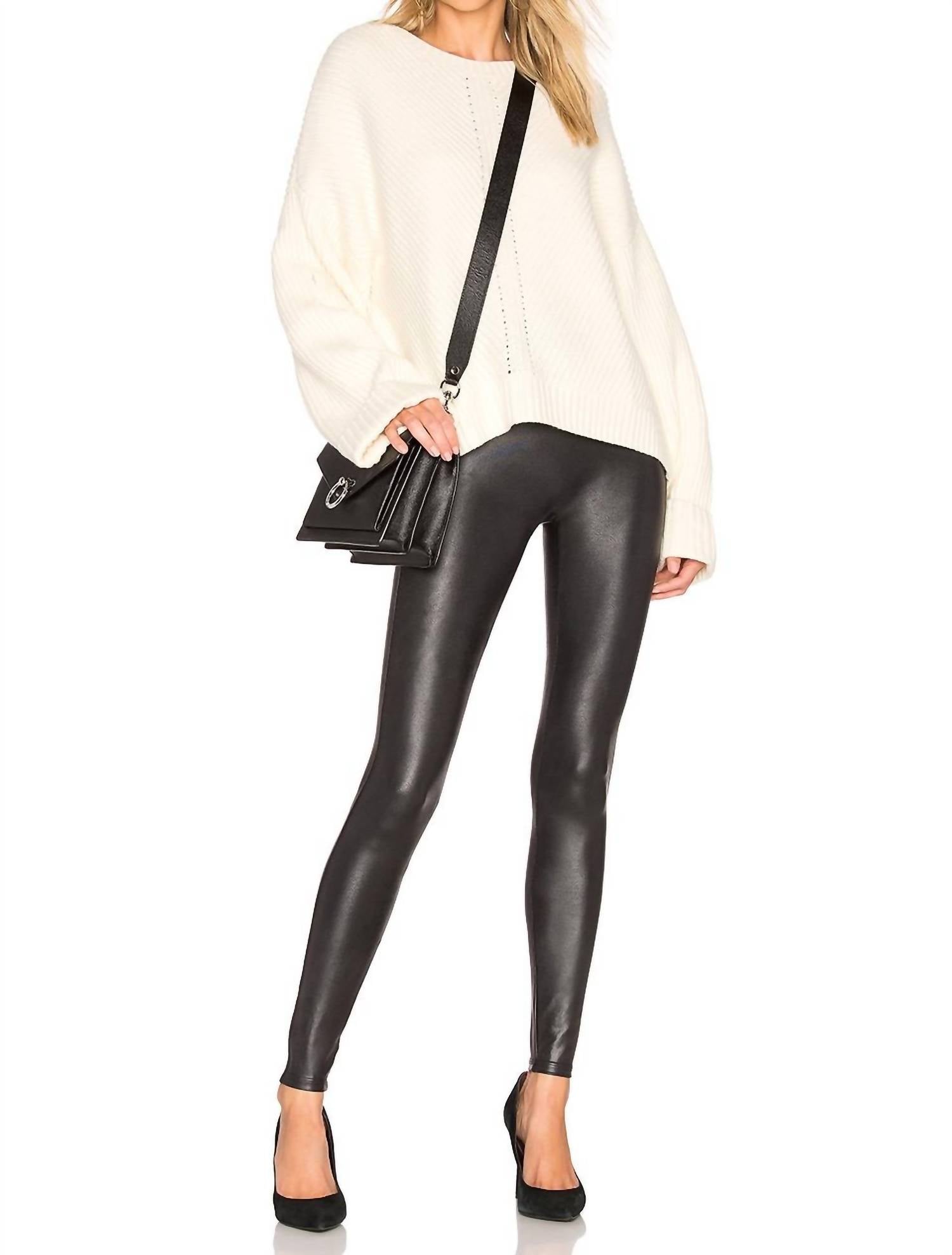 Leggings you can dress up or down for any occasion. Elevate your wardrobe with the Spanx Faux Leather Leggings in sleek black, offering a high-waisted design perfect for both style and comfort. Made from a blend of 87% nylon and 13% spandex for the self, with a combo of 80% nylon and 20% spandex, these leggings provide a contoured power waistband for core compression while eliminating the center seam for a smooth look. Expertly crafted in Vietnam, they measure an 8" rise with a 26" inseam and feature a pull-on closure for ease of wear. Care instructions include machine washing and laying flat to dry, ensuring easy maintenance.