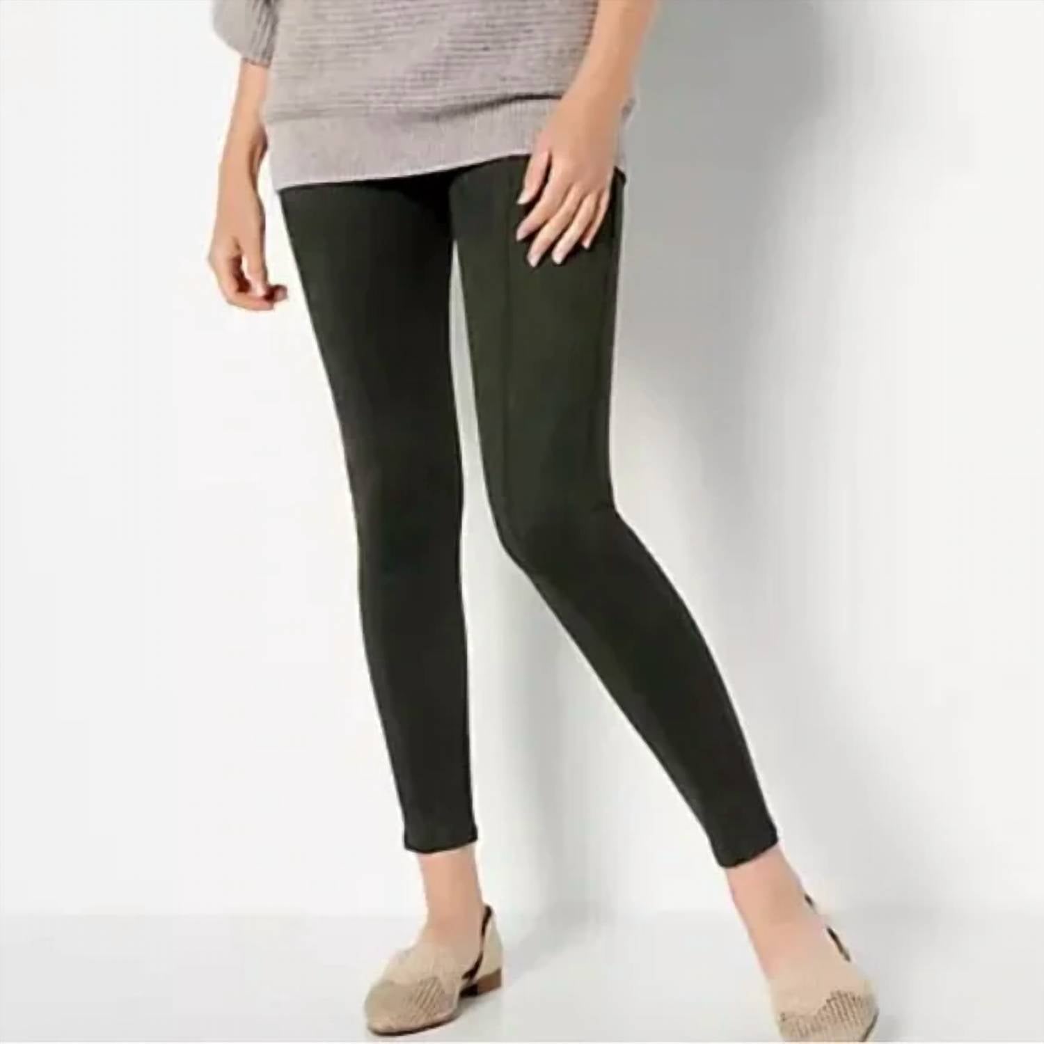 Leggings you can dress up or down for any occasion. These faux-suede leggings combine style and comfort with a flattering, body-hugging fit. Designed with hidden tummy-shaping technology, a bulk-free finish, and strategically placed seams, they offer a smooth silhouette that's perfect for dressing up or down. The high-rise waist and slim leg design provide a sleek look through the entire leg. Made from a soft, stretchy blend for all-day wear, with a 27" inseam.