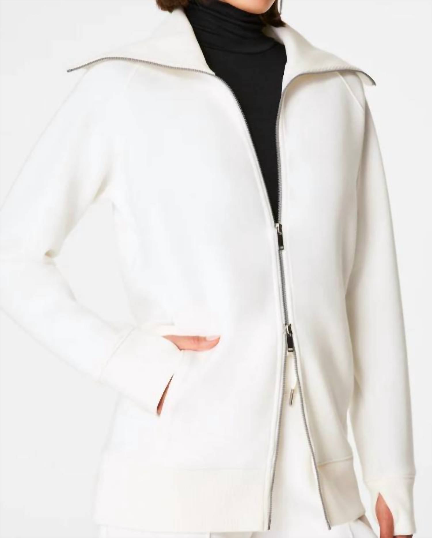 A perfect addition to any wardrobe, this classic tunic style blouse is flattering and effortless. You can easily transition from desk to dinner in this chic top. Meet the Spanx HeavyAir Full Zip Tunic Jacket in Very Black, an ideal blend of sophistication and comfort. This tunic features long sleeves with convenient thumbholes, designed in a longer length that is perfect for layering. Crafted from a plush blend of 48% Polyester, 45% Tencel™ Modal, and 7% Elastane, it has a stylish collar and ribbed trim. Closure: Dual zip front closure for customized style. Care: Machine wash and tumble dry.