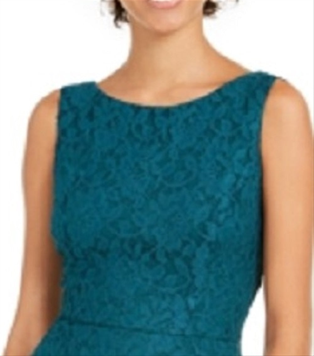 Scoop neckline|Back zipper closure|Sleeveless|Deep V back|Allover lace|Fit-and-flare silhouette|Lined