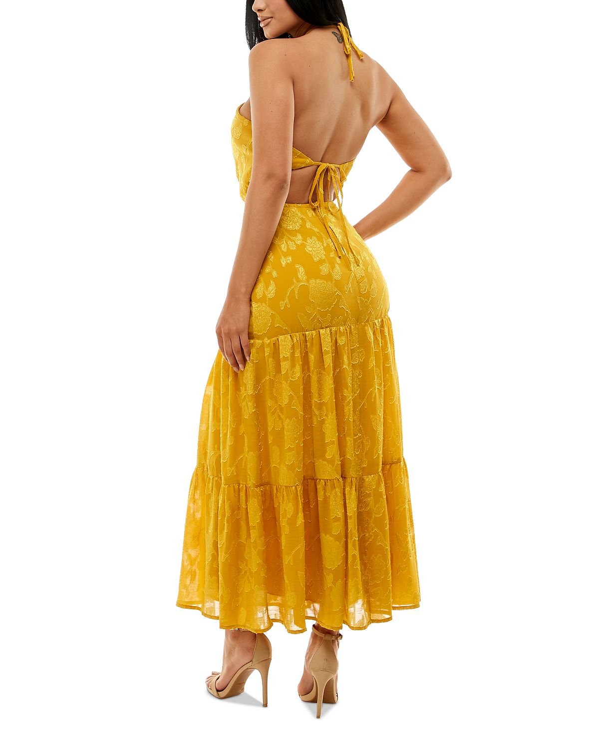 Own the floor in this flirty halter dress from Speechless.| Approx. 37-1/4 long from center back neck to hem. Length is based on size 7 and varies 5/8 between sizes| Chiffon; Smooth| sheer woven fabric| Halter neckline| Ties at neck and back; zipper closure at back| Textured burnout design; cutaway shoulders; open-back detail; tiered at skirt