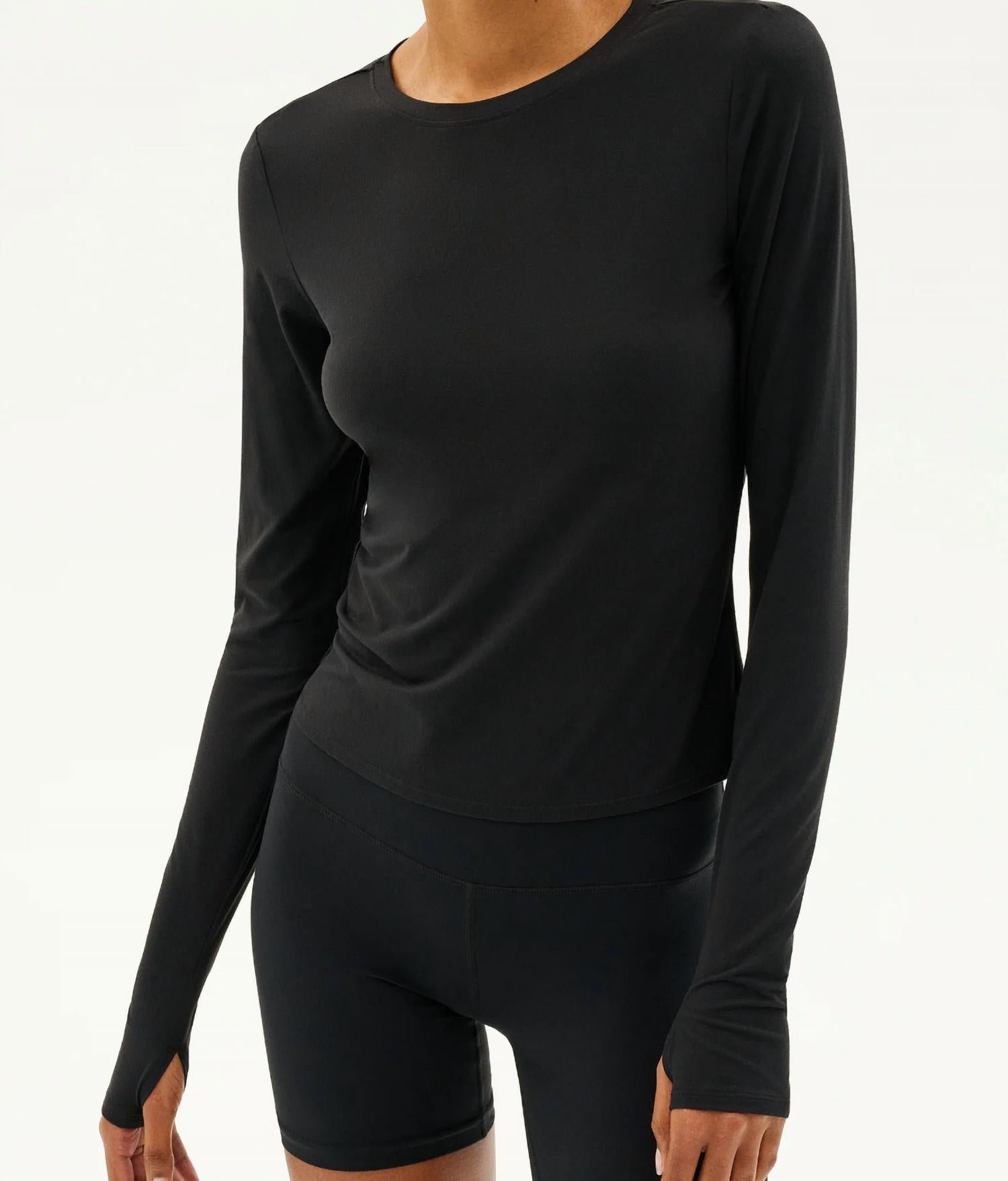 A long sleeve top you can wear with denim, skirts, well... just about anything! Meet the Airweight Lite Long Sleeve Top by SPLITS59, an essential for athleisure lovers and fitness enthusiasts. Crafted from a lightweight blend of 81% nylon and 19% spandex, this solid black tee promises quick-drying capabilities to support intense workouts. It's designed with a crewneck and a pull-on closure, making it a convenient choice for various activities, from running to spin class. For care, simply machine wash this versatile piece, ideal for cold-weather styling or layering.