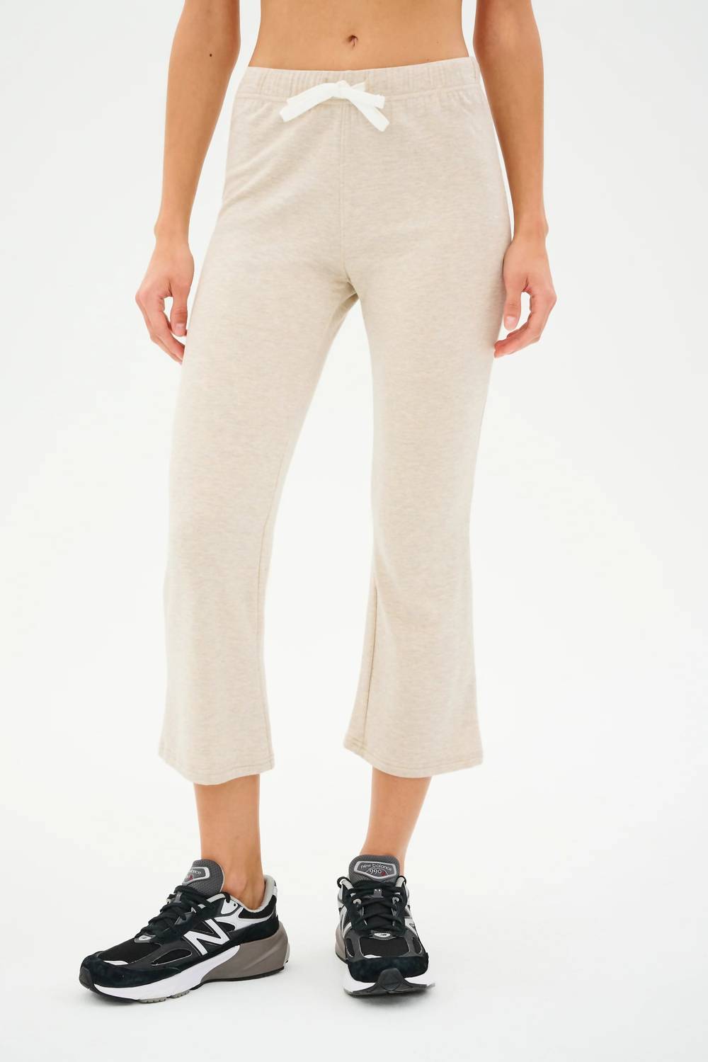 Slightly flared pants are all the rage right now and these are no exception. Pair these with your favorite tee for a more casual look, or with your favorite button-up blouse for an evening out. Experience ultimate comfort with the Brooks Fleece Cropped Flare Pants by SPLITS59, designed for women who appreciate style and ease. These beige pants offer a mid-rise with a regular fit and flared leg, featuring a tie closure for a personalized fit. These solid, athleisure pants are made in Los Angeles, emphasizing sustainability while being perfect for fitness, workouts, or simply lounging. Ideal for spring, they effortlessly blend "comfy casual chic" with performance needs.