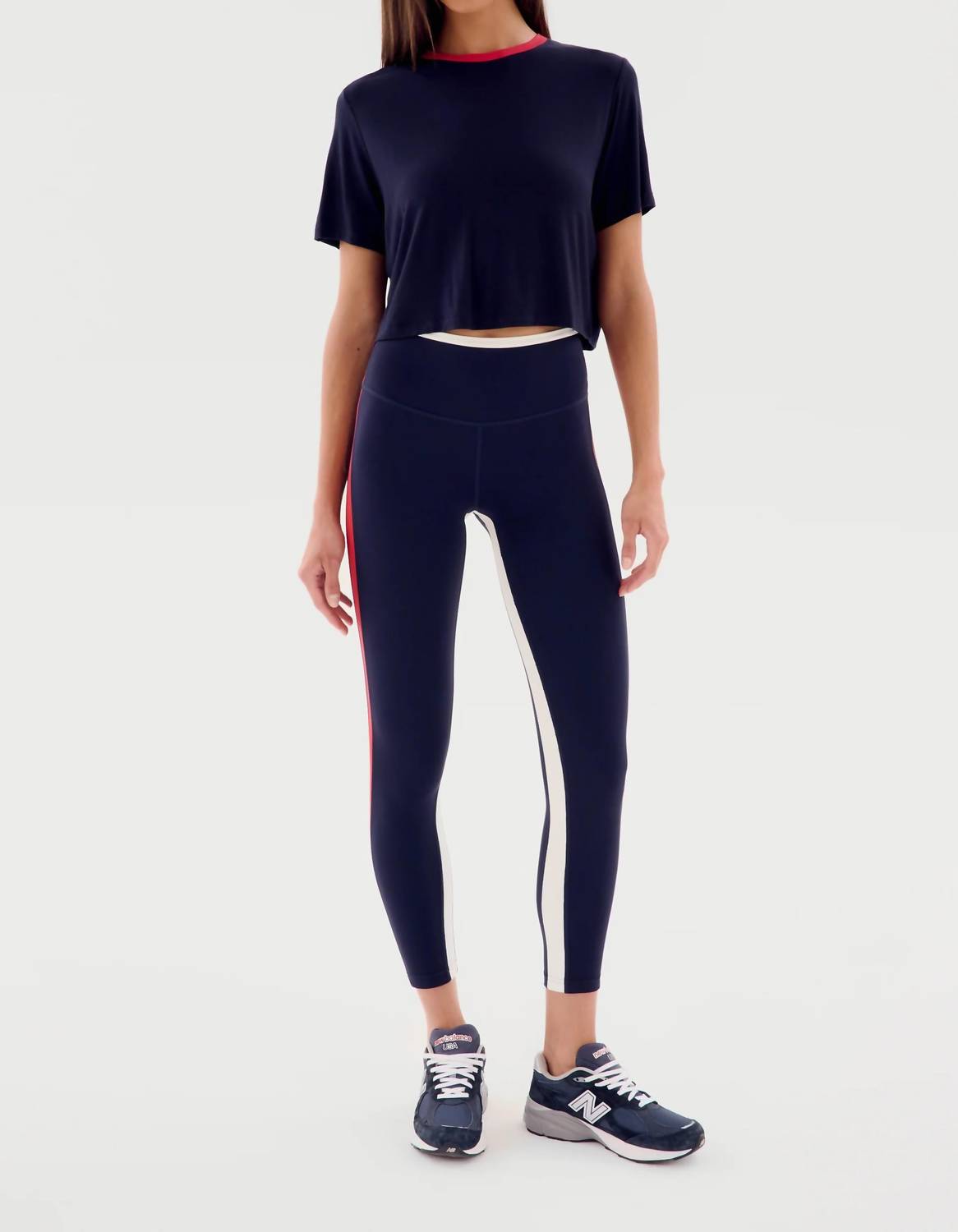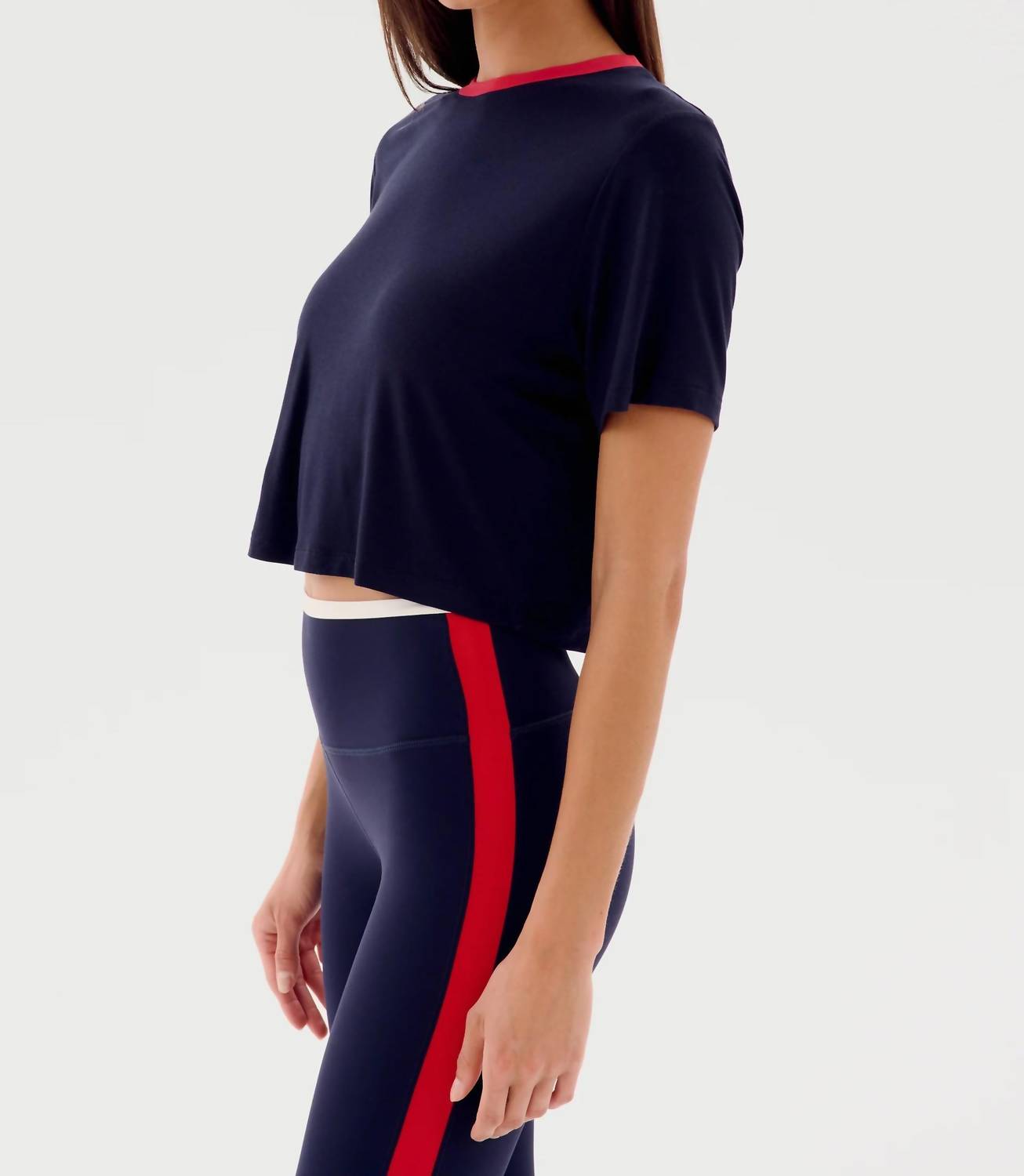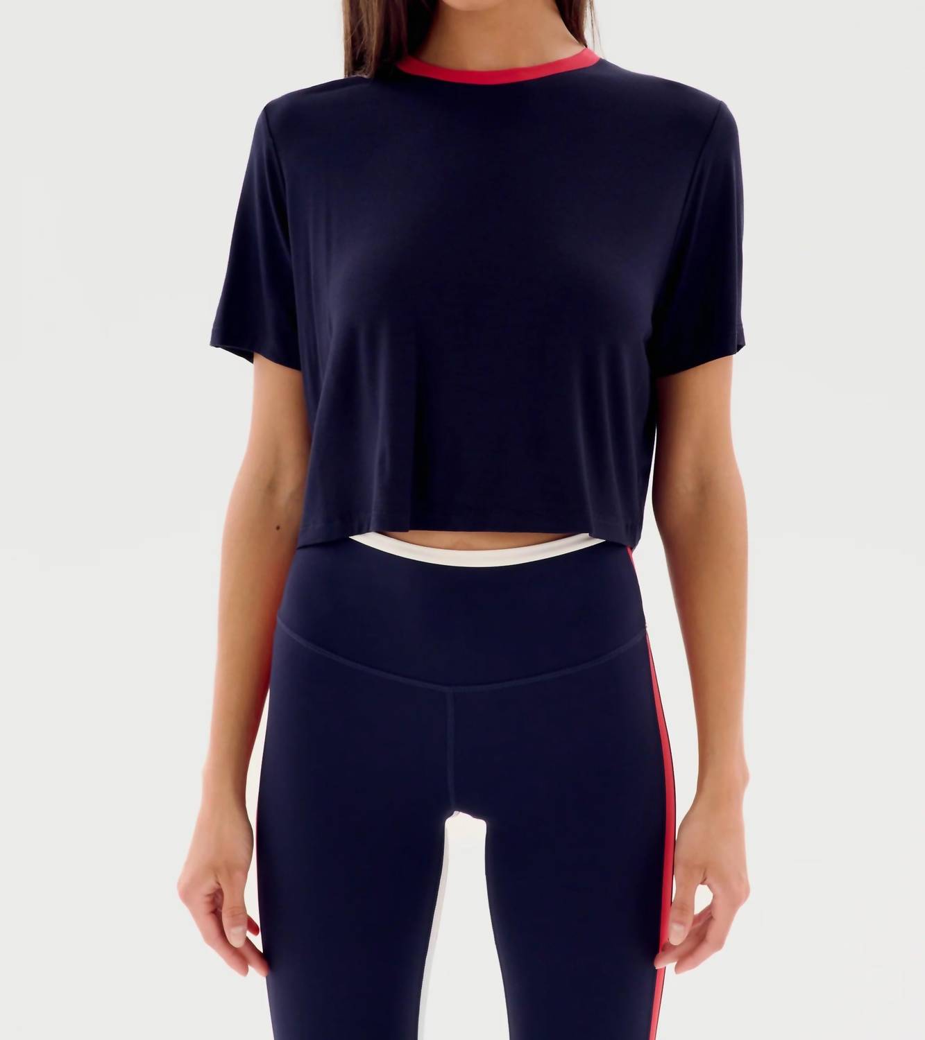 Pair this crop top with your favorite high-waisted jeans or maxi skirt. Elevate your workout wardrobe with the Djuna Crop Ringer Top by SPLITS59, defined by its eye-catching blue and red colorway. This women's activewear piece features short sleeves and a comfortable crewneck, crafted from a breathable viscose blend for superior performance. Designed with a relaxed fit, the pull-on crop top is perfect for activities like running, CrossFit, and Pilates. Care is easy, just machine wash and lay flat to dry, ensuring it remains your go-to choice for any high-energy workout.