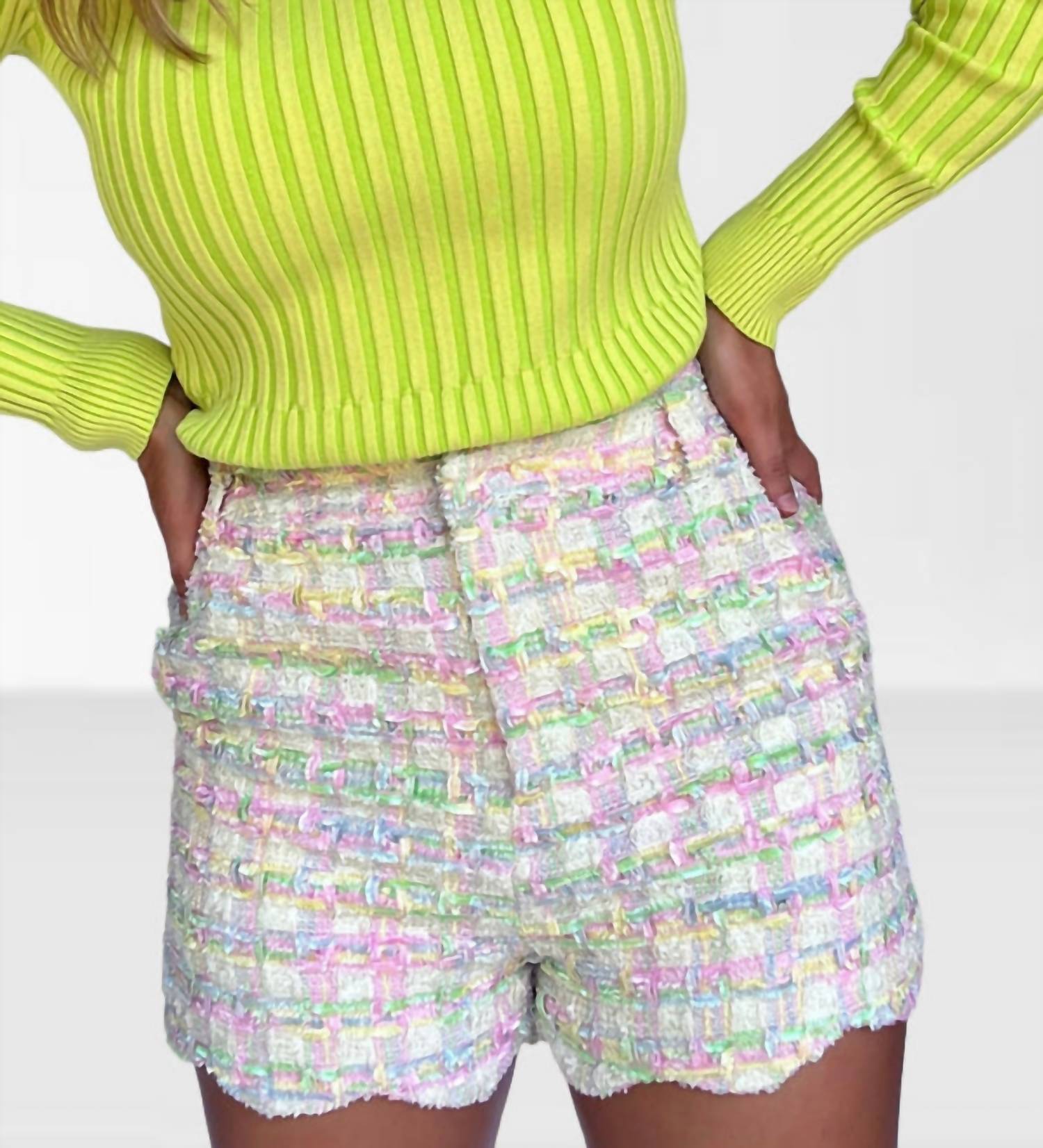 Elevate your wardrobe with the Pastel Tweed Shorts by STORIA, a vibrant addition perfect for any occasion. Crafted from a blend of 48% Acrylic, 36% Polyester, and 16% Nylon, these shorts feature a chic pastel multi-color pattern that captures attention. Enjoy the stylish plaid and check design, complete with the practicality of pockets and a secure zip closure. Please note: care instructions not provided.