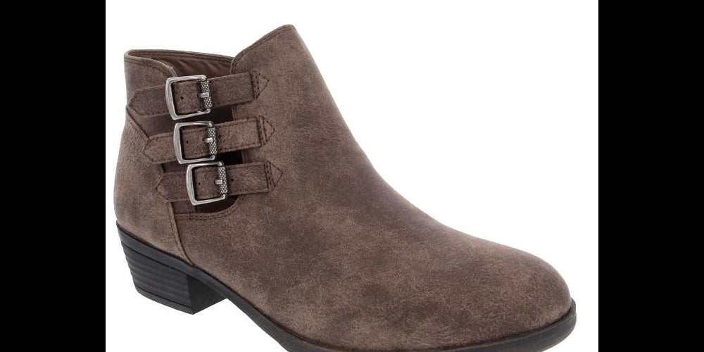 Classic short bootie with side buckle details. Soft man made material for everyday casual or dressy wear.| 1/2 heel height| Shaft Height; 2 1/2| Circumference; 12. Measured on a size 6M| Side zipper| Memory foam cushioning| cool and breathable manmade material lining upper