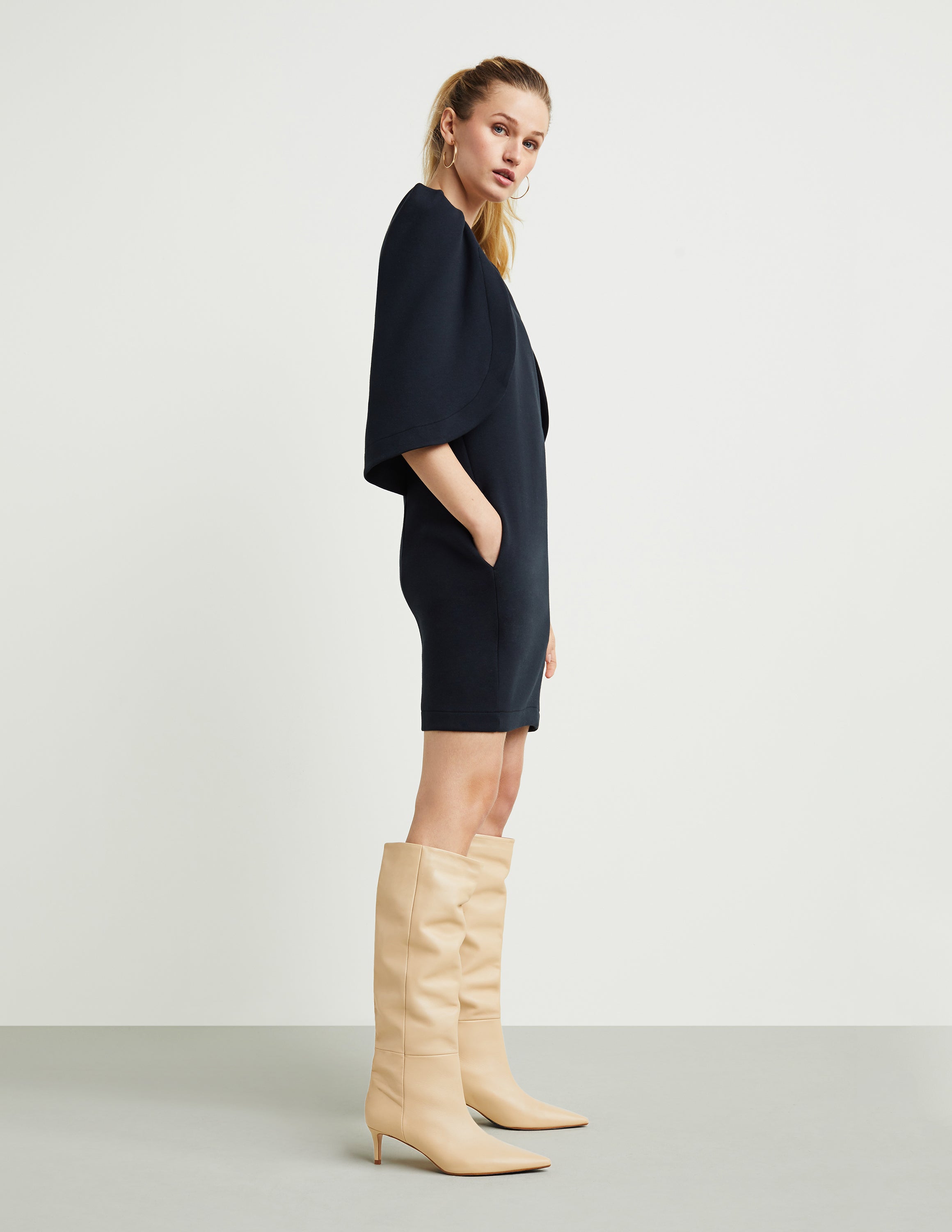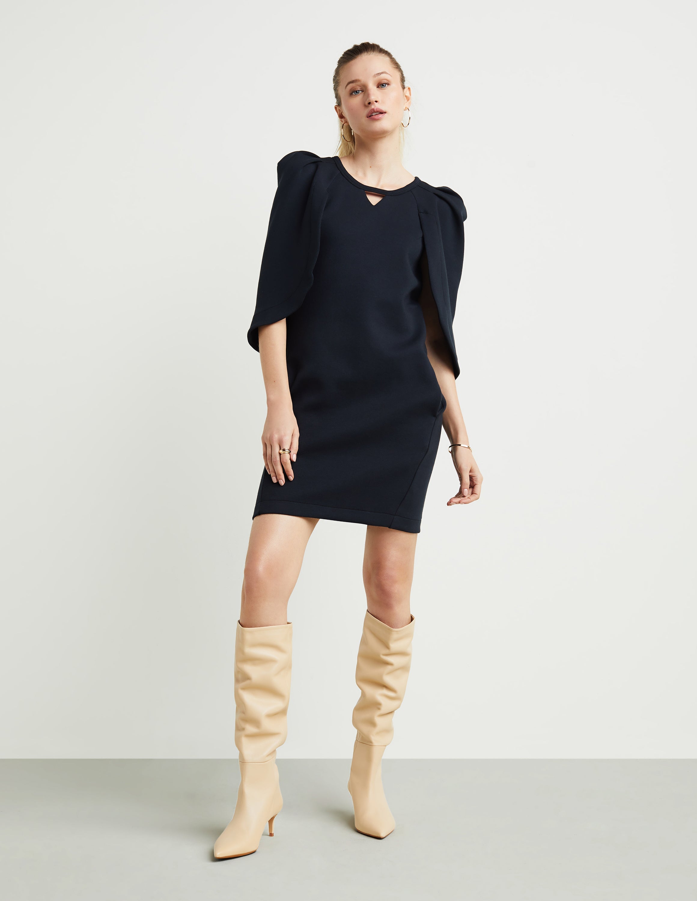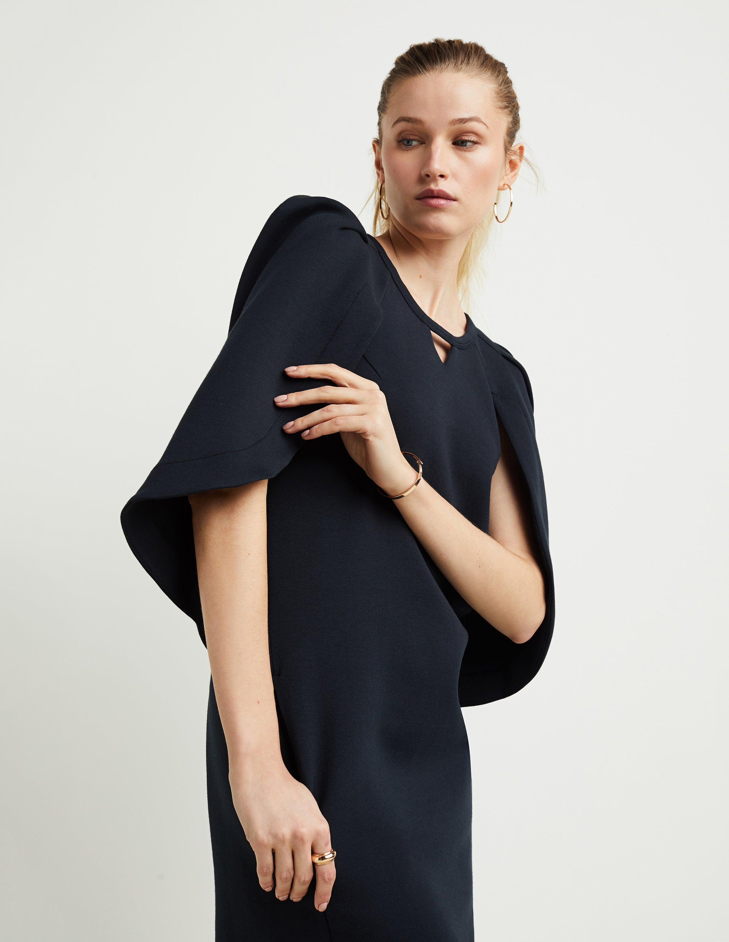 Even heroes have to wing it sometimes. The power of the perfect cape dress shouldn’t be relegated to the red carpet. Terry-like fabric takes down the formality a level, so this short shift feels comfortable everywhere from brunch to the boardroom. Broad shoulders set up a flattering silhouette, with convenient hip pockets to punctuate your power walk.