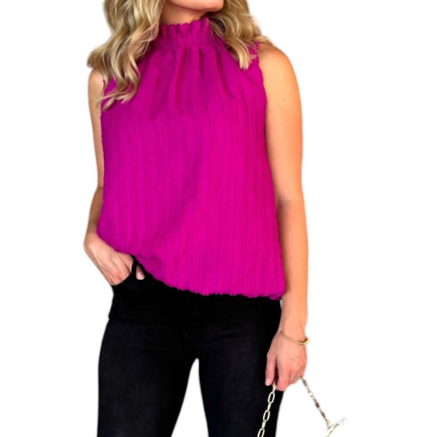 Fit, fabric and functionality. This tank top checks all the boxes. Introducing the Brandy Top by THML, a stylish choice in a playful pink hue designed to elevate your wardrobe. This women's tank top features a unique textured design and a contemporary mockneck, all crafted for a distinct, modern look. With its sleeveless, pull-on design, it ensures ease and comfort. Care is simple with machine wash instructions and lay flat to dry.