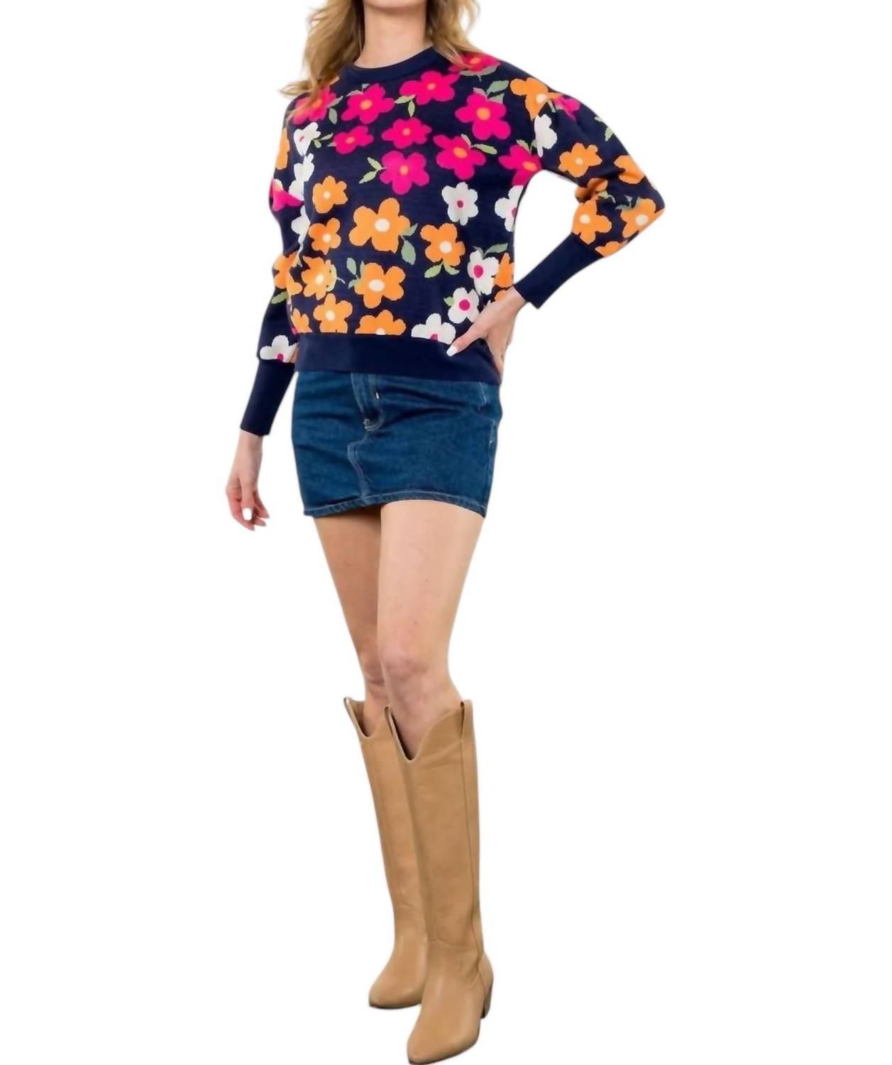 Introducing the Bridget Sweater by THML, a vibrant navy blue piece adorned with cheerful floral details for a fresh, stylish look. This women's sweater features a classic crewneck design, perfect for transitioning into the autumn season. Designed without pockets and closures, its simplicity is its charm. Embrace the changing weather with this must-have addition to your wardrobe.