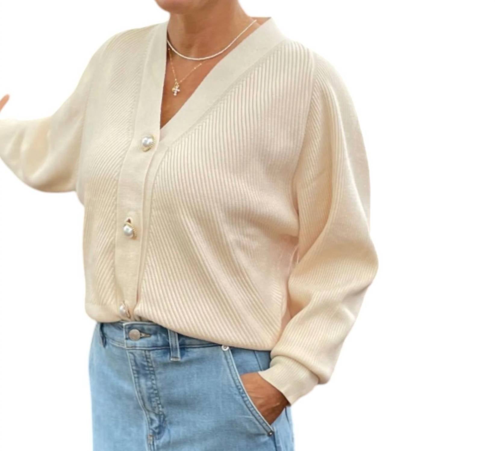 A timeless v-neck sweater that works season after season. Introducing the Camilla Sweater by THML, a sophisticated addition to any wardrobe. This cream cardigan features long sleeves and a flattering V-neck, adorned with stunning pearl and gold buttons. Made from a comfortable cotton blend, it ensures both style and comfort. Care instructions: Machine wash and lay flat to dry.