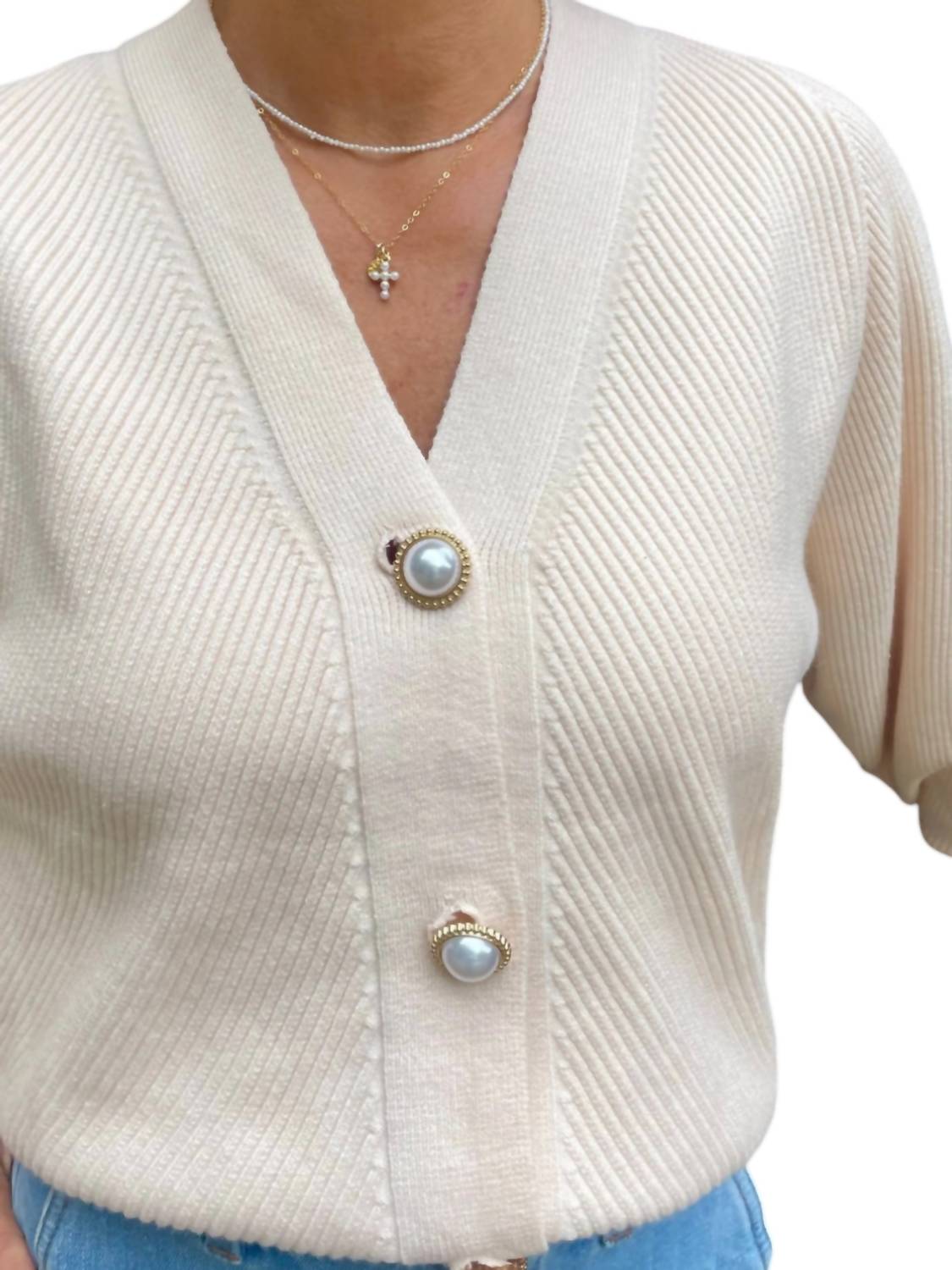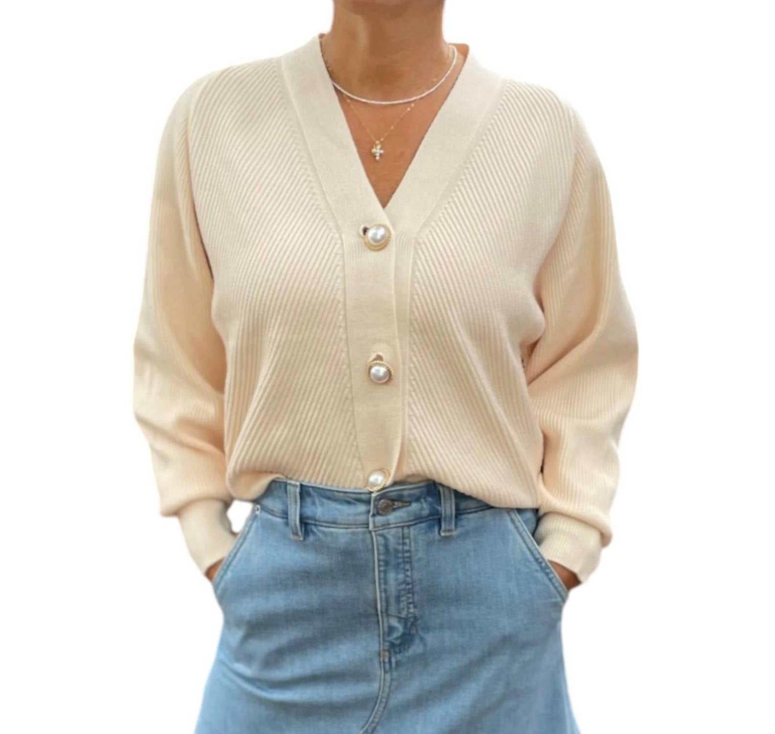 Introducing the Camilla Sweater by THML, a sophisticated addition to any wardrobe. This cream cardigan features long sleeves and a flattering V-neck, adorned with stunning pearl and gold buttons. Made from a comfortable cotton blend, it ensures both style and comfort. Care instructions: Machine wash and lay flat to dry.