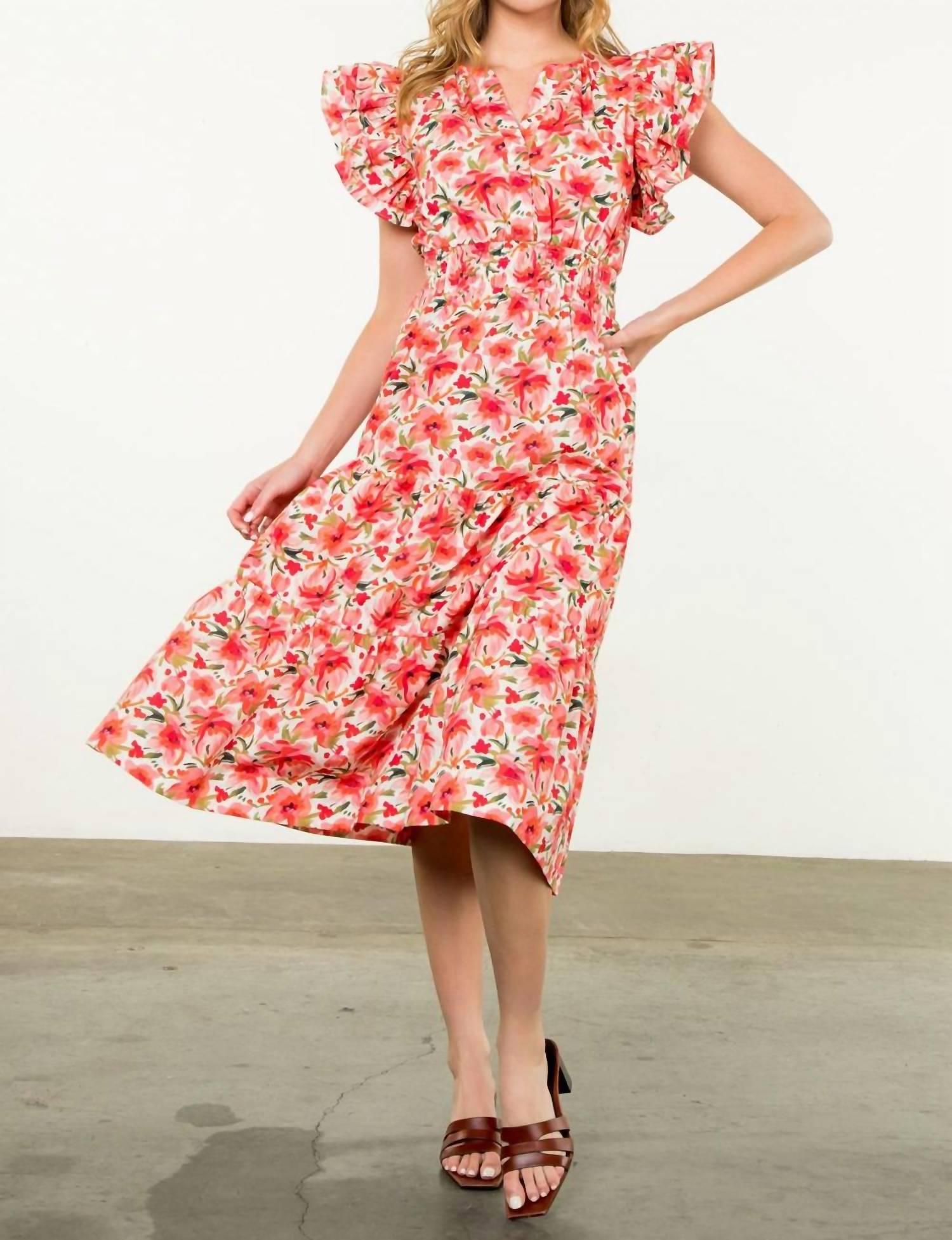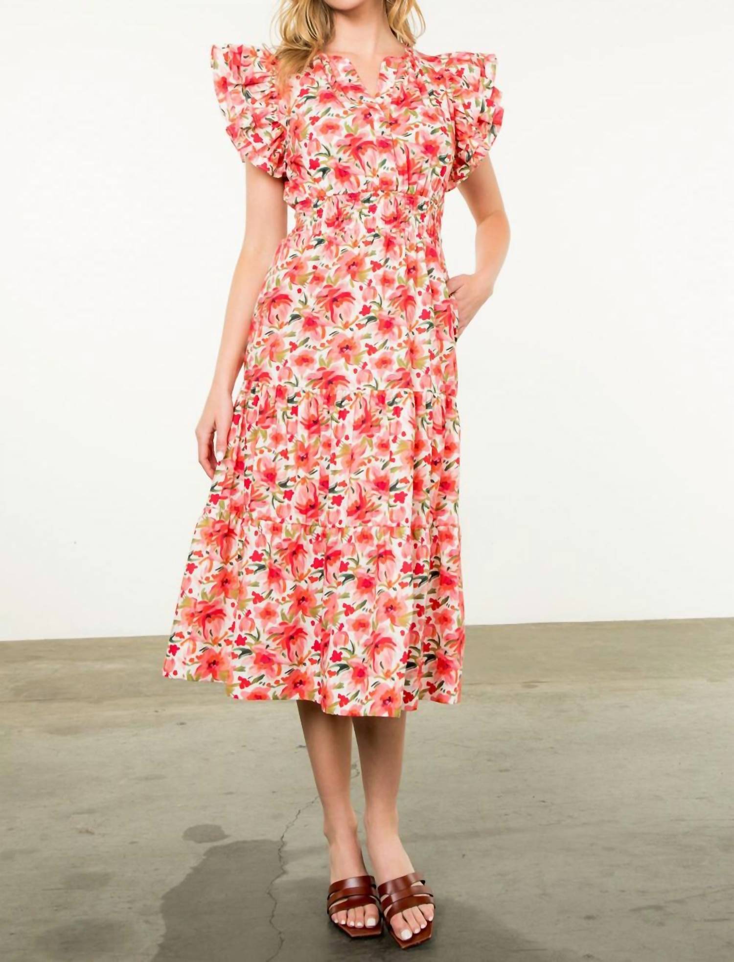 Just add slides or mules and you are good to go. Step into the spotlight with the Dahlia Floral Dress by THML, a charming addition in cream and red designed to captivate. This midi-length dress features playful short ruffle sleeves and a vibrant floral pattern that brings a dash of whimsy to your wardrobe. Crafted from fine polyester, it offers a pull-on closure and convenient pockets for added practicality. Care for this piece by hand washing to maintain its vivid appeal, perfect for Valentine's Day or any festive occasion. Designed in the USA, it showcases a flattering V-neck that completes its feminine silhouette. 100% Polyester.