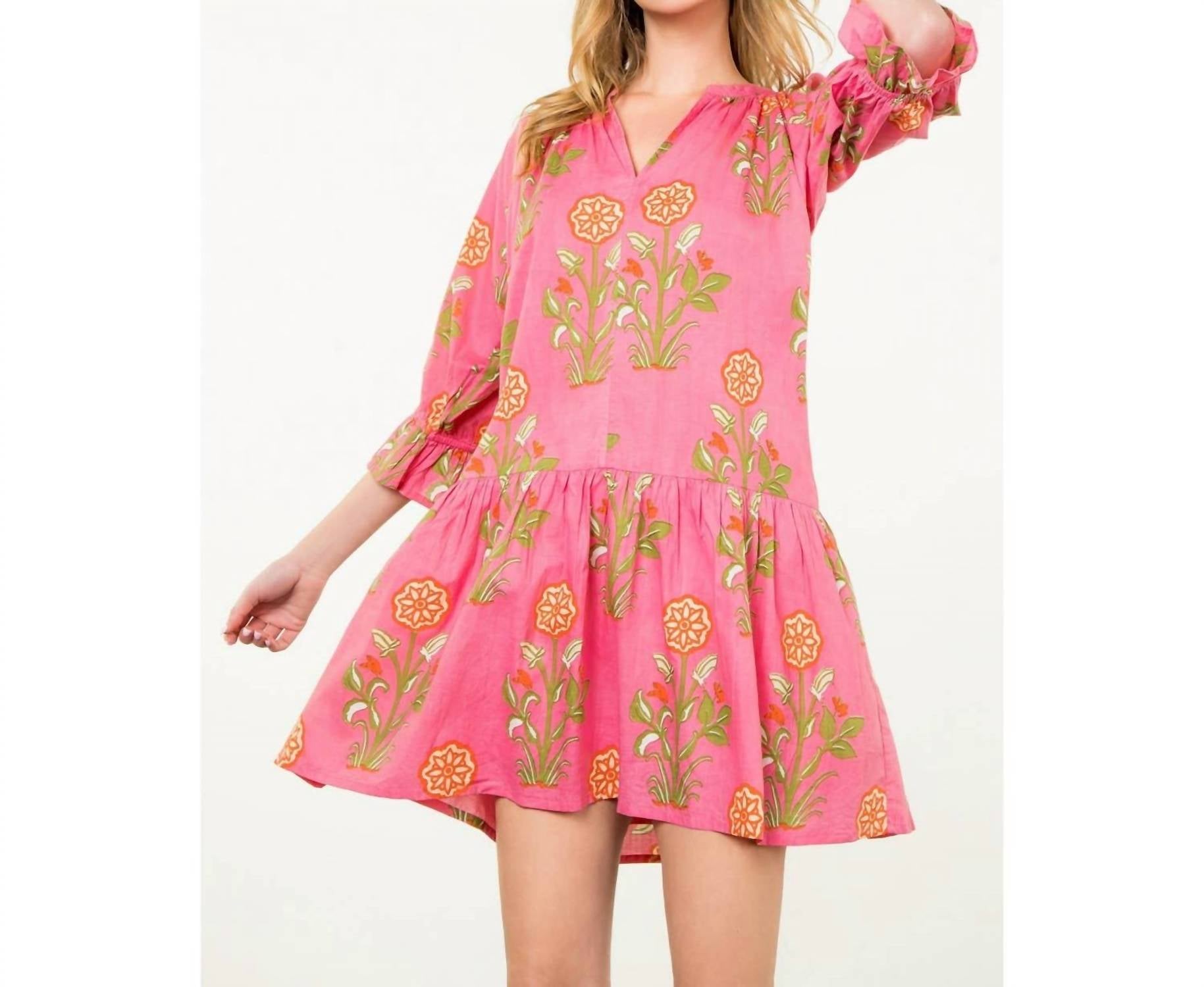 The perfect mini dress for those warmer months. Introducing the Ellen Flower Print Dress by THML, a lively addition to your wardrobe. Designed with three-quarter puff sleeves and an A-line silhouette, this floral beauty features a vibrant pink print that is sure to make you the center of attention. Crafted from a cotton blend and styled as a mini dress, it is ideal for spring gatherings and special occasions like Thanksgiving or baby showers. Closure: Pull on. Care: Hand wash.