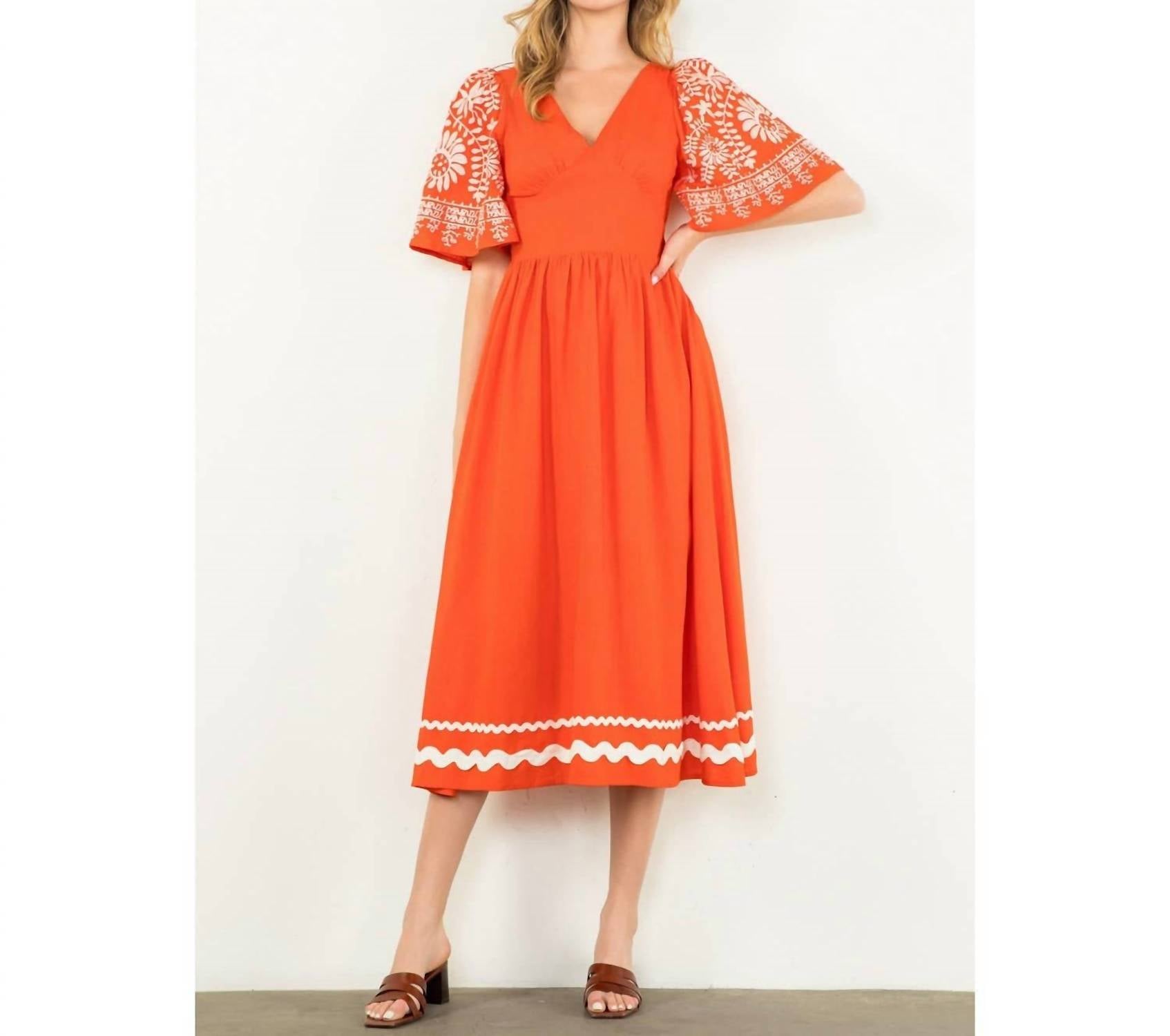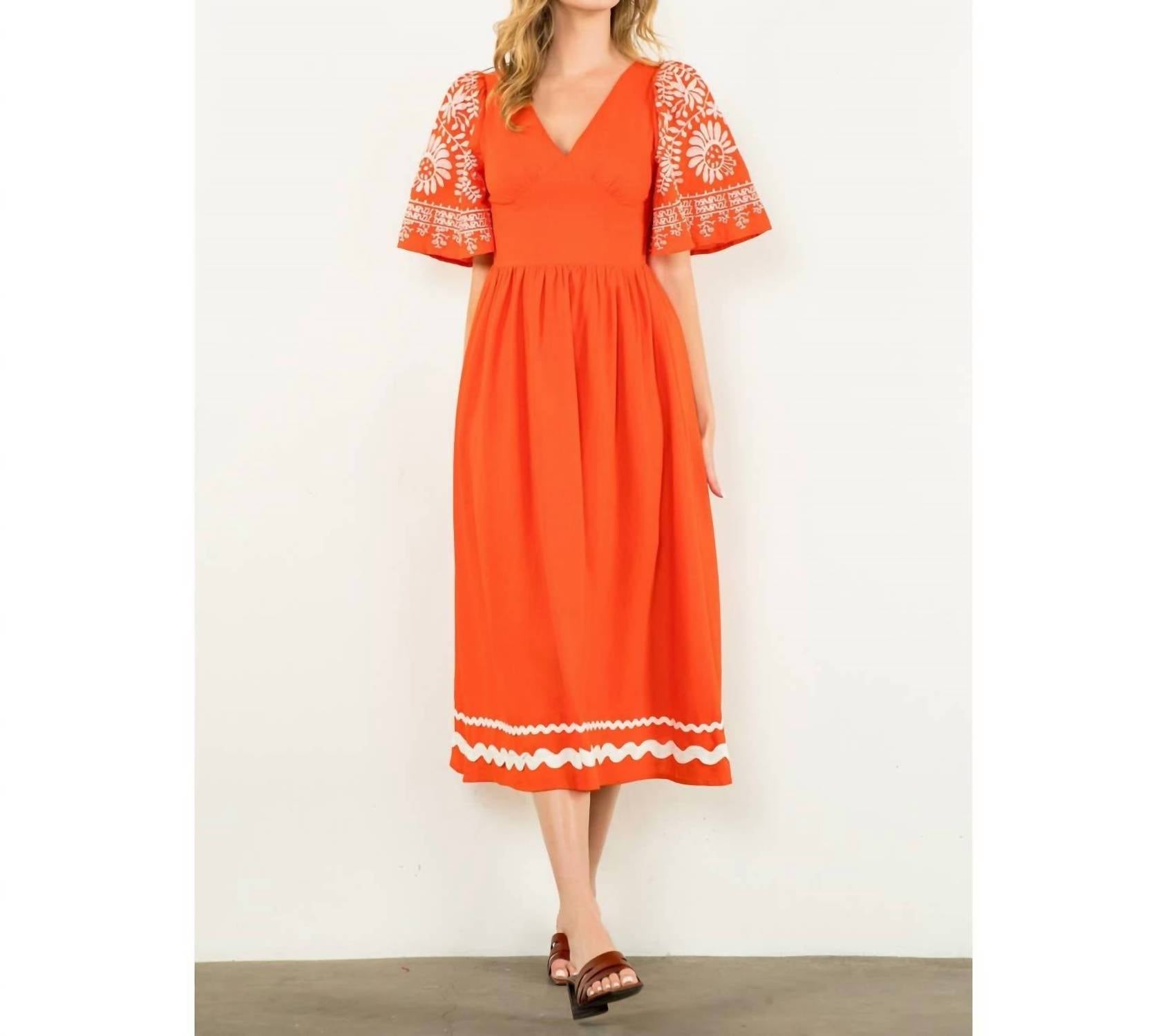 A midi dress so versatile, your options for wearing it are endless. Step out in the Embroidered Flutter Sleeve Midi Dress by THML, a charming addition to any wardrobe. This orange midi dress features flutter sleeves with exquisite embroidery and a flattering V-neck in a fit-and-flare silhouette. Designed in the USA, it is crafted from a woven blend of 70% rayon and 30% polyester. With a pull-on closure and measuring 48 inches in body length and 31 inches in bust width, this dress combines elegance and comfort effortlessly. Model is wearing a size S (Height 5'9", Bust 32", Waist 25.5", Hips 36").