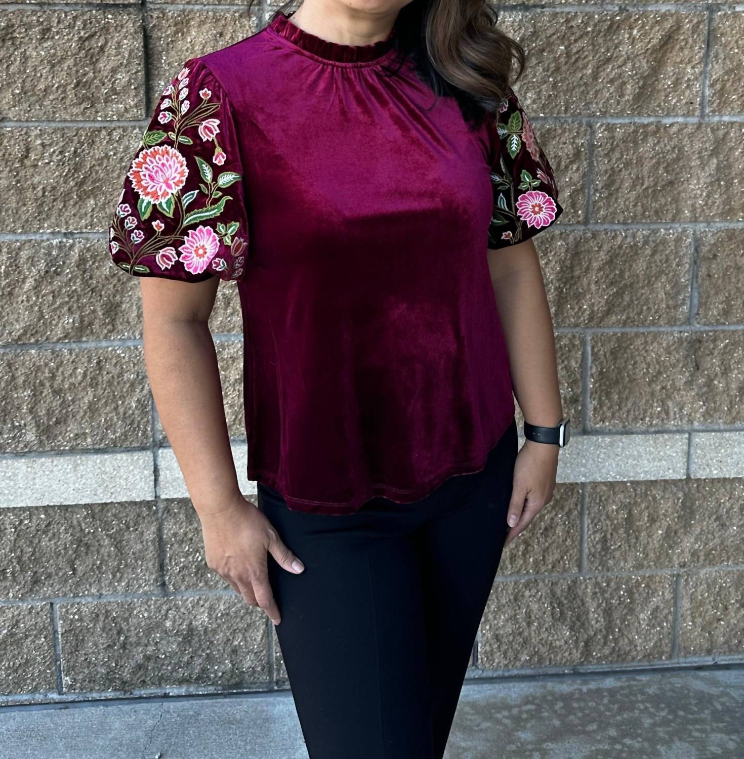 A versatile blouse that works from desk to dinner! Elevate your party attire with the THML Embroidered Velvet Puff Sleeve Top in a rich wine hue. This blouse features playful floral embroidery and a ruffle neck complemented by a crewneck design and short sleeves. Crafted from a blend of 95% polyester and 5% spandex, it offers a comfortable stretch fit with a pull-on closure for ease. Perfectly measured at a body length of 23.5 inches and a bust width of 37 inches for size S, this top ensures a flattering fit.
