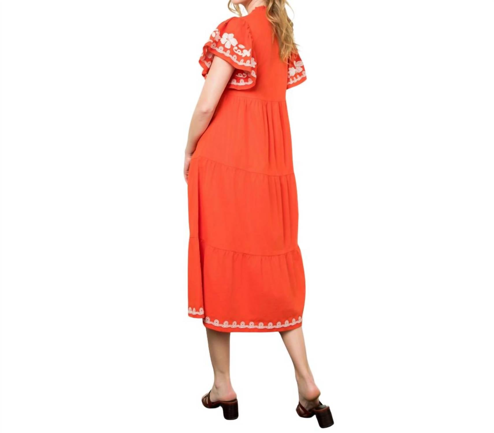 A midi dress so versatile, your options for wearing it are endless. Discover the Flutter Sleeve Embroidered Dress by THML, a stunning wardrobe addition in vivid orange perfect for Cinco De Mayo and beyond. Crafted from rayon, this A-line midi dress features short flutter sleeves and intricate embroidery that embodies boho chic style. With a V-neckline and a length of 47.5 inches, it's designed for a flattering silhouette, ideal for holiday parties. This patterned piece is easy to wear with its pull-on closure and can be conveniently machine washed.