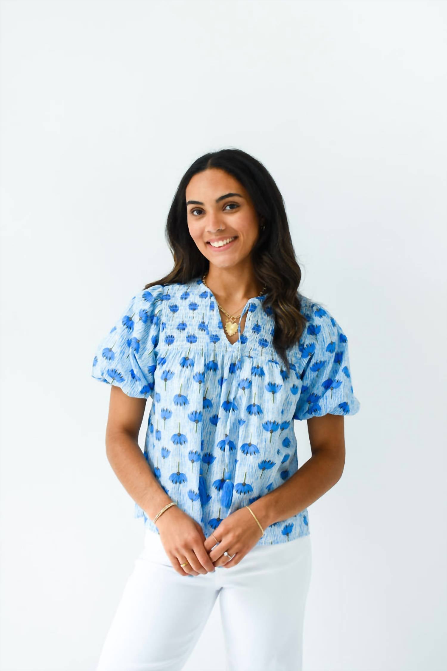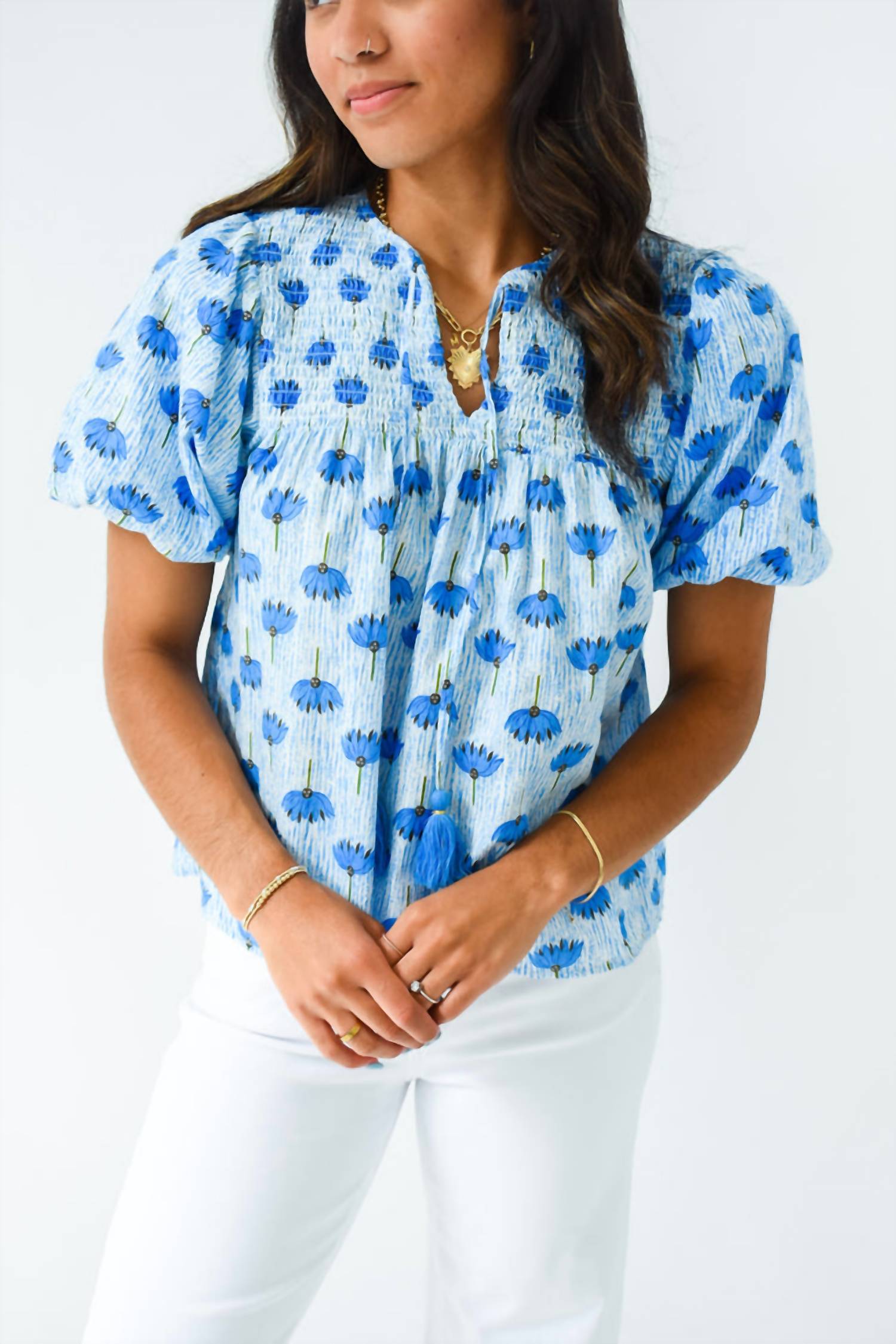 A versatile blouse that works from desk to dinner! Embrace the arrival of warmer days with the THML Gavin Top in a delightful Blue-tanical floral print. This blouse showcases short puff sleeves with elastic cuffs, a charming V-neckline with self-ties, and tassel cord ends, offering a boho chic flair. Made from 100% cotton, this top ensures comfort while the smocking at the chest provides a flattering fit. Care instructions: Hand wash cold, do not bleach, and lay flat to dry. Closure type: Tie closure.