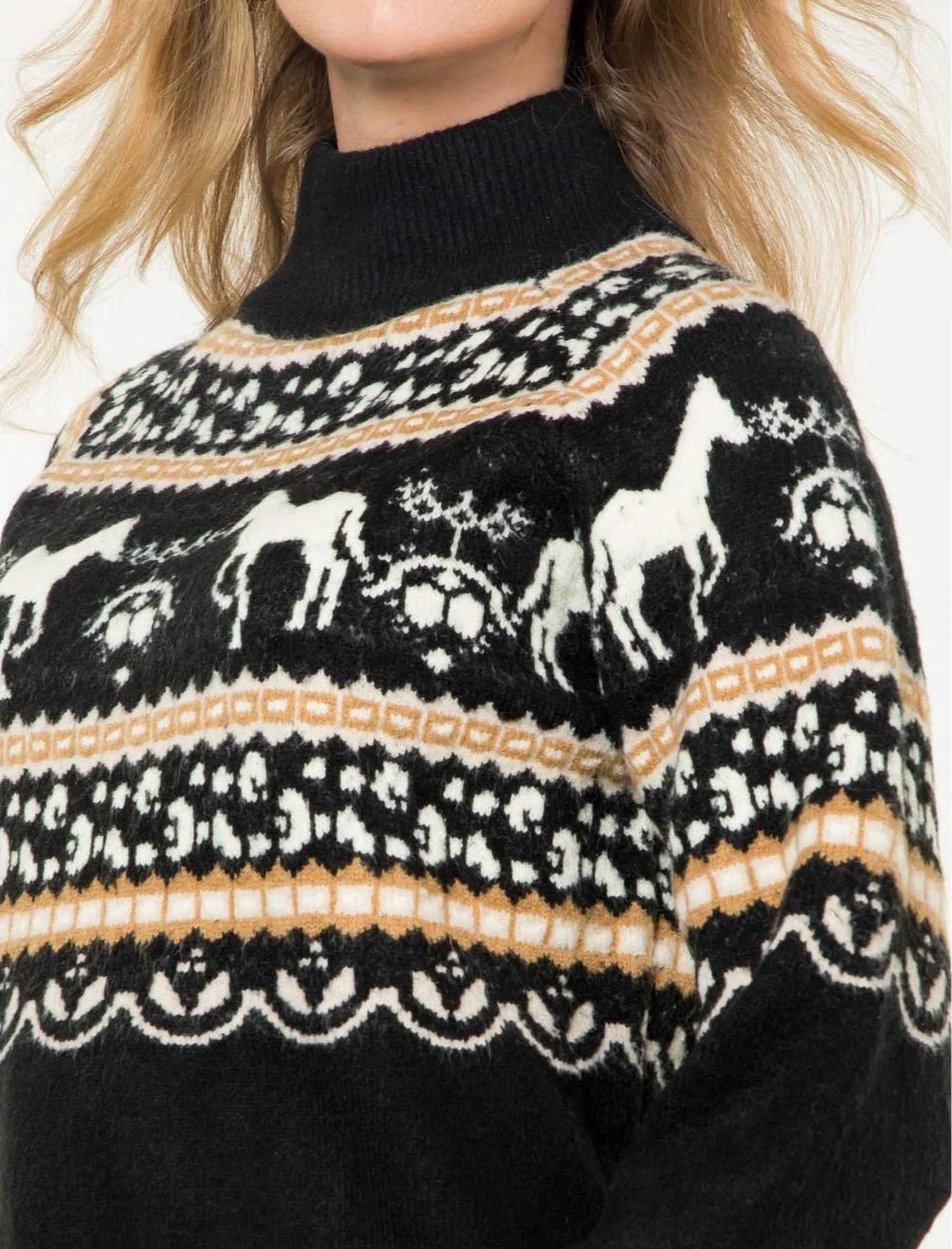 Layer under your favorite sweater or wear tucked into jeans for a perfectly polished winter look. Wrap yourself in warmth with the THML Horse Fair Isle Sweater, a charming turtleneck in versatile black. This women's sweater features long sleeves adorned with a timeless Fair Isle pattern and horse motifs. Crafted from a blend of 68% Acrylic, 29% Nylon, and 3% Spandex, its 21-inch length provides cozy comfort. Originating from China, this piece offers a pull-on closure, with hand wash care for easy maintenance. Model's measurements: 5'9", wearing size S (Body Length: 21 in, Bust Width: 38 in, Sleeve Length: 26 1/4 in).