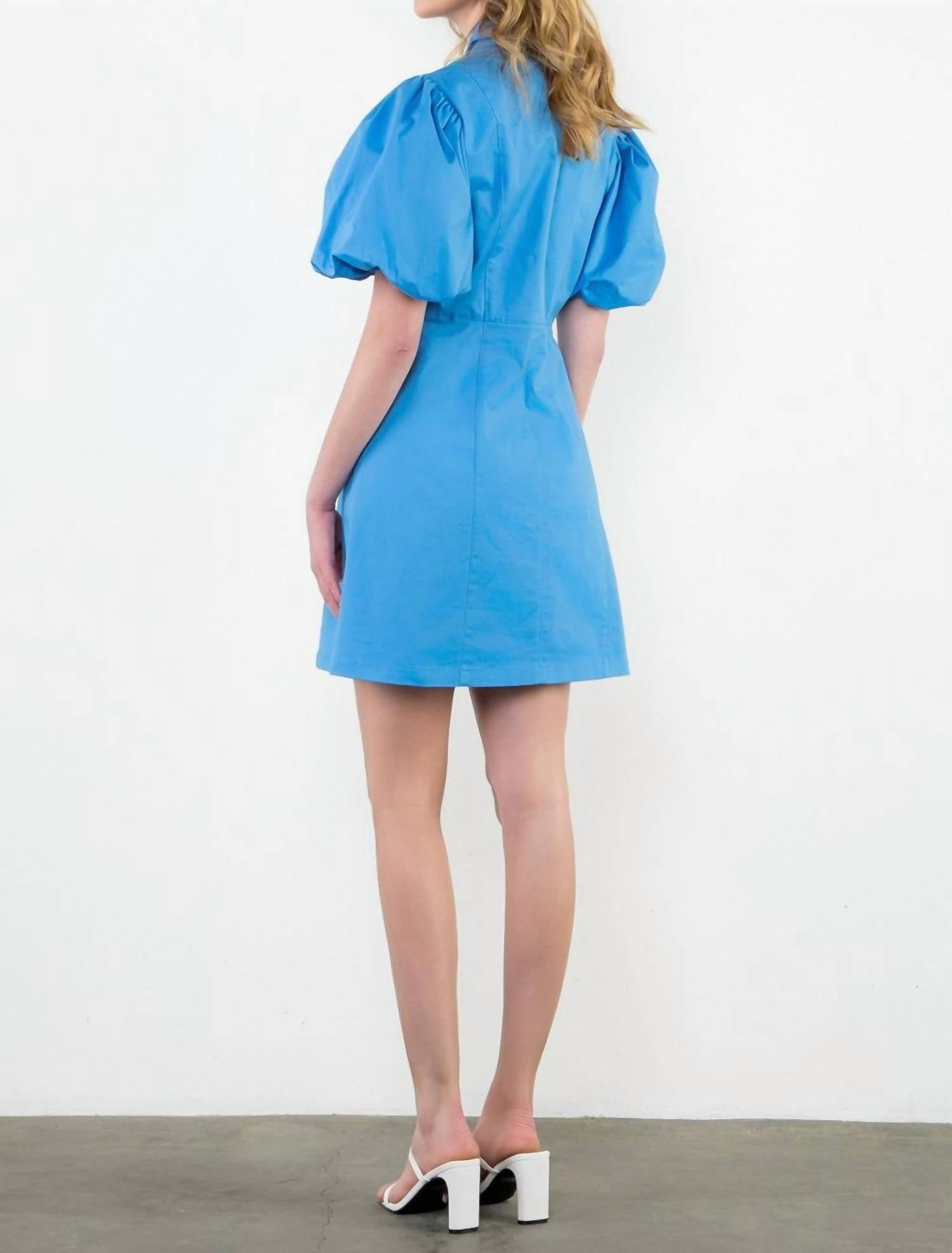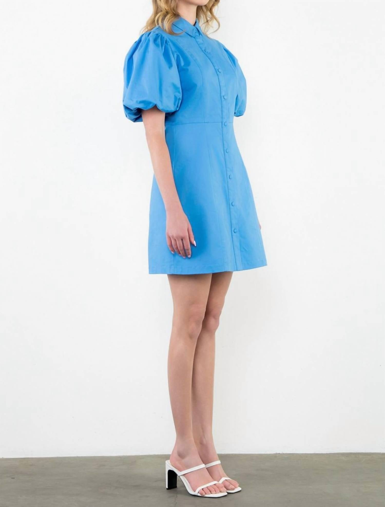 The kind of easy and flattering dress you'll be reaching for all season long. Step into elegance with the Puff Sleeve Button Up Dress by THML, crafted for your next dinner party. This chic A-line mini dress comes in a solid blue and features short sleeves for a fresh Spring look. Made in 100% polyester and fully lined, it perfectly combines comfort and style with a classic collar and convenient button closure. Available in sizes Small (Bust 17”, Hem 33”), Medium (Bust 18”, Hem 33”), and Large (Bust 19”, Hem 34”). Model height is 5’3”.