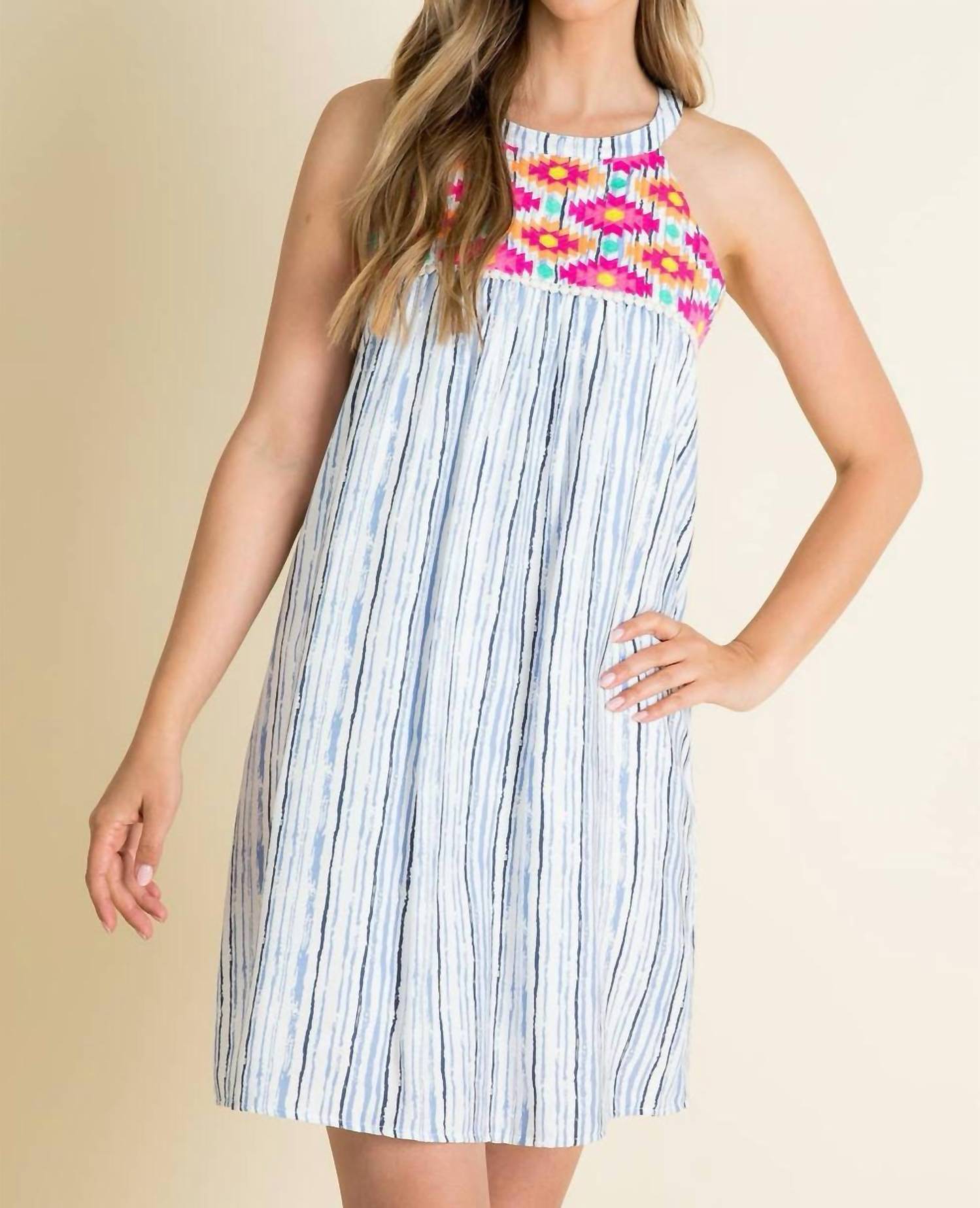 The perfect mini dress for those warmer months. Discover the Stripe Embroidered Halter Dress by THML, a chic sleeveless piece perfect for summer occasions. Crafted from 100% woven polyester, this mini shift dress in patterned blue features a flattering halter neckline. Designed in the USA with a body length of 35 1/3 inches and a bust width of 37 inches in size S, it is the ideal choice for a stylishly comfortable fit. Care instructions recommend machine washing, ensuring effortless maintenance for your wardrobe. Model is wearing a size S (Height 5'9", Bust 32", Waist 25.5", Hips 36").