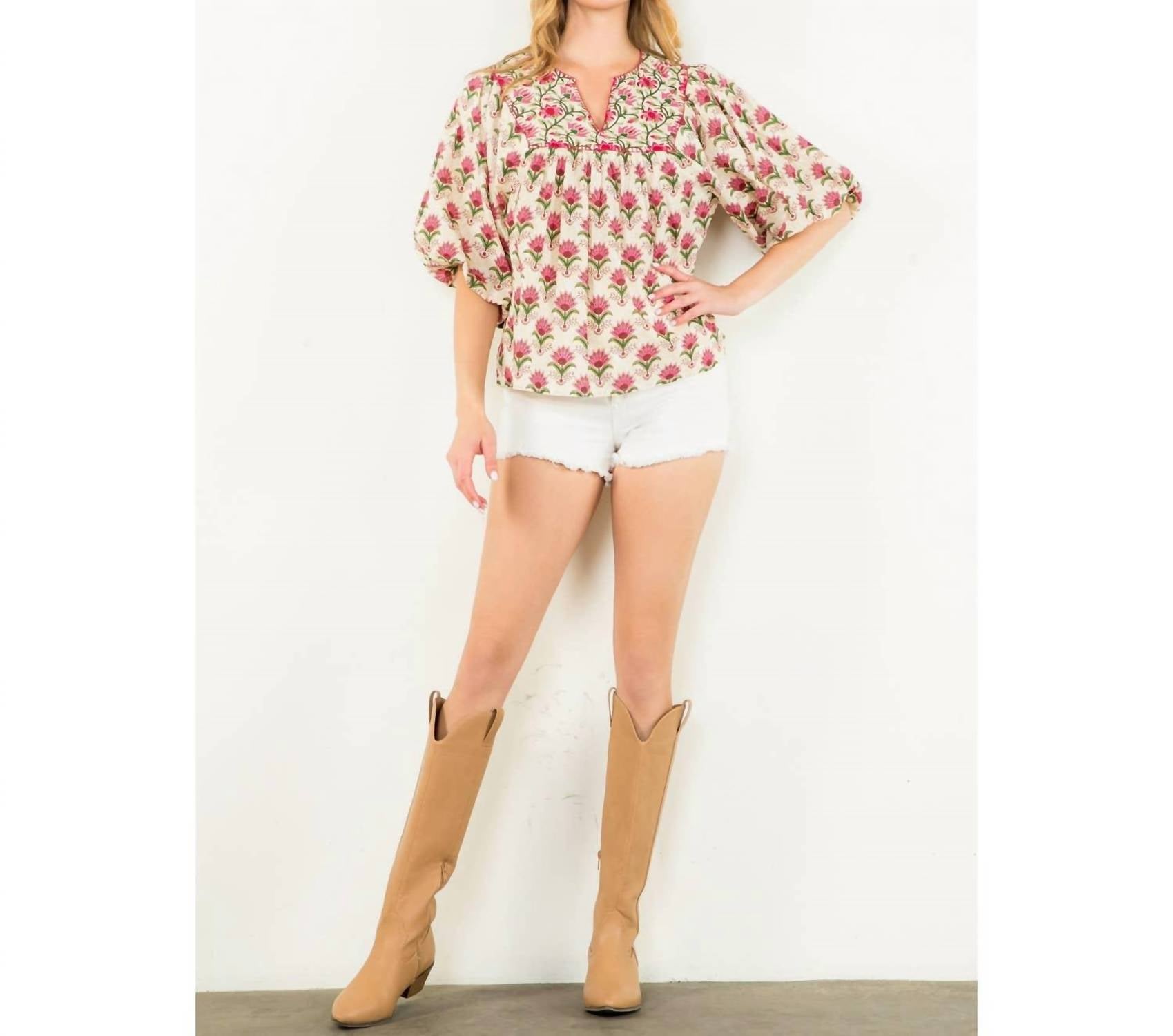 Meet the Willow Blouse by THML, a stylish choice for any wardrobe in a playful pink multi floral block print. This top showcases short puff sleeves, perfect for adding a touch of flair to your ensemble. Made from 100% Cotton, the blouse features a convenient pull-on closure and a flattering V-neckline. Care for this Boho Chic piece by machine washing, making it an ideal choice for events like a baby shower.