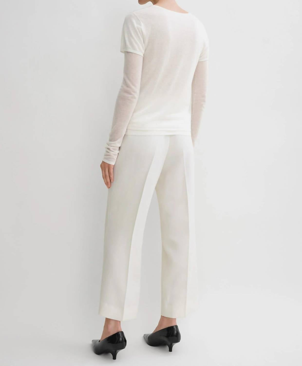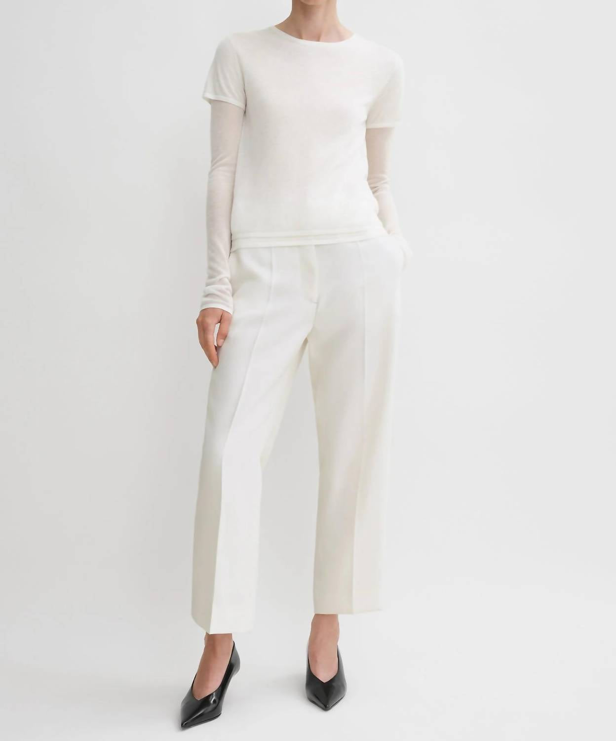 The perfect long sleeve tee that goes with just about anything. Introducing the TOTEME Layered Knit Tee in white, a unique blend of style and comfort with a clever t-shirt over long sleeve illusion. Crafted from 88% Lyocell, 10% Cashmere, and 2% Polyamide, this finely knitted top offers a luxurious feel. With long sleeves and a classic crewneck, it fits effortlessly into any spring wardrobe. Closure: Pull on. Care: Hand wash and lay flat to dry. Designed for women who appreciate solid elegance without pockets.