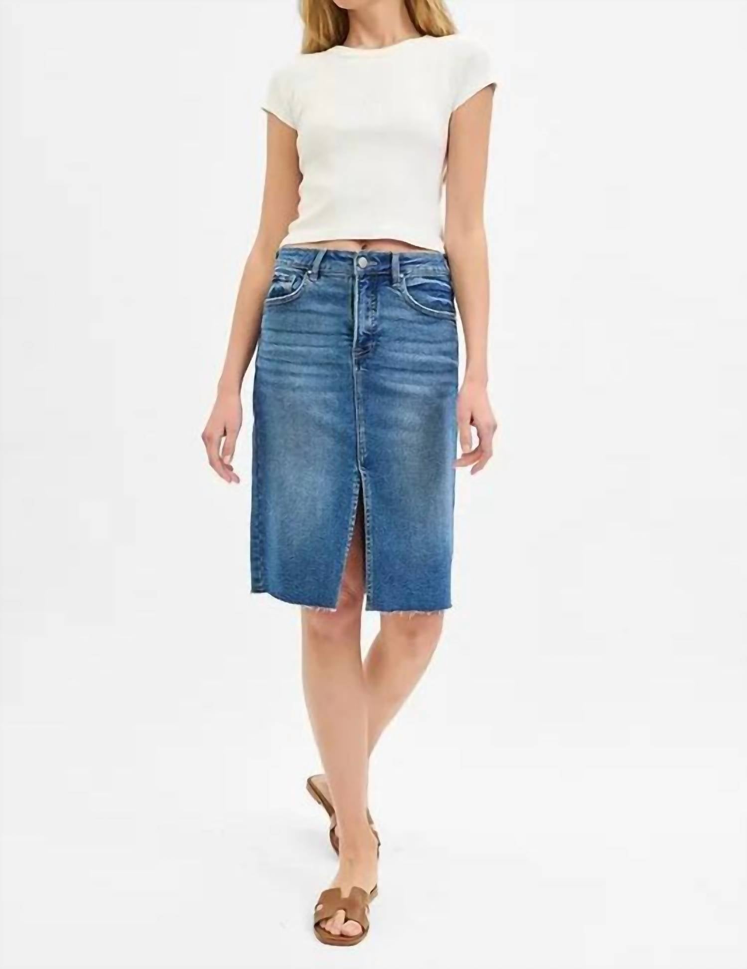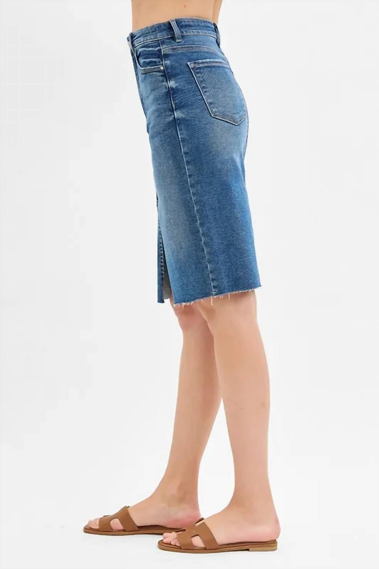 Show just the right amount of leg in this fit flattering mini. Elevate your style with the Risen Full Size High Rise Front Slit Pencil Skirt by Trendsi, designed in a chic medium wash. This skirt features a flattering high-rise waist with a captivating front slit and is slightly stretchy for comfort. Made with a blend of 67% cotton, 26% lyocell, 5% polyester, and 2% spandex, it includes a convenient button closure. Care for it effortlessly with machine wash cold and tumble dry instructions, and enjoy its imported quality. Available in sizes S to 3XL (Waist: 26-41 inches, Hip: 36-51 inches), this skirt is a versatile addition to any wardrobe.