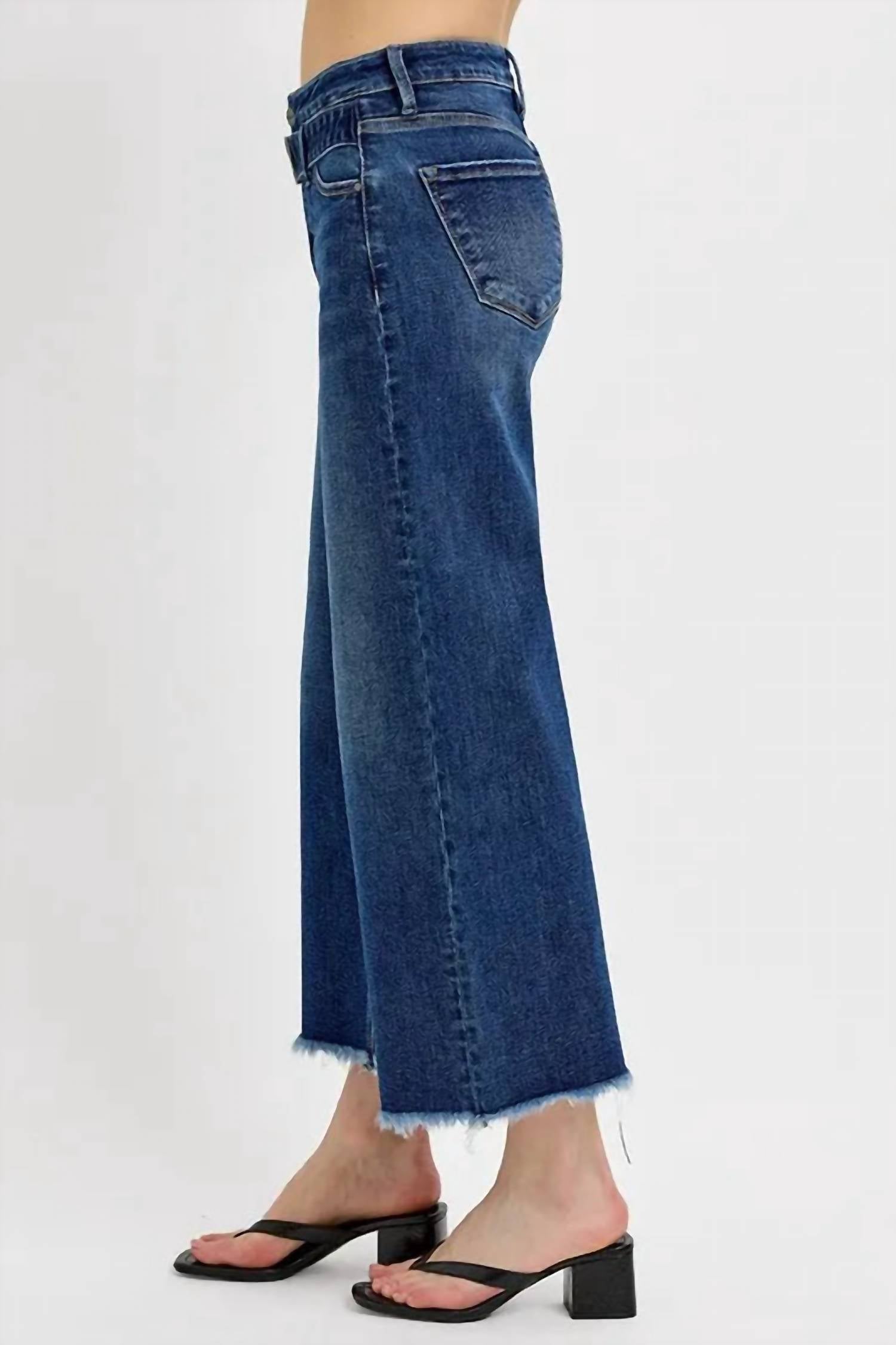 Just as cute as they are comfortable. Introducing the Risen Raw Hem Wide Leg Attached Buckle Jeans by Trendsi, perfect for making a statement at any dinner party in the spring season. With a relaxed fit and wide-leg silhouette, these jeans in a dark wash feature a solid pattern and raw, unfinished hem for an edgy vibe. They are crafted from a slightly stretchy cotton blend, containing 93% cotton, 5% polyester, and 2% spandex, ensuring both comfort and style. Closure: Button closure. Care: Machine wash cold and tumble dry low. Imported. Available sizes include waist measurements from 24 to 32 inches, inseams ranging from 26 to 27 inches, and rises between 10 to 11 inches.