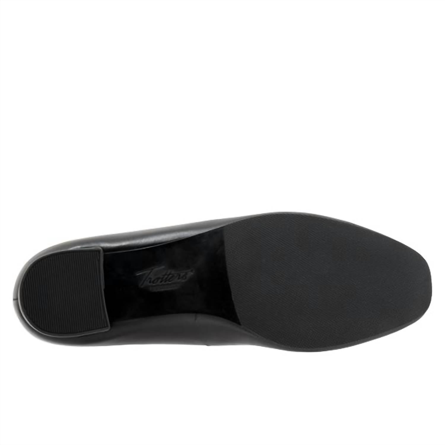 The perfect height for day to night. Step into unparalleled comfort with the Women's Dream Slip-on Pump by Trotters, crafted in classic black leather. This slip-on features a tricot fabric upper lining and a soft man-made nappa footbed lining, enhanced with a cushioned footbed that offers arch support for all-day wear. Finished with a synthetic rubber sole and a stable 1.25-inch block heel, these shoes are perfect for adding a touch of elegance to your fall wardrobe. Designed with a round toe, this versatile pump effortlessly complements any outfit.
