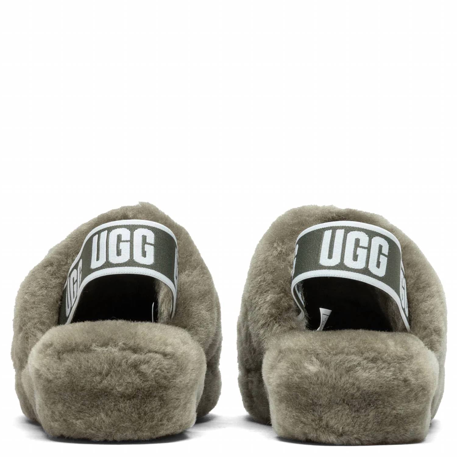 Classicly cute and all-day-wearable. We love this sandal. Presenting the Women's Fluff Yeah Slide by UGG, a stylish fusion of slipper and sandal in a chic burnt olive color. This standout shoe features soft sheepskin material and a lightweight 1.5-inch flat platform heel, perfect for pairing with midi dresses or jeans. Designed with a peep toe for added flair, it offers a cozy and fashionable statement. Made for adult women seeking comfort without compromising on style.