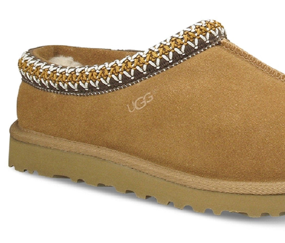 Round-toe slip-on slippers|UGGpure™ wool helps wick away moisture; braided trim|Lightweight and flexible molded EVA with patented tread design for both indoor and outdoor use|Pieced| dyed sheepskin|Fur origin; United States| UK