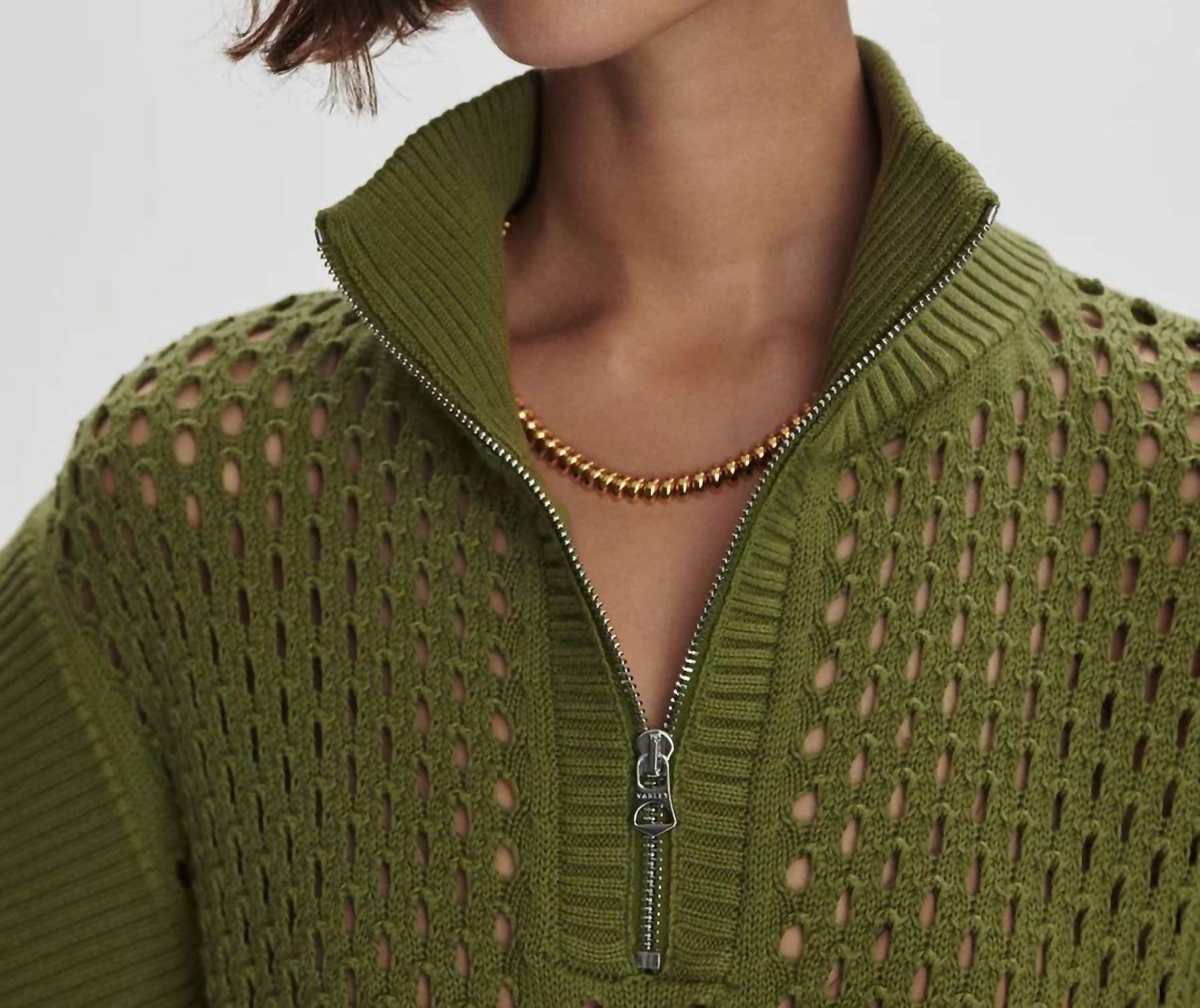 Introducing the Gaines Half-Zip Knit by VARLEY, a chic short sleeve blouse in a refreshing Fresh Fern hue. This piece features a cap sleeve design and a collar neckline, crafted from 100% textured cotton with a stylish oversized fit. Made with a convenient zip closure and a ribbed hem, it's perfect for pairing with your favorite bralette and can be seamlessly tucked into shorts or pants, making it an ideal choice for summer vacations. Care: Hand wash. Import. Size S front length: 19.9".