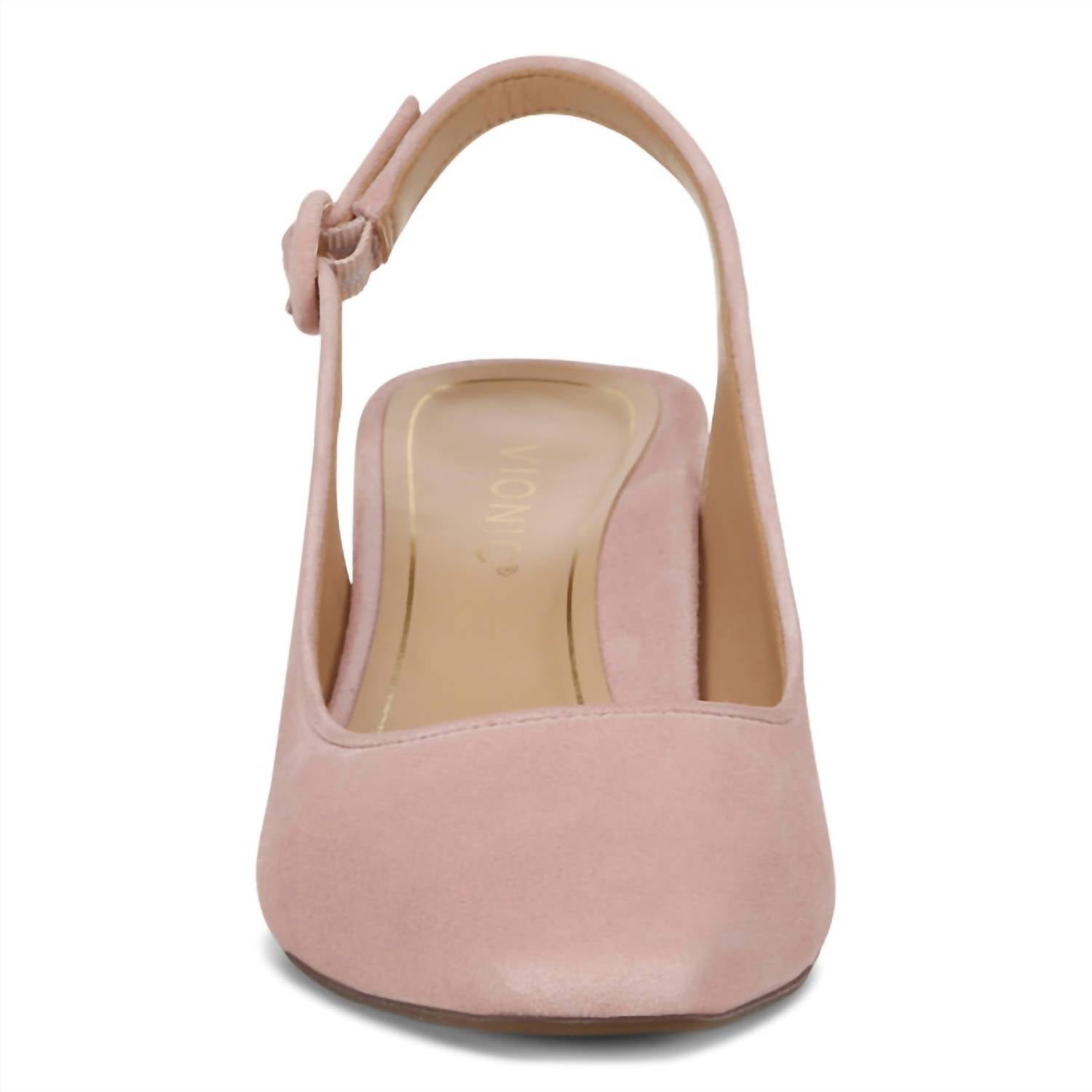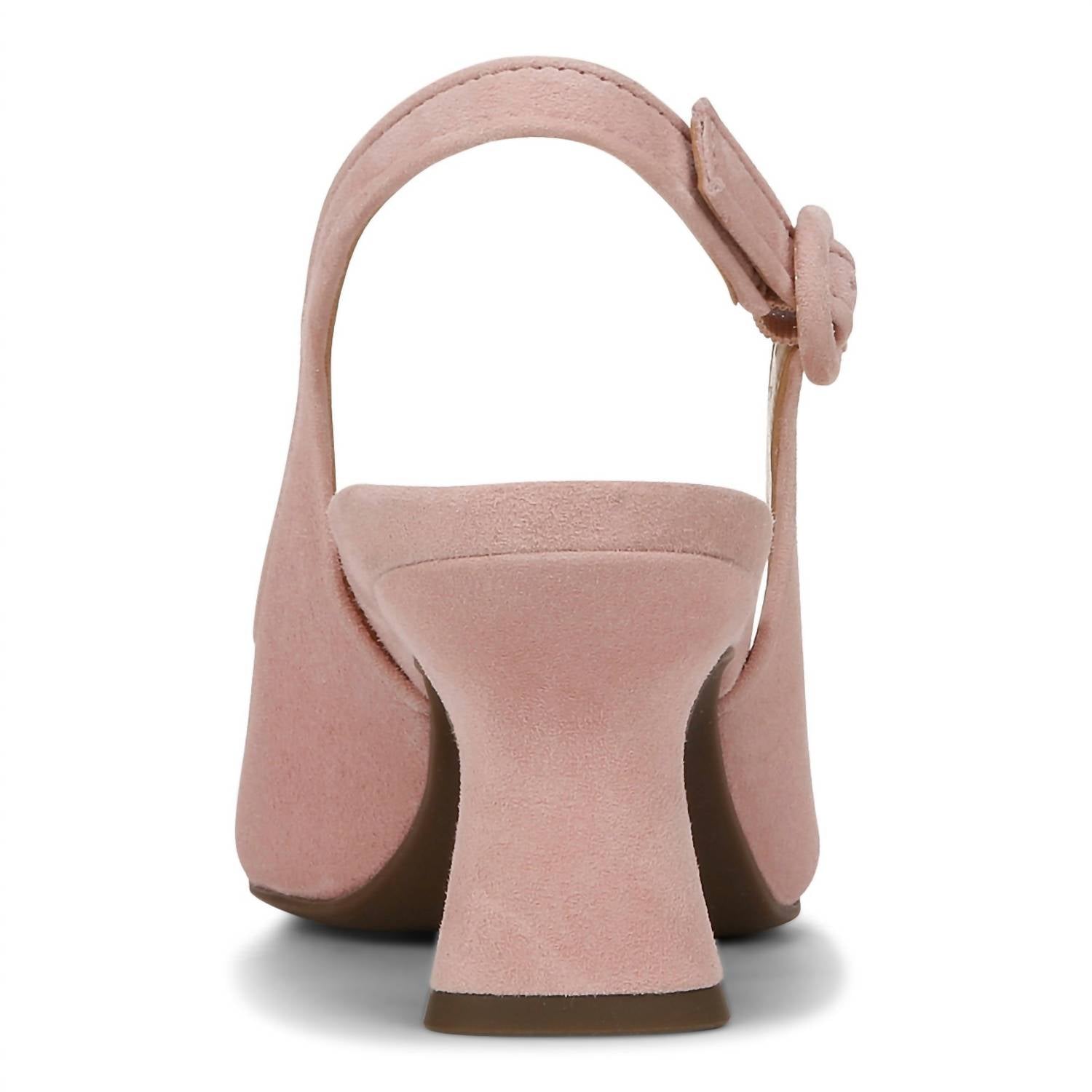 The VIONIC Women's Perris Slingback Pump in Light Pink is a chic addition to any wardrobe with its suede upper and square toe design. This mid-height kitten heel, measuring 2.37 inches, incorporates advanced comfort features such as a deep heel cup and enhanced forefoot contour. The footbed is crafted from durable man-made materials, and the outsole is made of resilient rubber, offering long-lasting wear. This stylish pump effortlessly combines elegance and comfort, perfect for all-day wear.