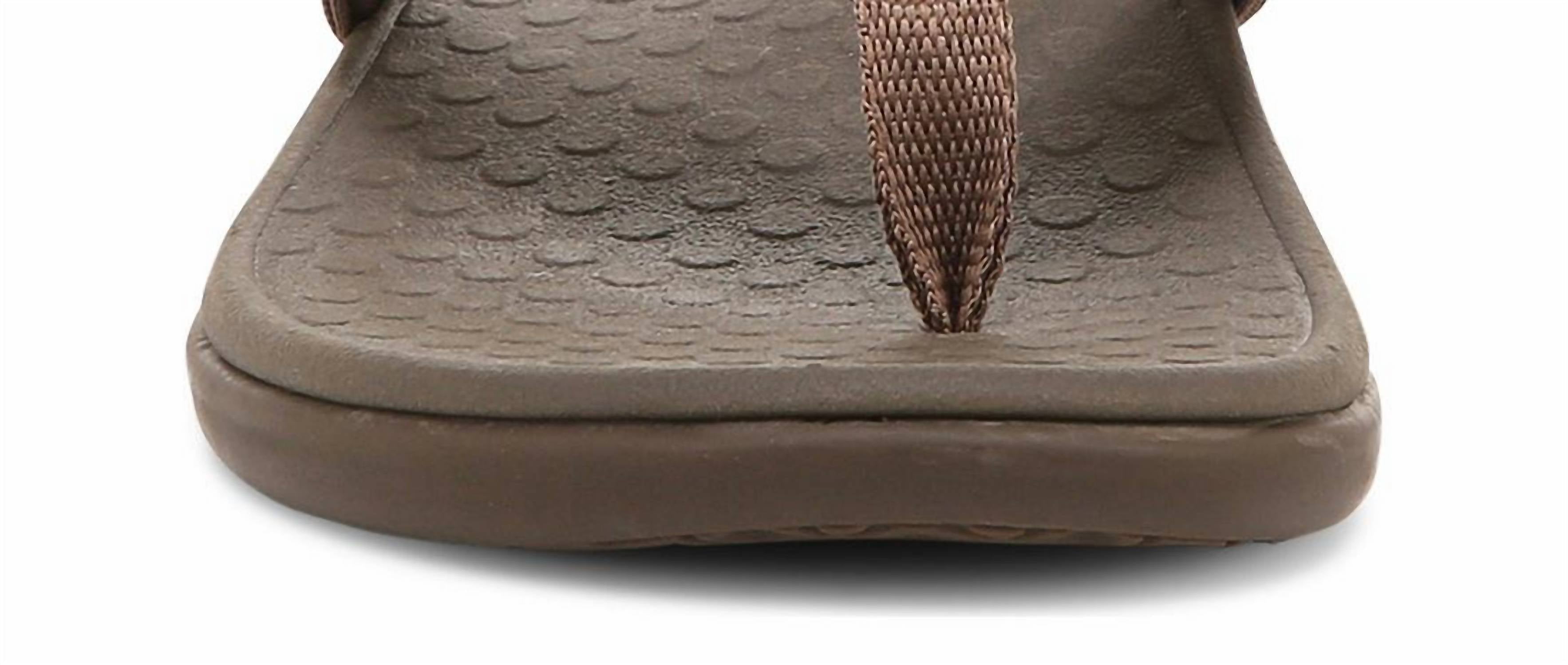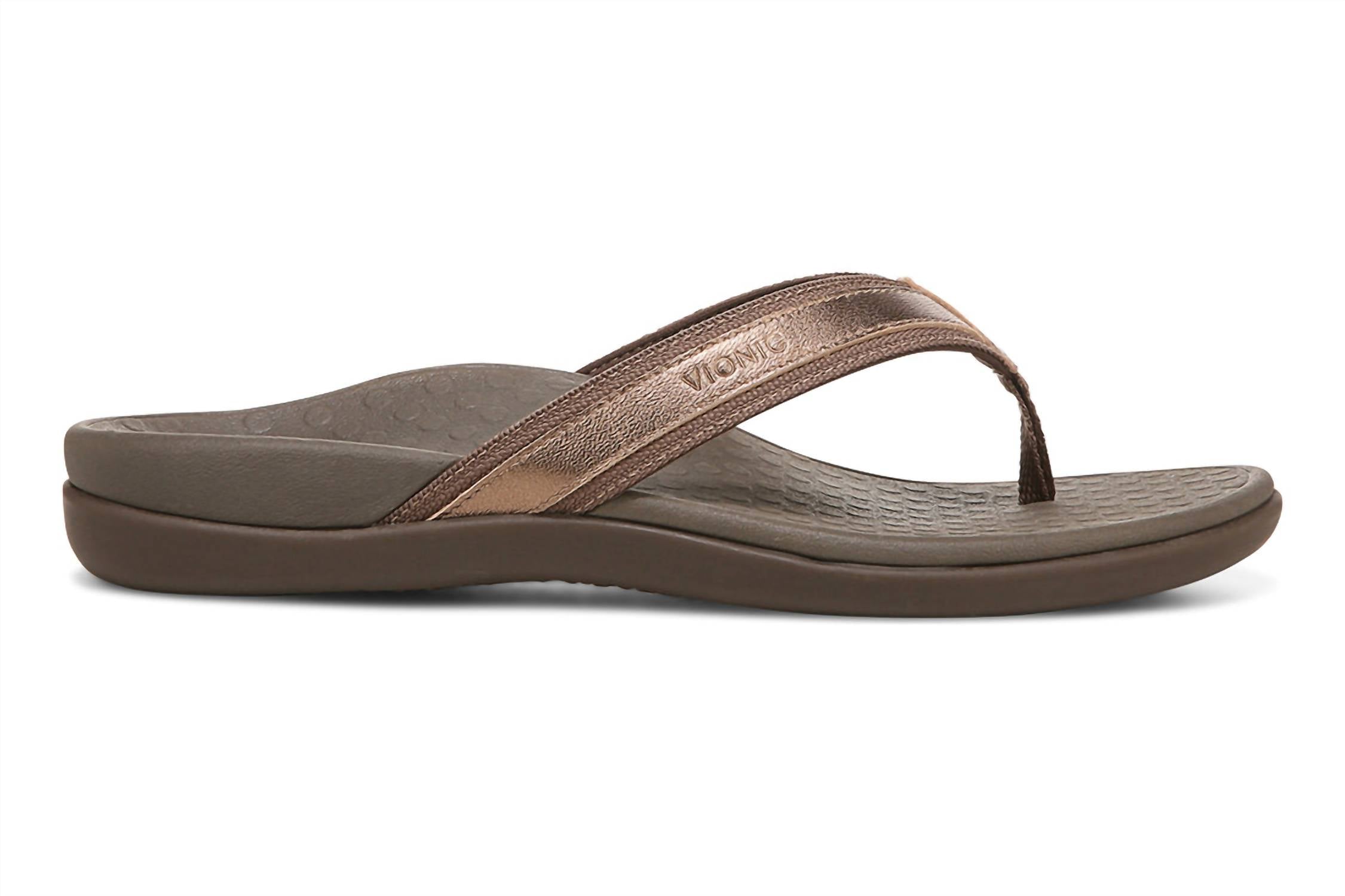 Flowy dresses, cropped pants, and even jumpsuits... this sandal works with them all! Introducing the VIONIC Women's Tide II Toe Post Sandal, designed to ensure a comfortable and stylish experience in a chic bronze metallic hue. This sandal boasts a woven polyurethane upper with elegant leather trim, complemented by a soft woven toe post and foam-lined strap for all-day comfort. The lightweight, flexible medium-density EVA midsole absorbs shock, while the durable TPR outsole with wave-patterned tread provides reliable traction. Care: As with most sandals, an occasional wipe with a damp cloth keeps them looking pristine. Weight of a single sandal: 6 oz.