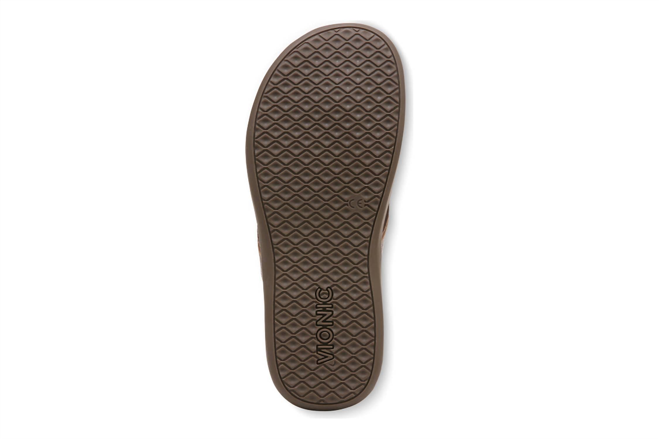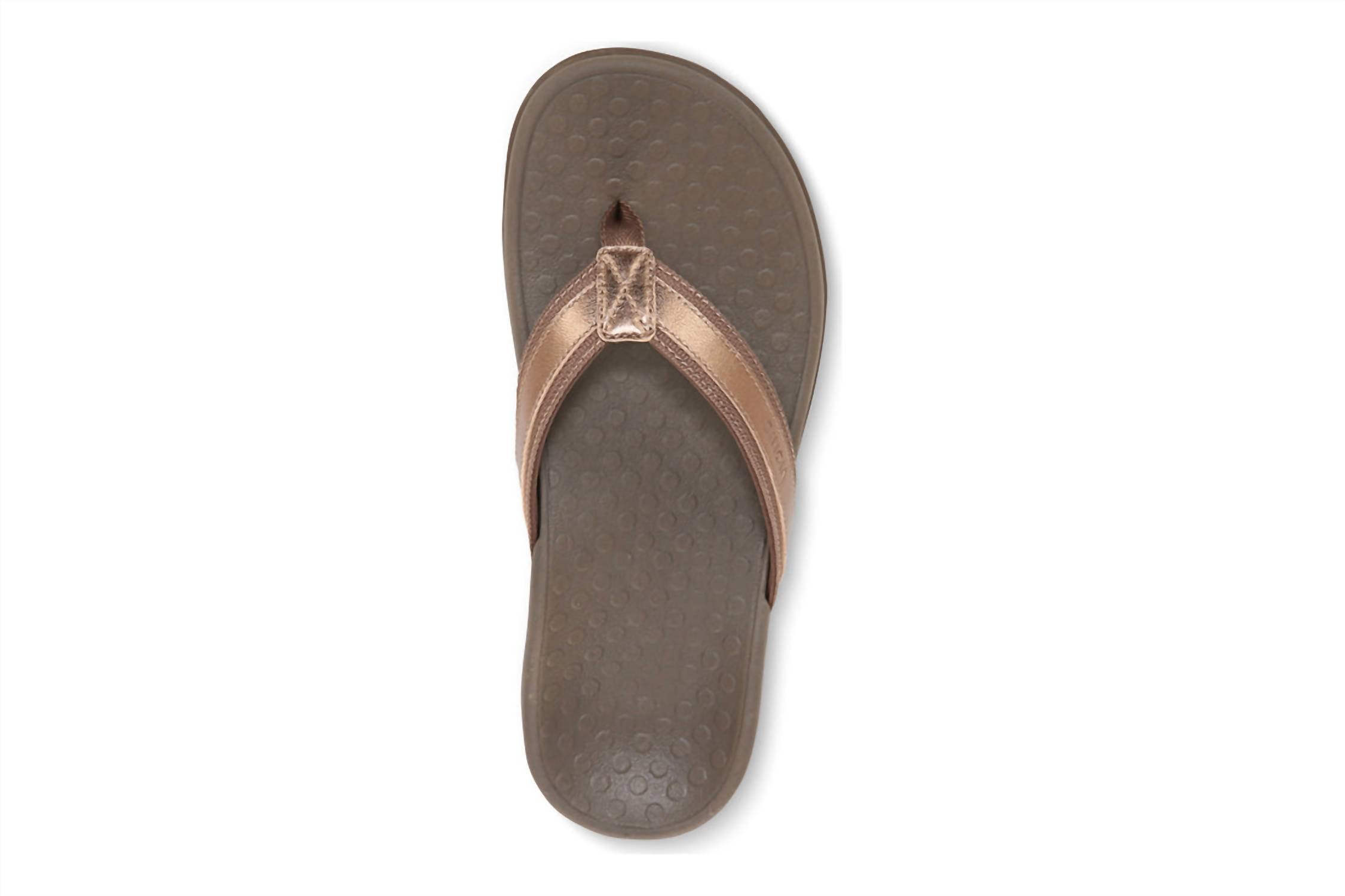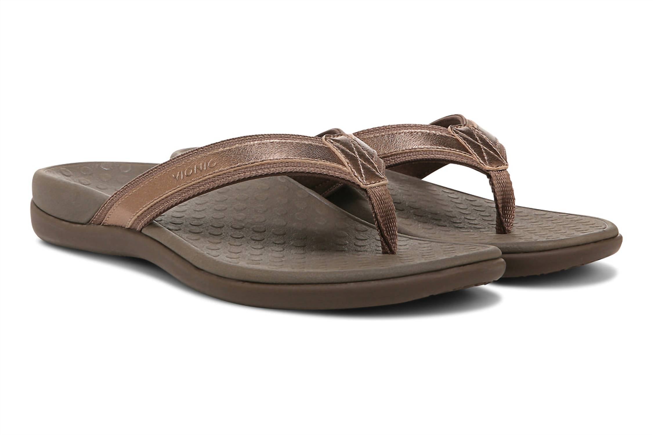 Introducing the VIONIC Women's Tide II Toe Post Sandal, designed to ensure a comfortable and stylish experience in a chic bronze metallic hue. This sandal boasts a woven polyurethane upper with elegant leather trim, complemented by a soft woven toe post and foam-lined strap for all-day comfort. The lightweight, flexible medium-density EVA midsole absorbs shock, while the durable TPR outsole with wave-patterned tread provides reliable traction. Care: As with most sandals, an occasional wipe with a damp cloth keeps them looking pristine. Weight of a single sandal: 6 oz.