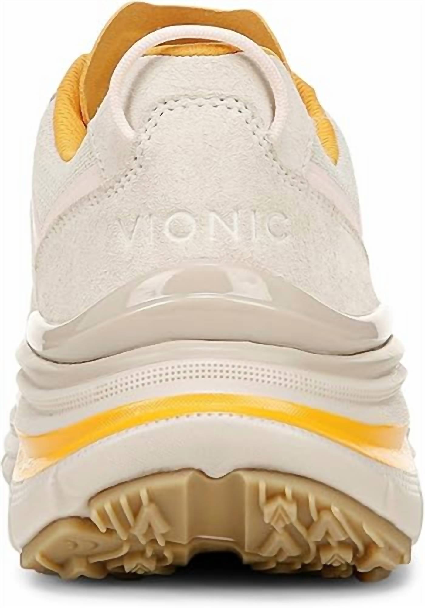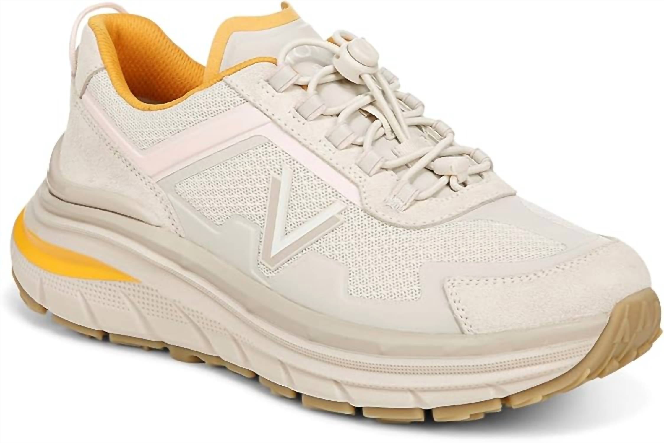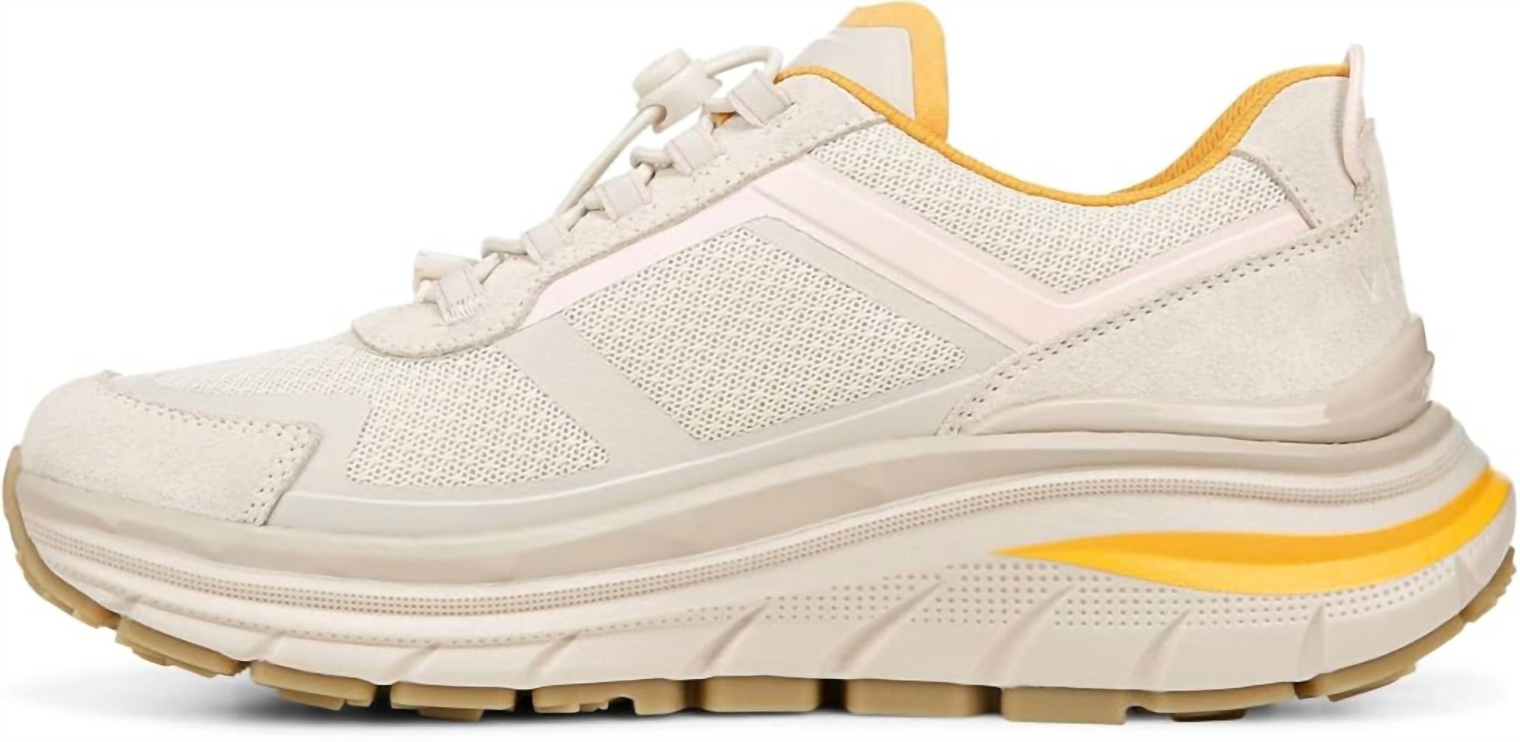 Get your daily steps in with these adorable sneakers. Meet the VIONIC Women's Walk Max Sierra Sneakers in a stylish cream hue, part of the Walk Series designed for comfort and performance. These sneakers are crafted with premium materials, featuring a round suede toe for trail readiness, and come equipped with lace-up with toggle closure for convenience. Finished with a rugged outsole and a water-resistant upper, they offer superb grip and protection against the elements. For best results, gradually wear your new VIONIC shoes over 1-2 weeks to enjoy the full orthotic comfort with a flat heel height of 0.25 inches.