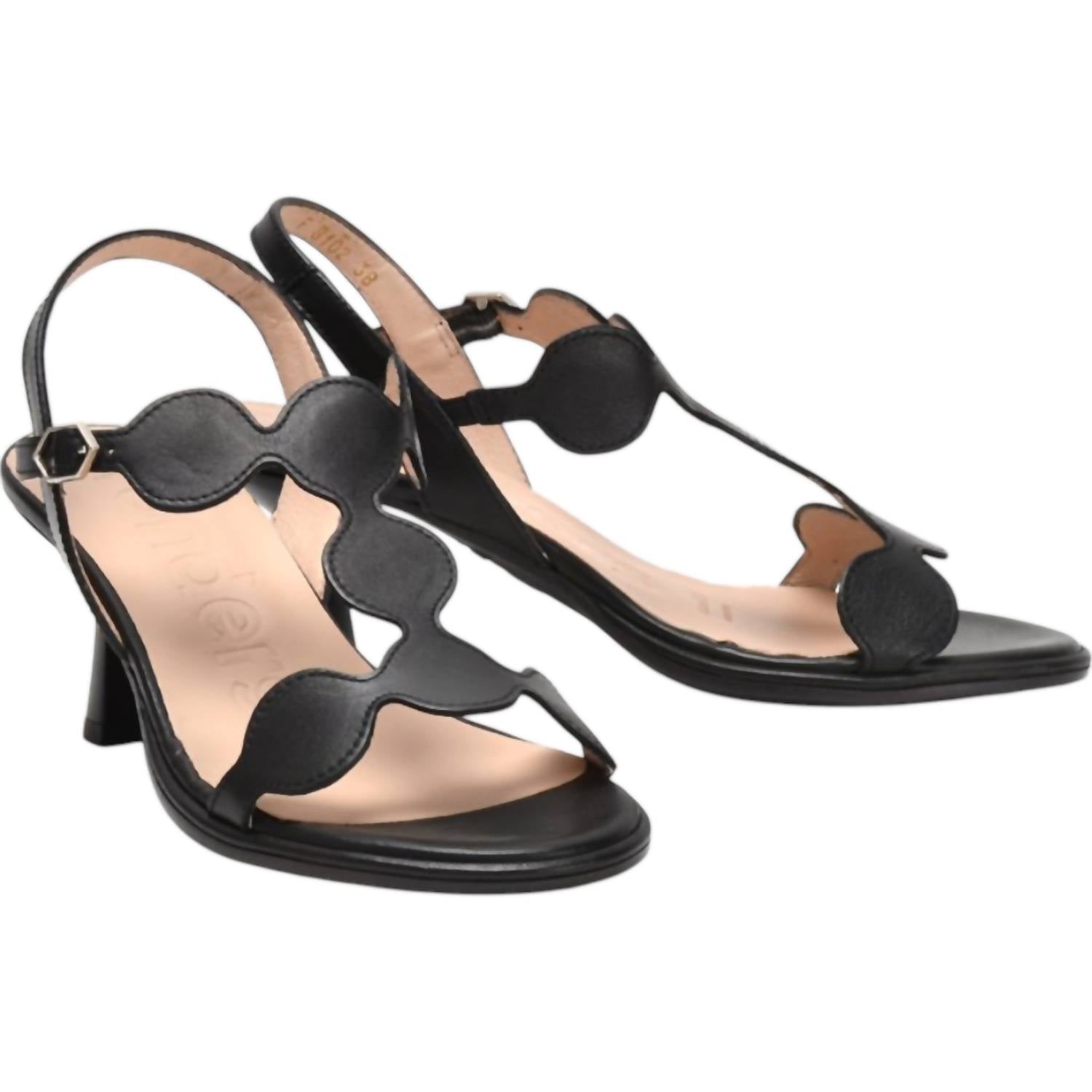 Pair these beauties with your favorite skinny jeans or dress for a night out on the town. Step into elegance featuring a chic open-toe design in timeless black. Crafted with a leather upper and lining. Boasts a spool heel with a height of 3 inches, providing the perfect lift and modern style. Metal buckle closure and elegant strap detail complete the look. Wonders Memory Gel insoles ensure comfort. Made in Spain. Epitome of quality and style for the discerning fashion lover.