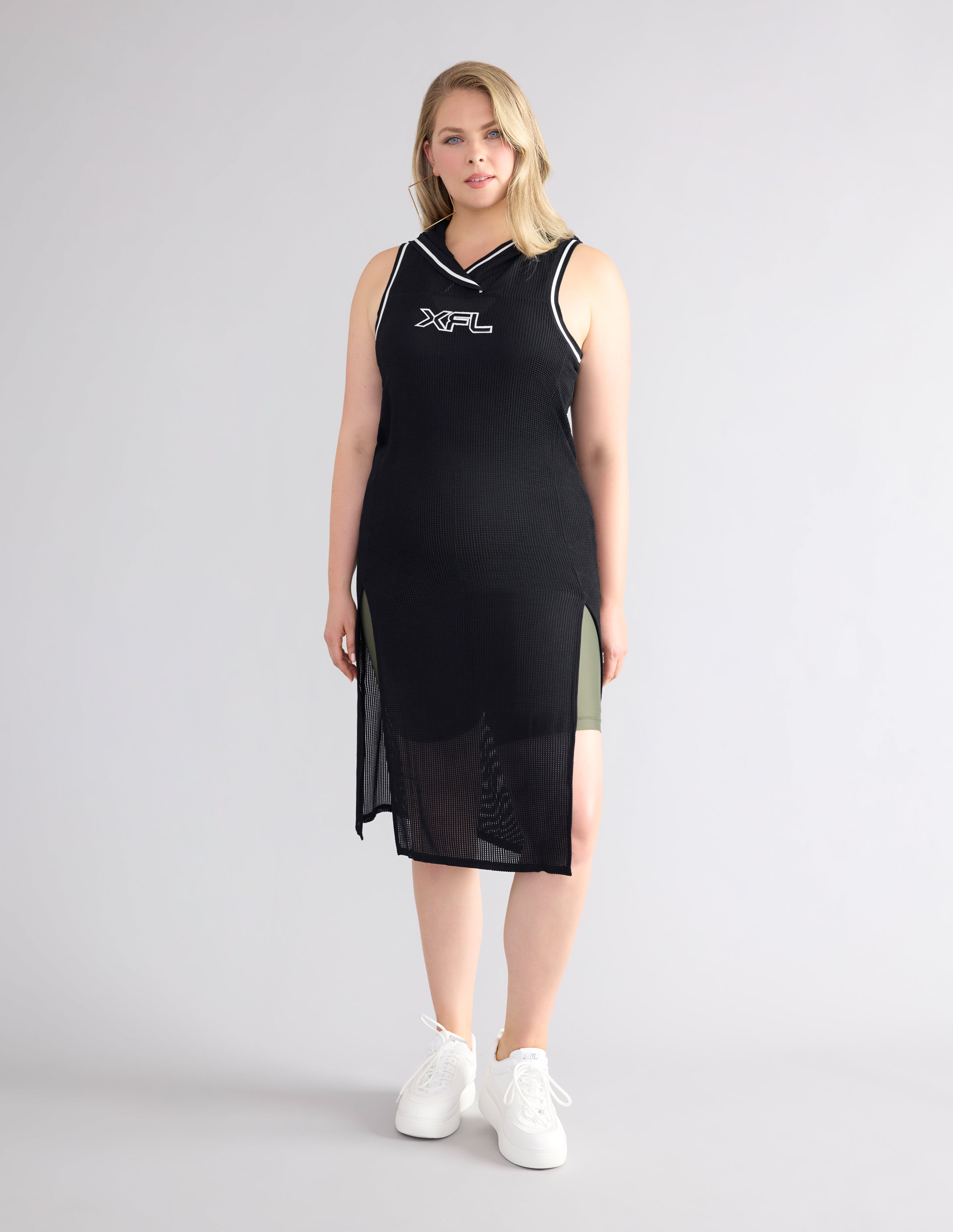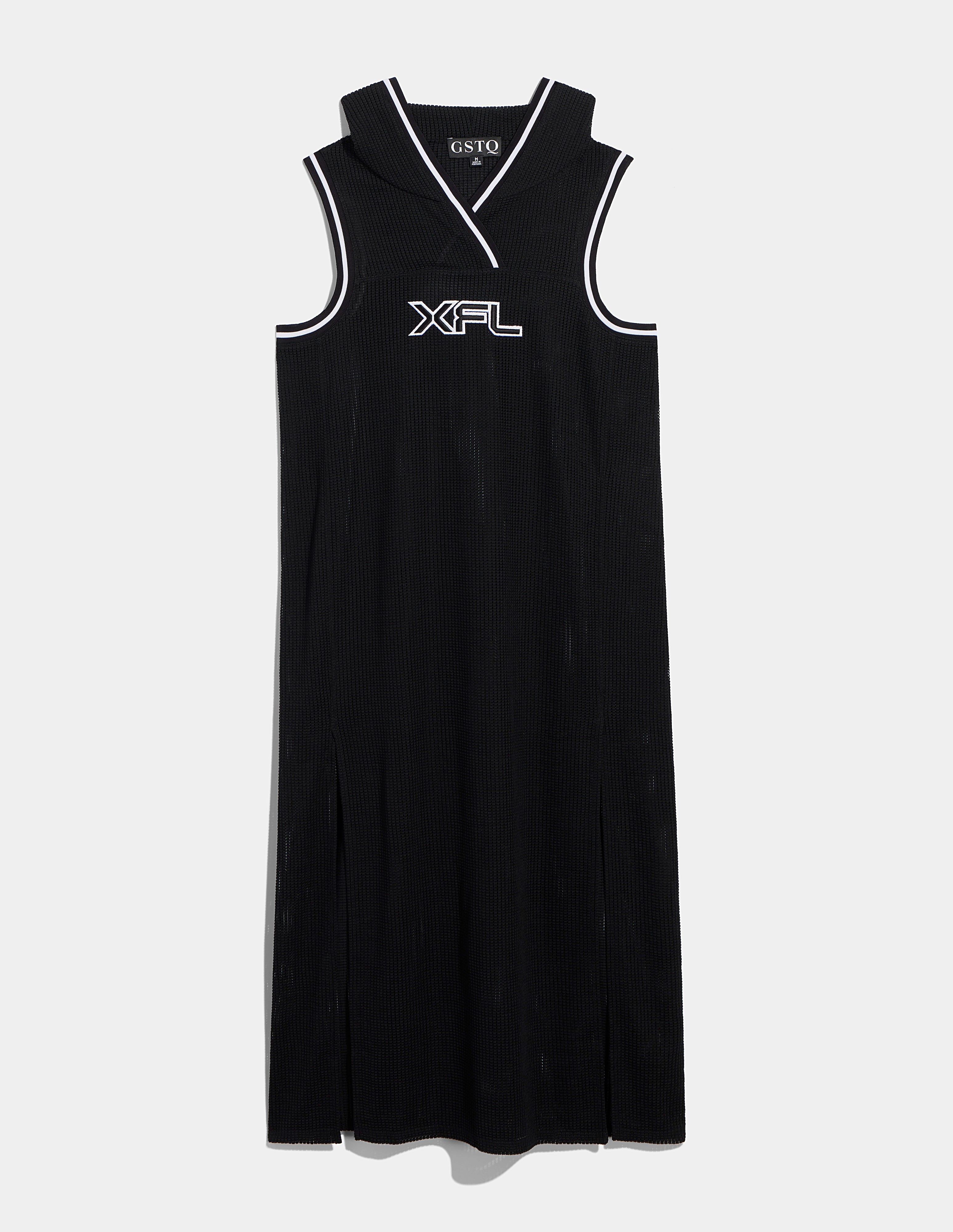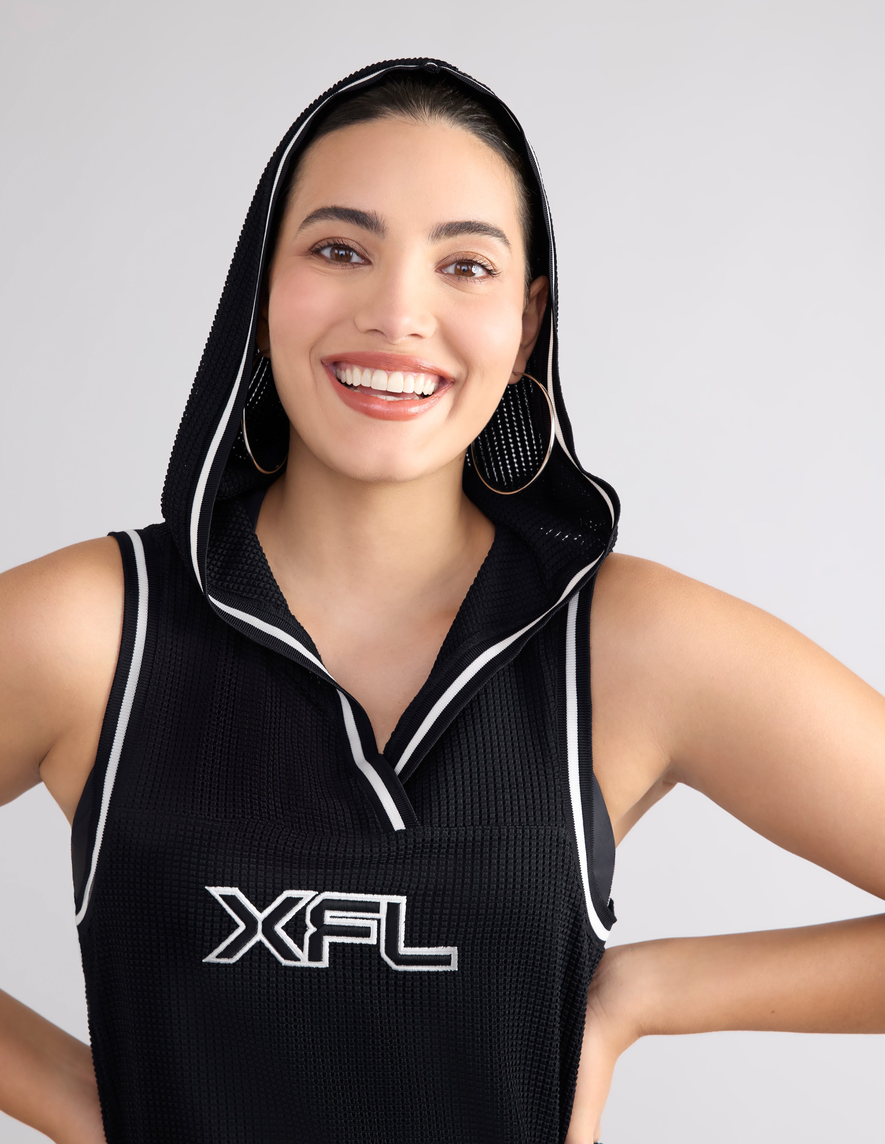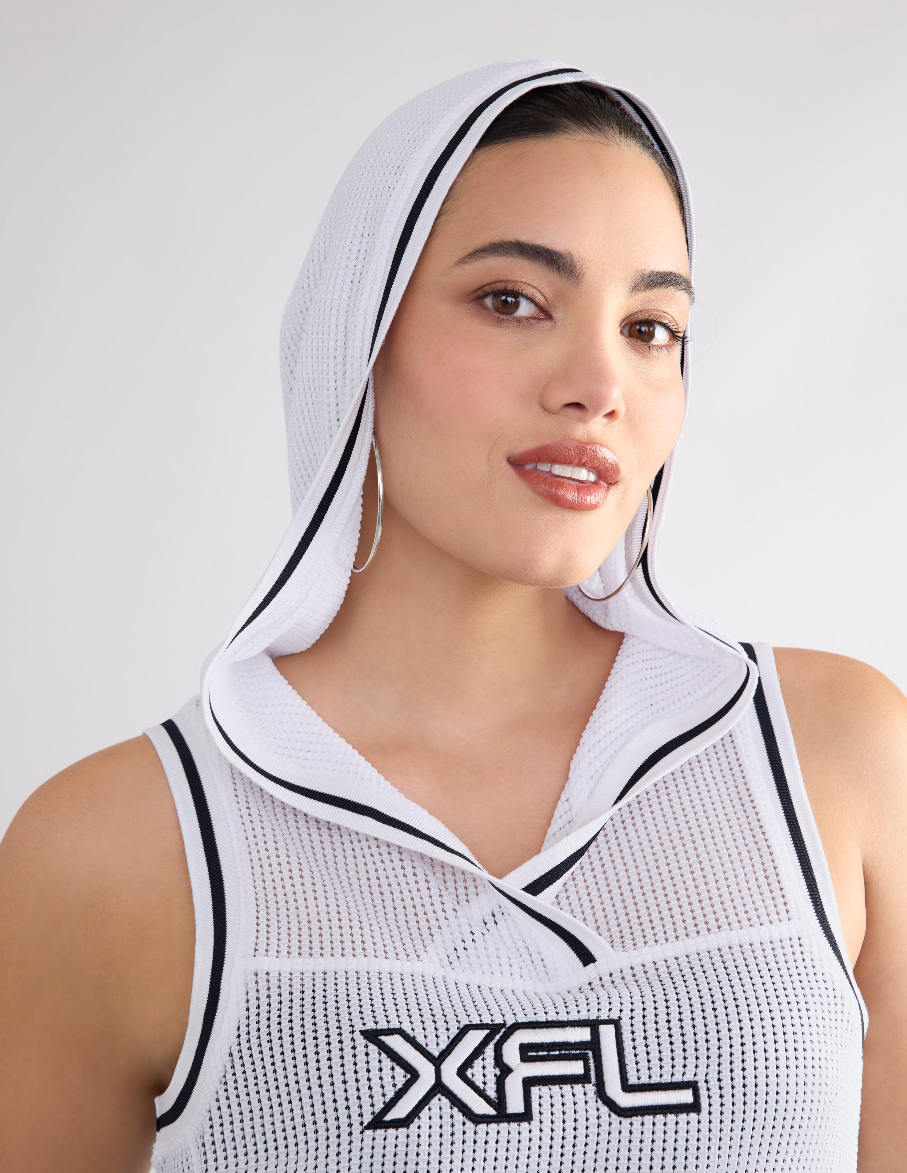 This airy, midi mesh tunic has you covered from the city to the field. It has a crossover hood, high-side slits, and ribbed detailing throughout. Part of the XFL Capsule Collection embroidered with patches made locally in New York City.