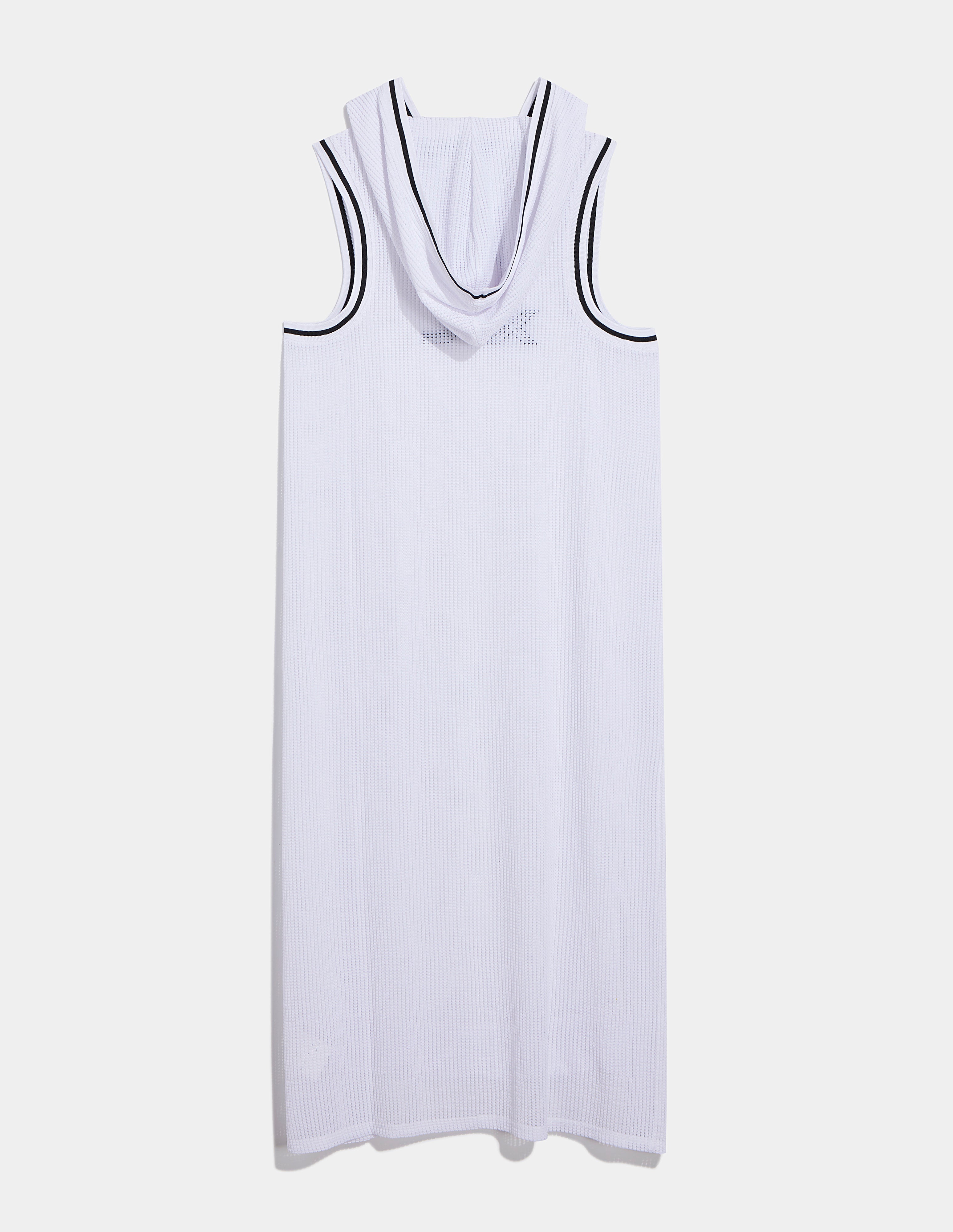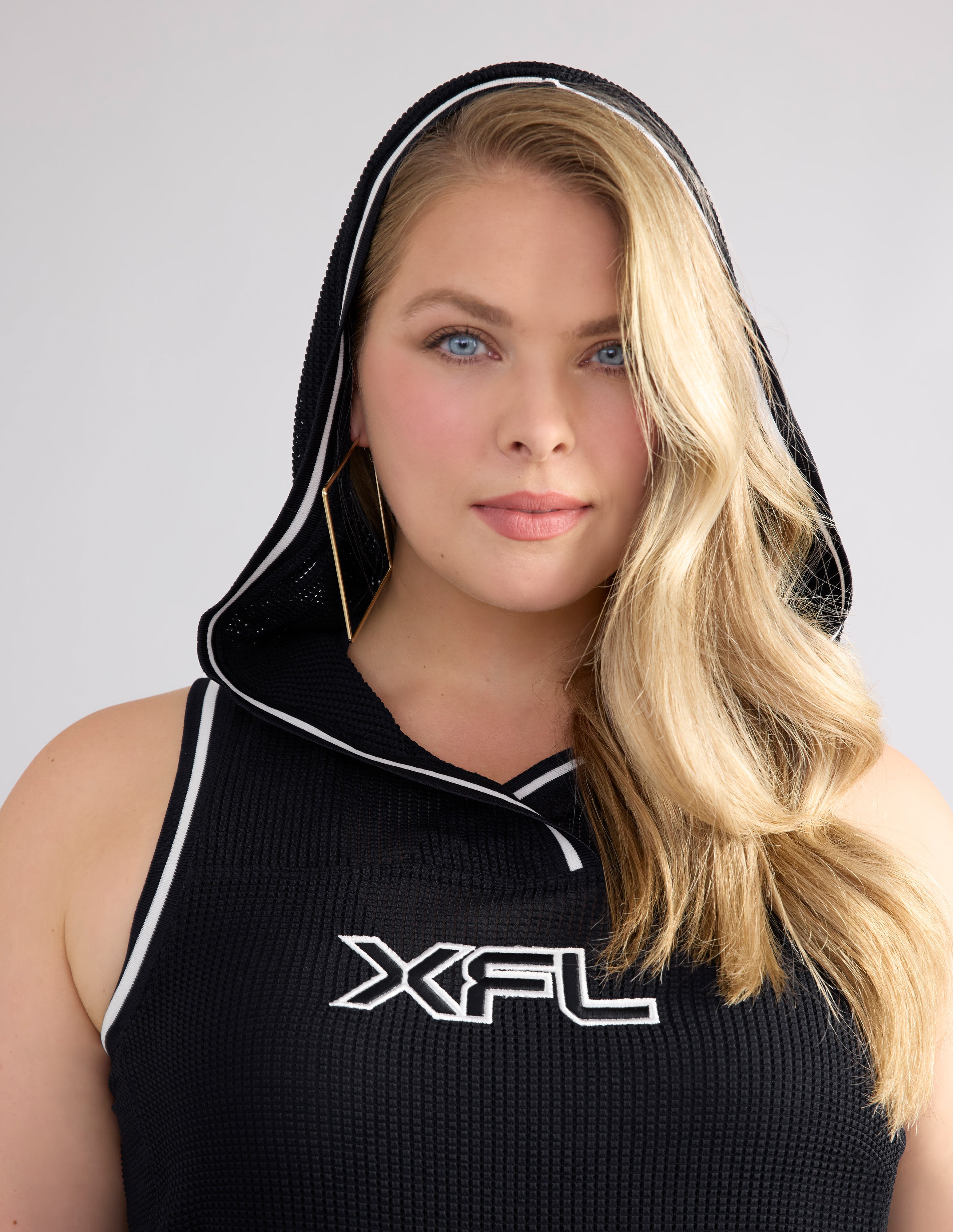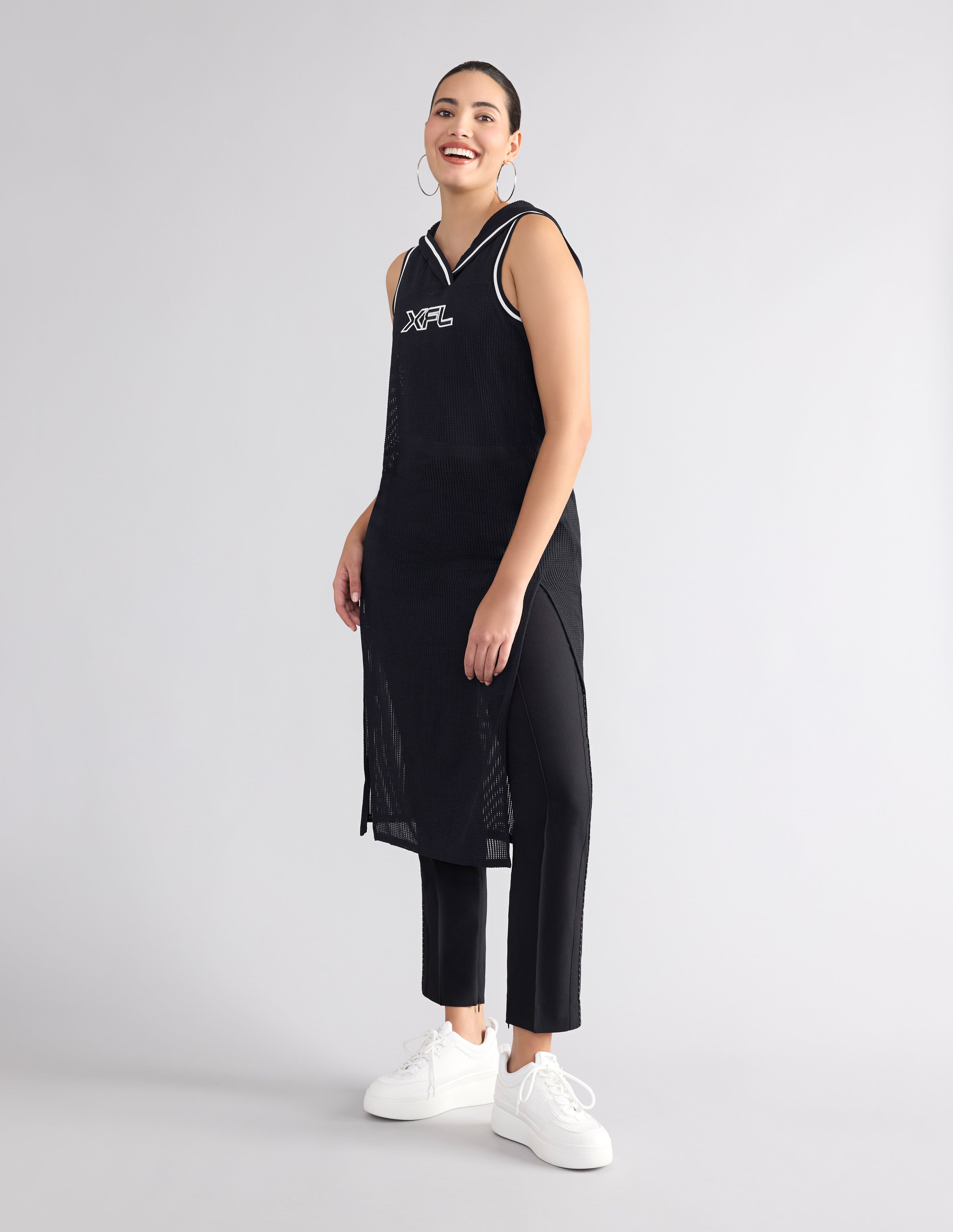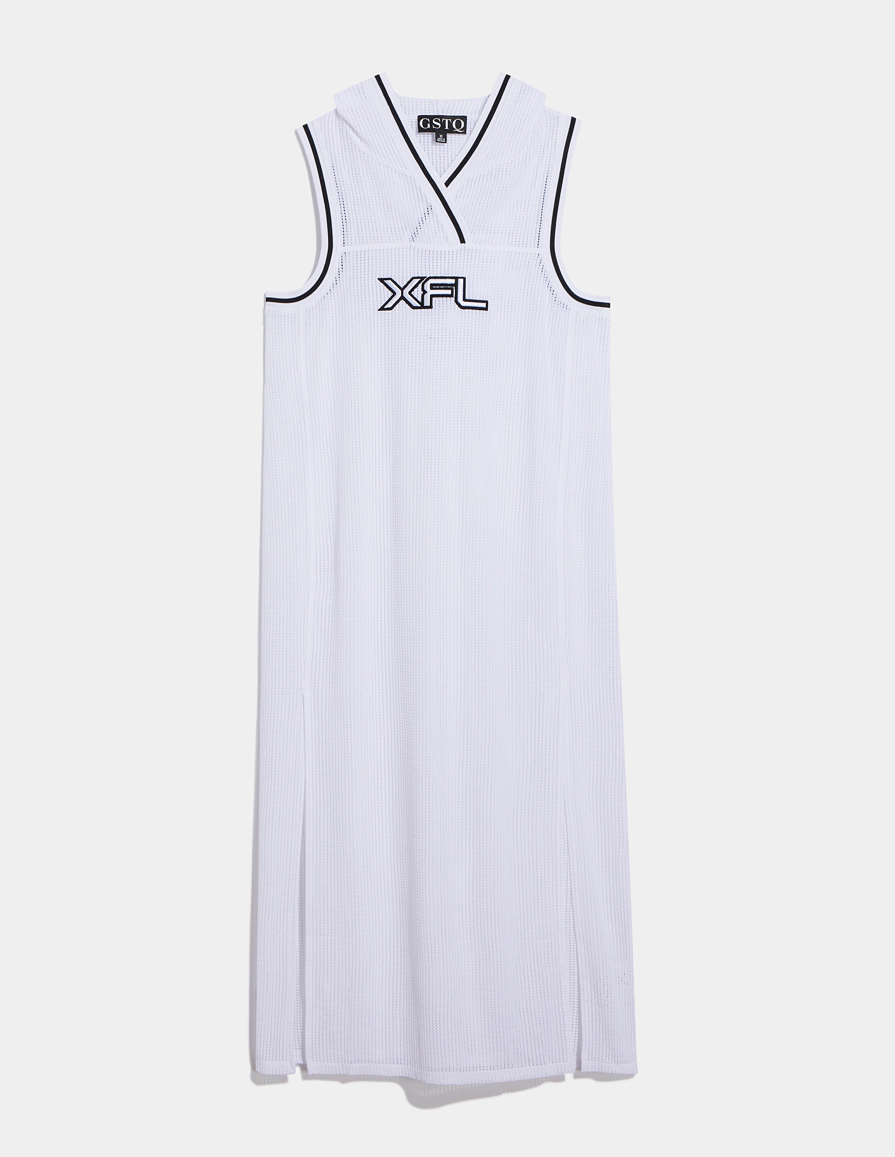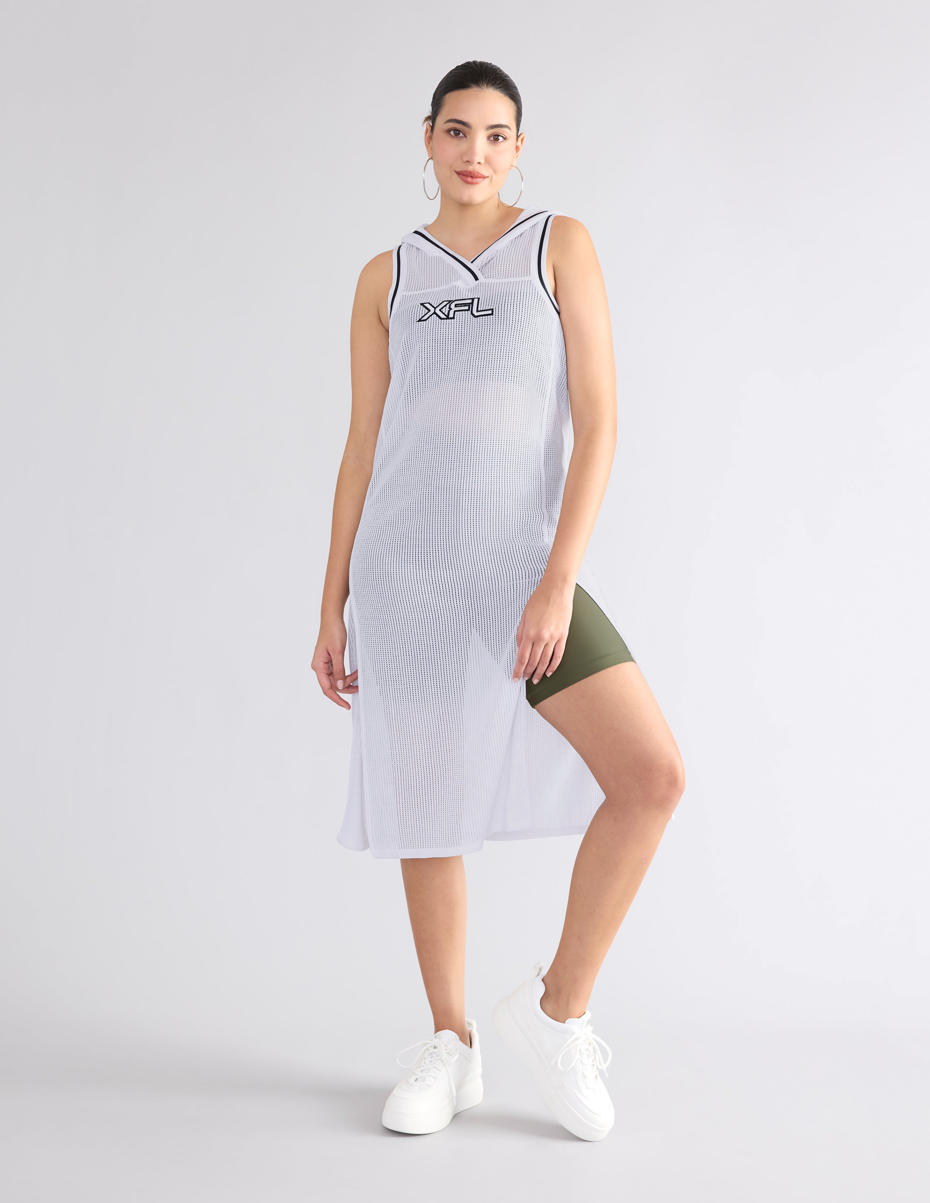 This airy, midi mesh tunic has you covered from the city to the field. It has a crossover hood, high-side slits, and ribbed detailing throughout. Part of the XFL Capsule Collection embroidered with patches made locally in New York City.