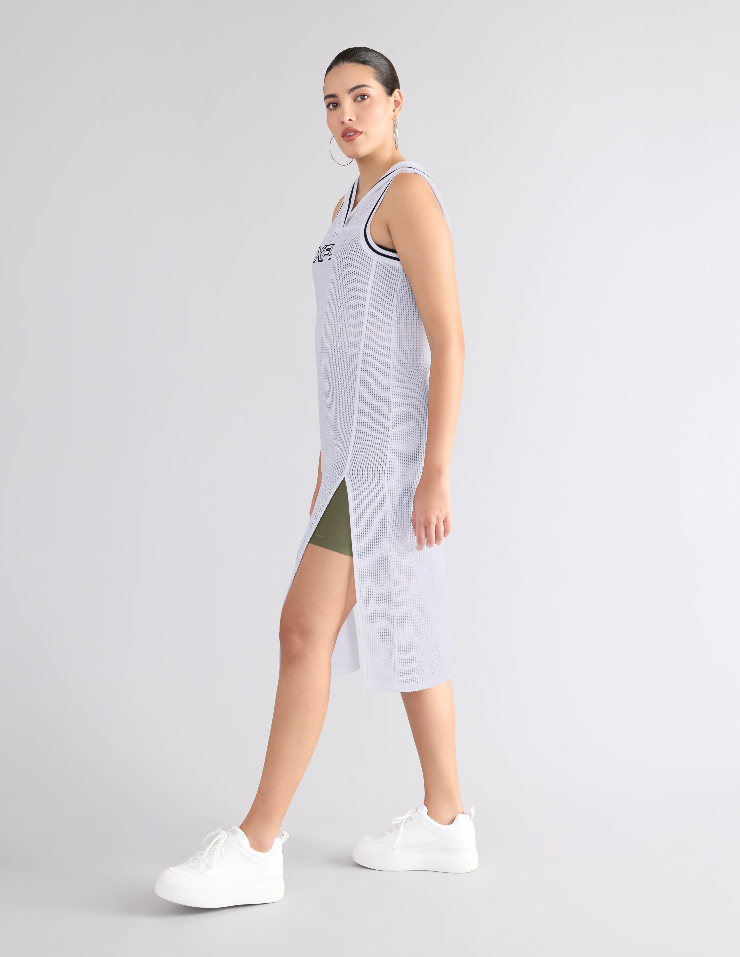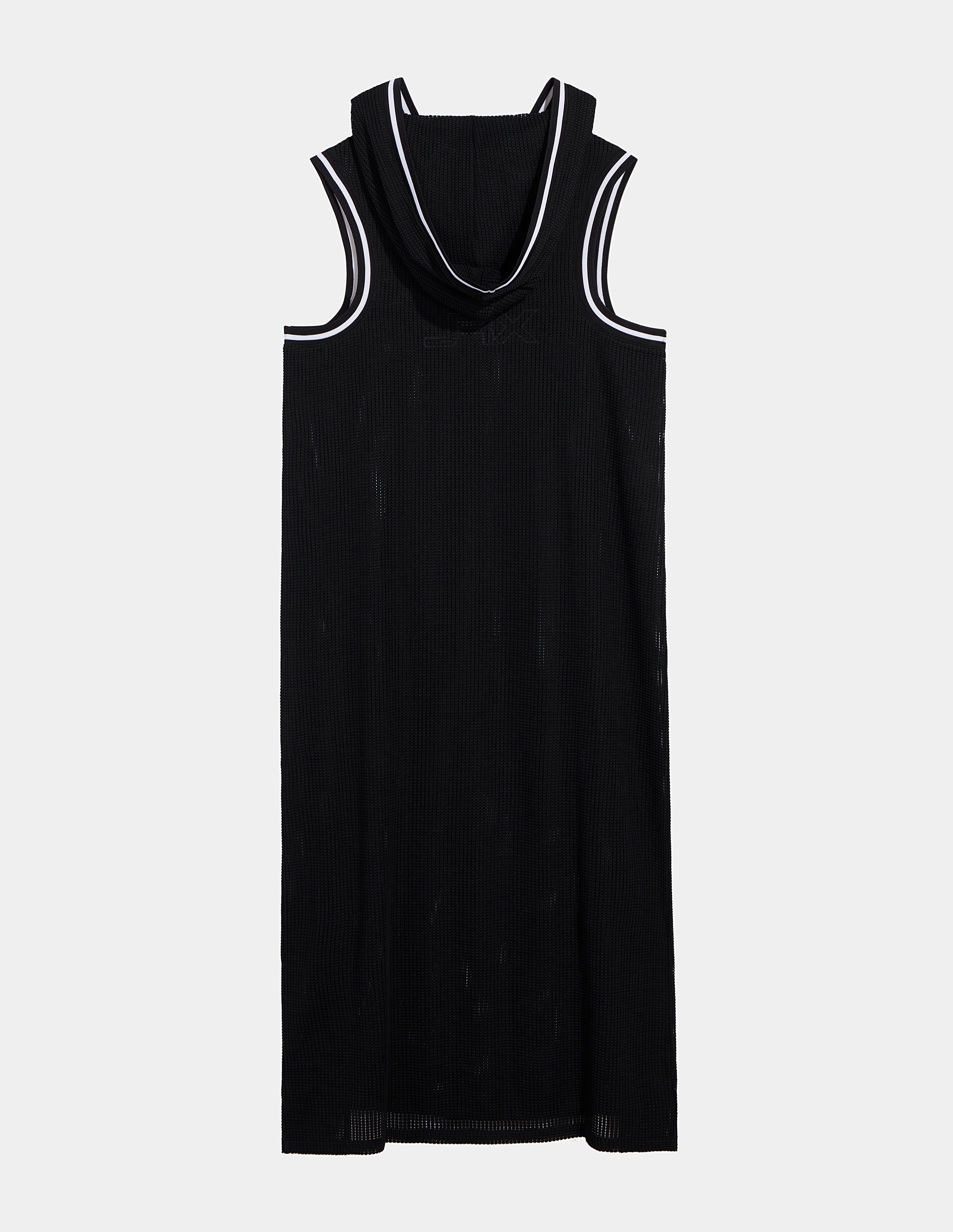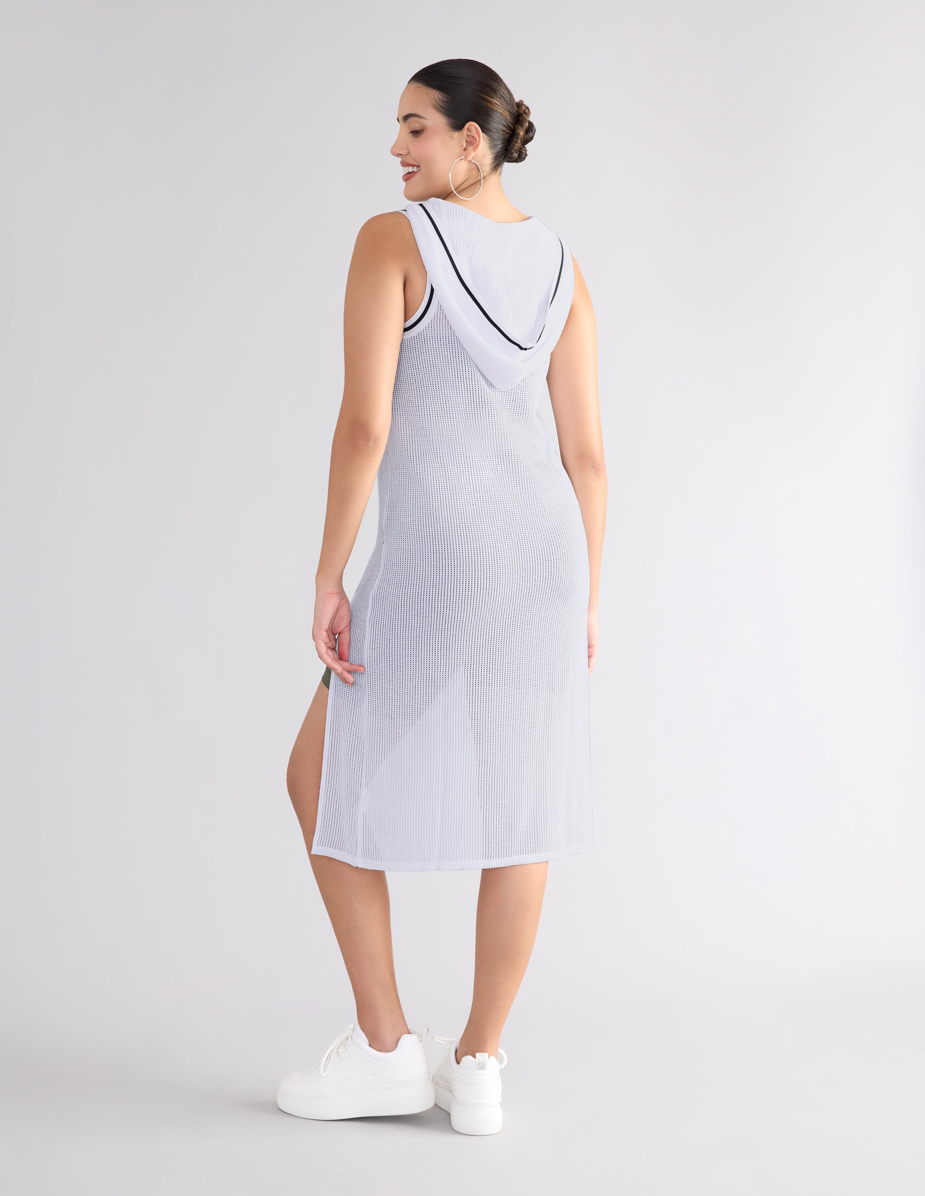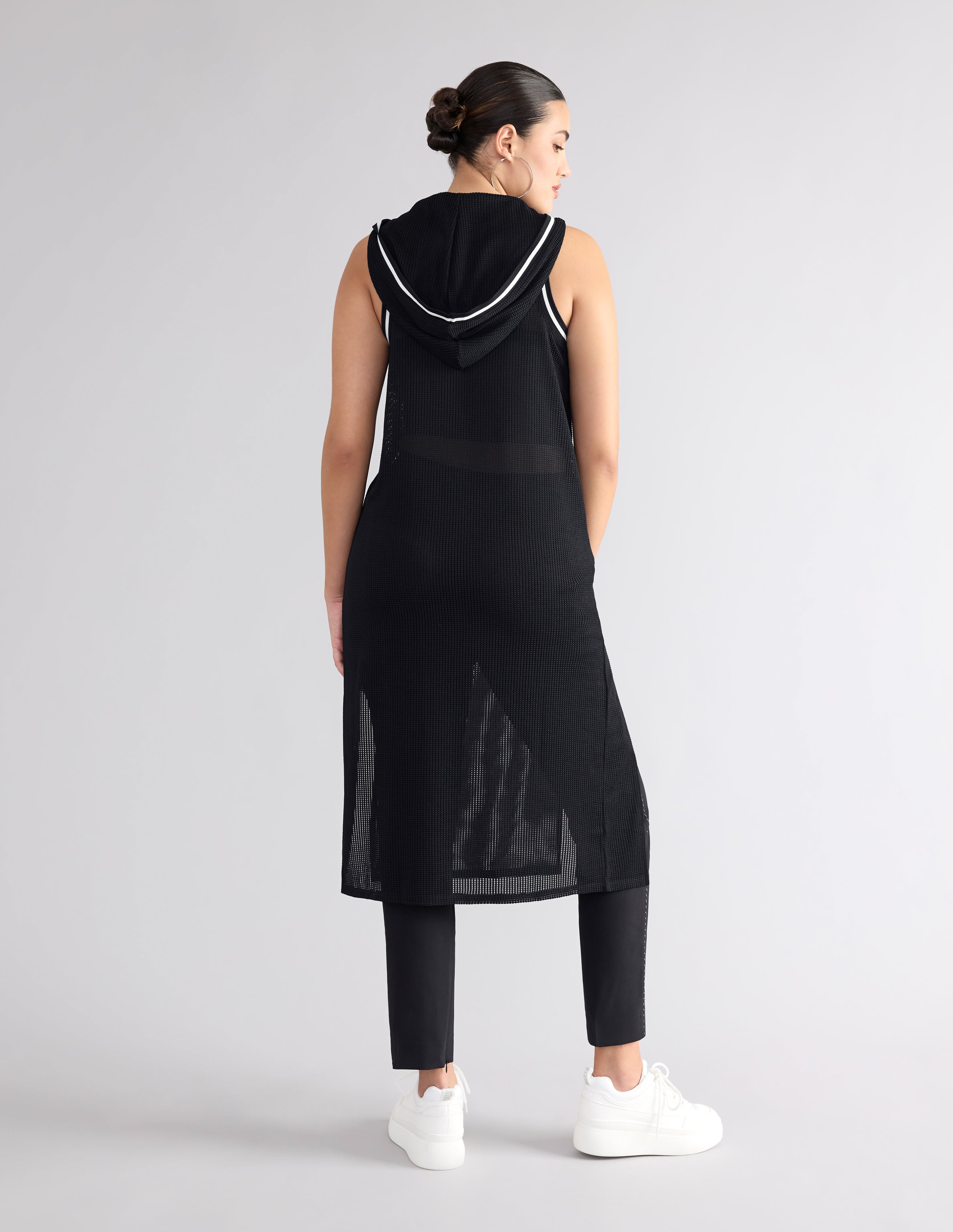 This airy, midi mesh tunic has you covered from the city to the field. It has a crossover hood, high-side slits, and ribbed detailing throughout. Part of the XFL Capsule Collection embroidered with patches made locally in New York City.